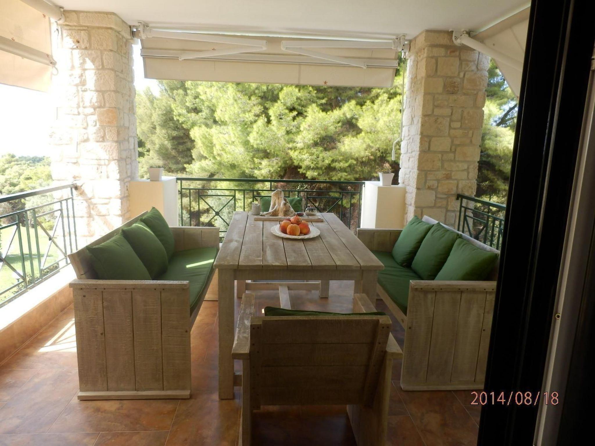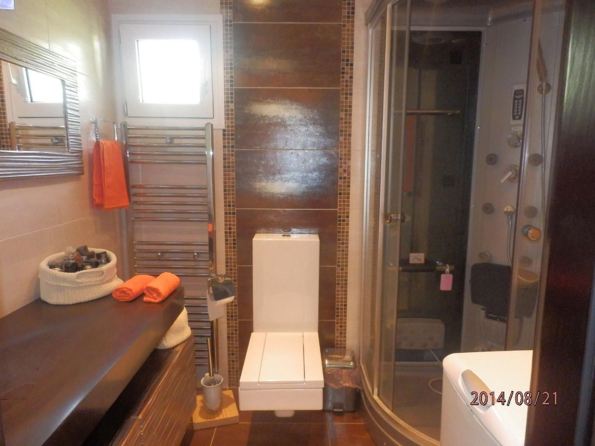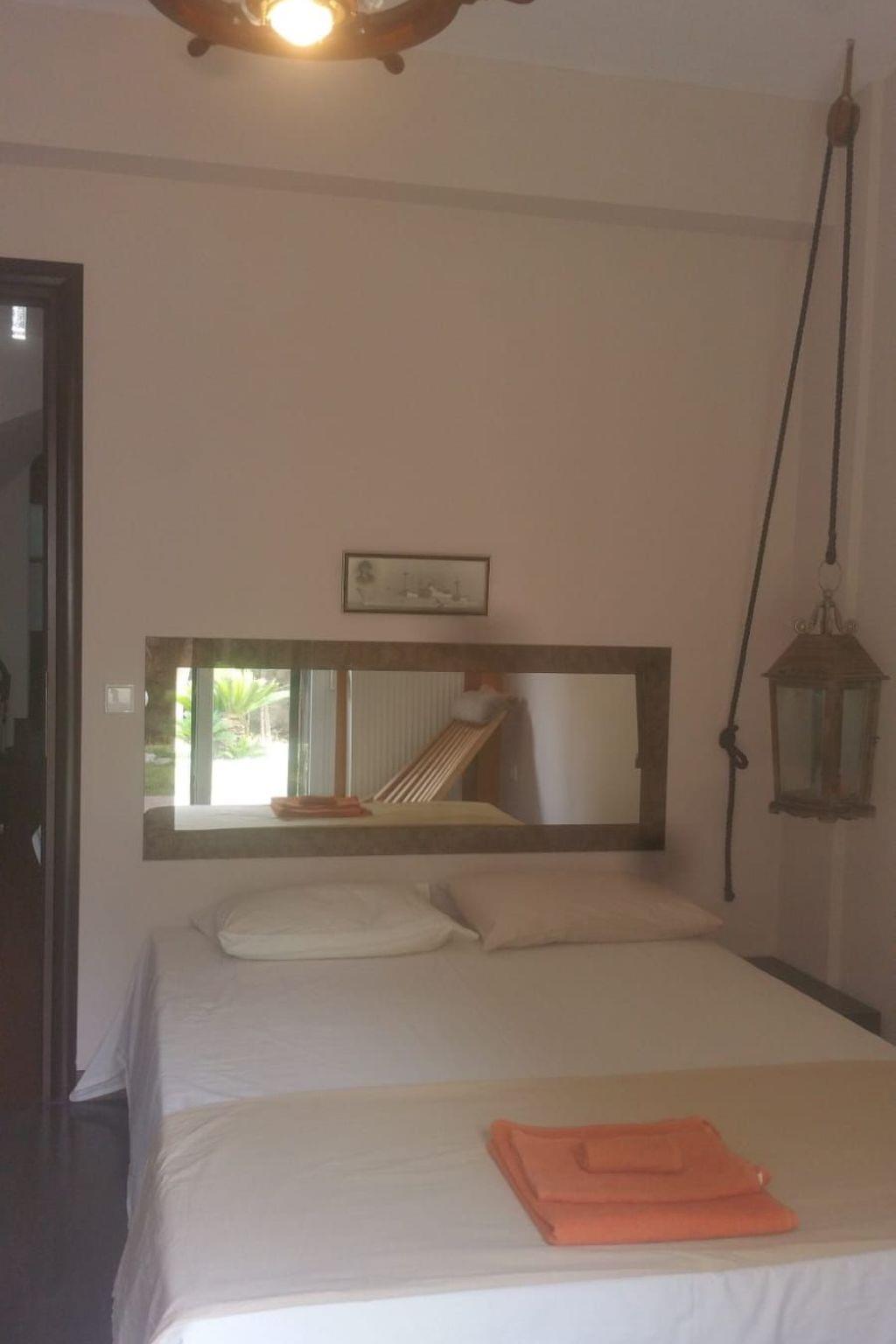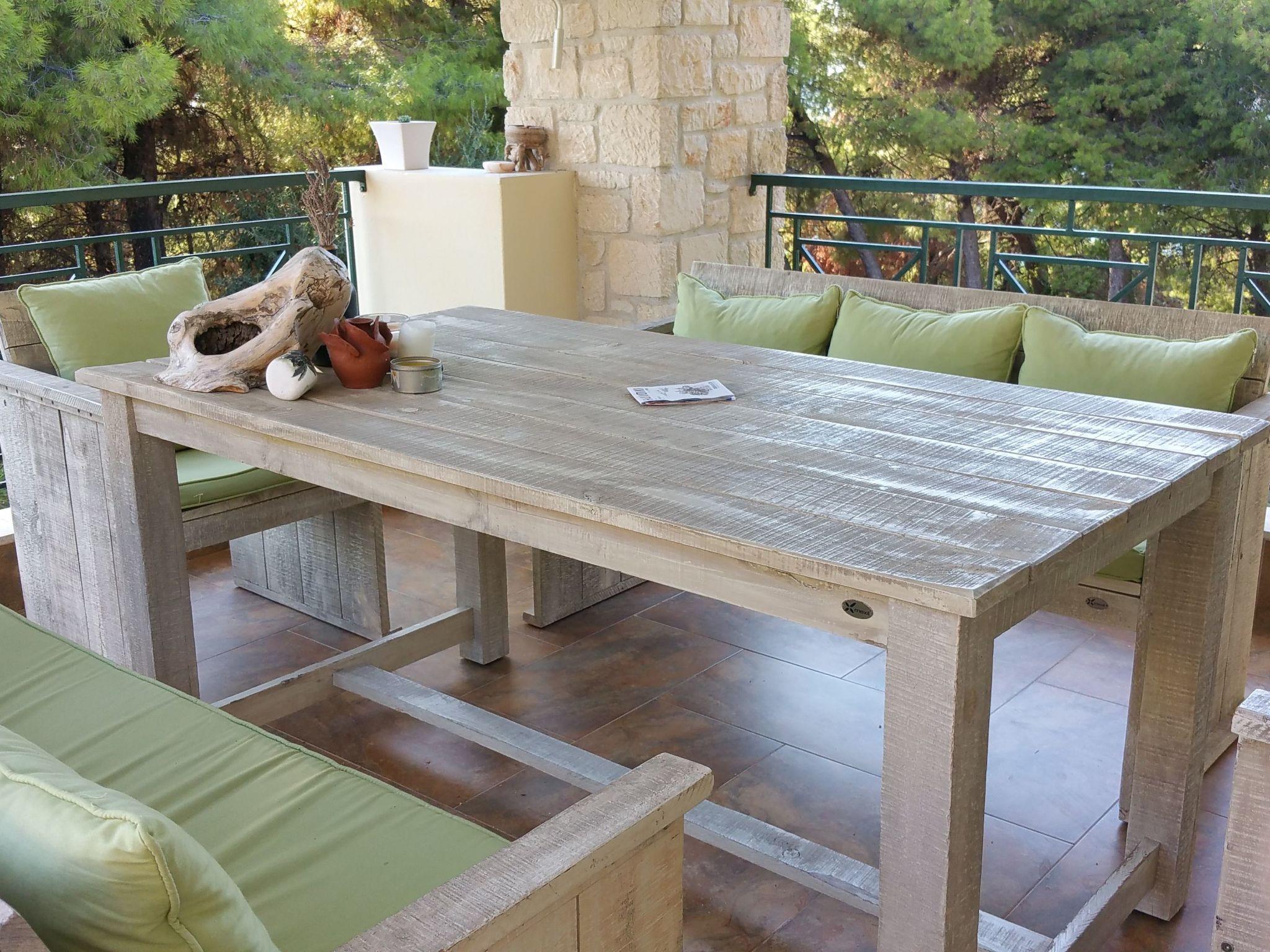 This very tasteful and comfortable holiday home is located on the outskirts of Possidi on a beautiful sandy beach. It is the end house of a row of houses and is situated directly on a small hill, surrounded by many trees of the neighbouring forest and many plants. The house is 100m² in size and has two floors. On the lower floor are the three bedrooms, which were freshly renovated in summer 2021. One of them is furnished with two single beds and a wardrobe. The other two bedrooms each have a double bed. A set of changeable bed linen is available for all beds. On this floor you will find the bathroom with WC, washbasin and a modern shower and steam cabin. Towels and a washing machine are available here. There is a small minibar with fridge in the hallway where you can store your drinks. The upper floor of the house consists of the living and kitchen area. There is a cosy leather sofa in the large living room. On cooler evenings, you can relax here in front of the fireplace. The open-plan kitchen is modernly equipped with an electric cooker (ceramic hob), oven, toaster, kettle and large fridge with freezer compartment. Four people can sit at the round table. The second bathroom with WC, washbasin and shower is located on this floor. All windows in the house are fitted with mosquito screens. The large balcony gives the house a special touch, as here you can enjoy the view of the forest all the way to the sea while smelling the conifers. There is a private barbecue and parking for up to three cars. The residential complex's pool can also be used. This is shared with 5 other holiday homes. Possidi is located on the first finger of the Halkidiki peninsula. The village has marvellous sandy beaches where you can enjoy the sunsets with an enchanting view of Olympus, the mountain of the gods. Small tavernas right on the beach, pizzerias, fast food outlets, bars, souvenir shops and a small supermarket can be reached on foot in approx. 15 minutes, the beach in 10 minutes. If you are travelling by car, you will find parking facilities everywhere. The journey from the nearest airport in Thessaloniki takes approx. 1 hour and 15 minutes by hire car.