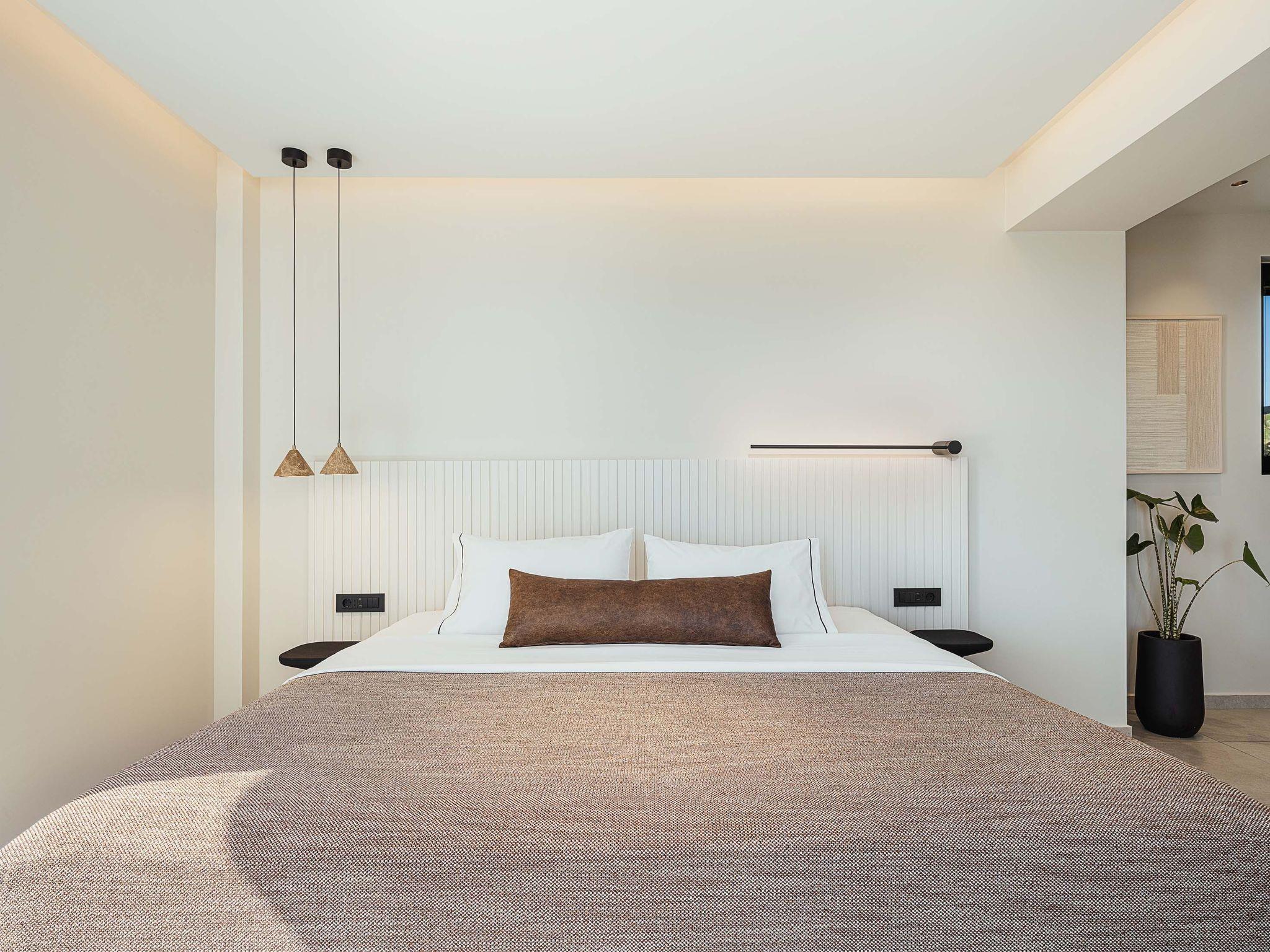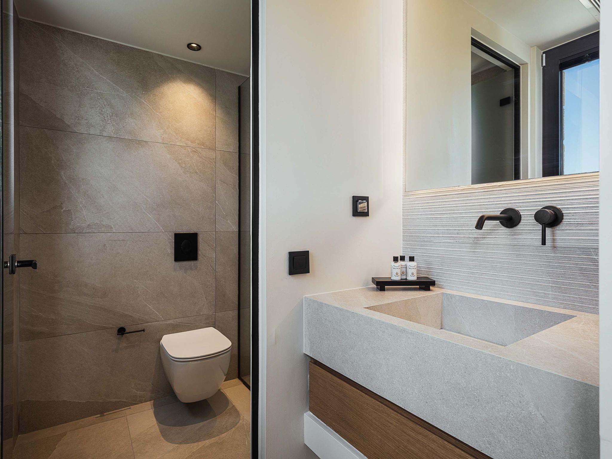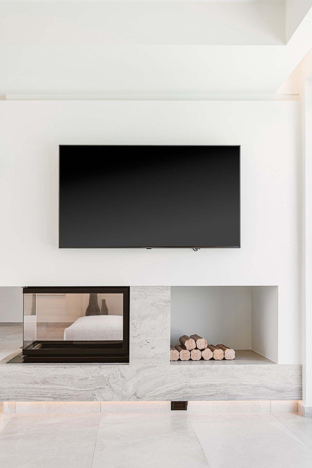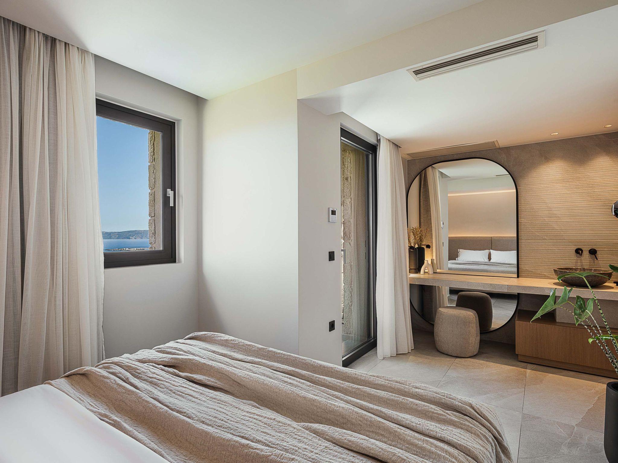 Luxury and modern design complete the scenery of contemporary architecture and high-quality products. Entering the villa on the ground floor you will find a spacious open area with a fully equipped contemporary kitchen that has branded appliances and facilities, making holiday cooking a most pleasurable experience. The area is completed with a dining room and a living room with a 55’’ smart Satellite TV and a fireplace. The large windows create the illusion of transparency and provide a seamless transition between the indoor and outdoor areas.