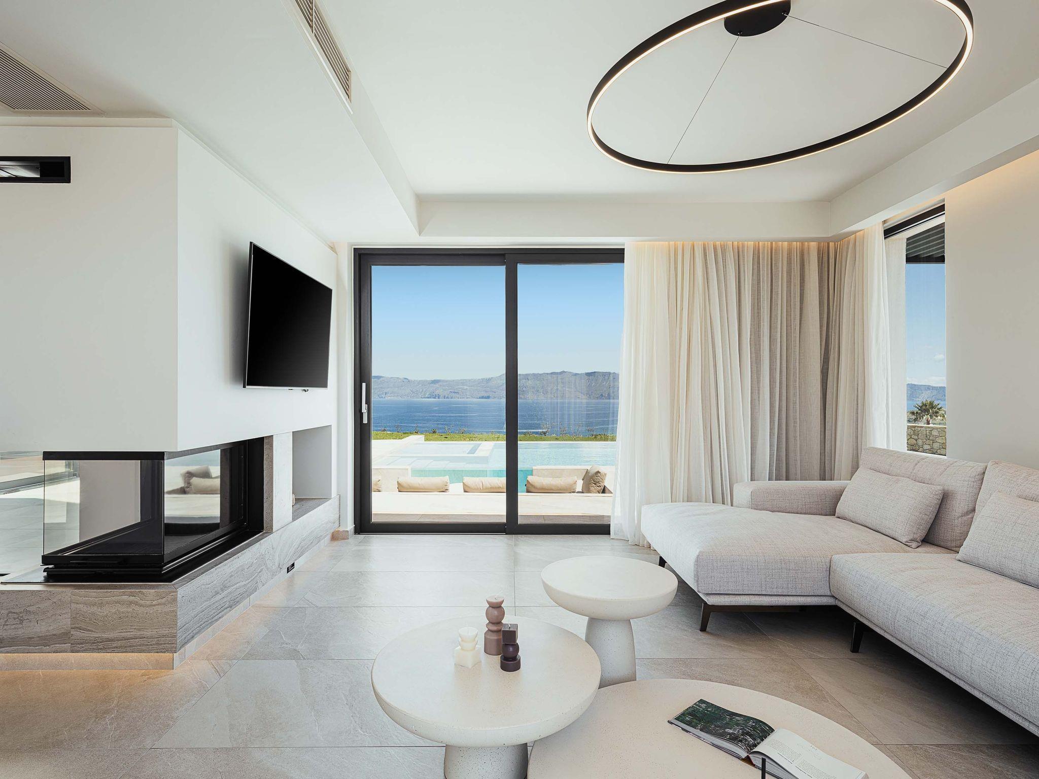 Living area with sofa, 55’’ satellite Smart TV, Bluetooth speaker, board games, fireplace, access to the pool terrace, sea view