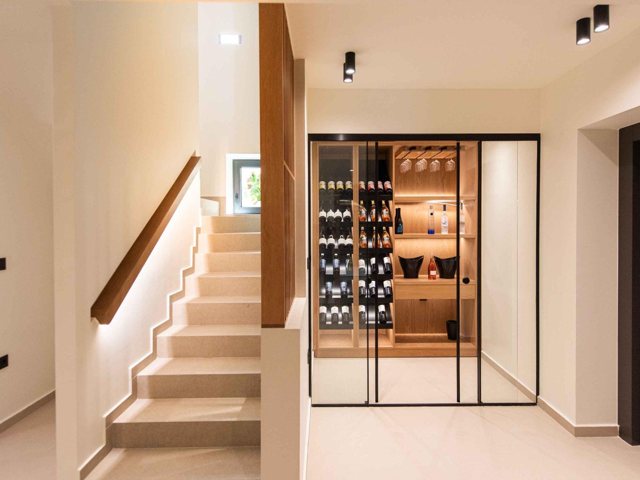 Casa di Franco is a three-story villa consisting of 7 bedrooms, one of them with bunk beds. On the lower floor, you will find a room adequate for people with disabilities with an ensuite bathroom and bunk beds for 4 persons. In the same area, you will find a gym and a Hamam. Four bedrooms are situated on the first floor, three with single beds that can be converted into double ones, and one with a king-size bed. Entering the villa on the ground floor you will find a spacious open area with a fantastically-equipped kitchen for foodies. The area is completed with a dining and a living room with a big flat-screen smart TV with satellite channels and a projector and a PlayStation Console and a bedroom with a king-size bed and a communal bathroom. Luxury and modern design complete the scenery of contemporary architecture and high-quality products. The neutral palette used here creates the perfect scenery for a serene getaway from the fast pace of life making your stay unforgettable. Sink into the sofa with a good book, or gather your group in the cozy dining area for an evening together. Natural light illuminates the interior, spend the night sipping on wine while having some quality and relaxing time with your loved ones. The best part of this villa is the wine cellar on the lower floor, adequate for connoisseurs and discerning wine lovers. After all, is there any present more elegant and distinguished than a relaxing evening by the fireplace with a glass of fine wine under the starlight? You can get to the lower floor via the elevator.