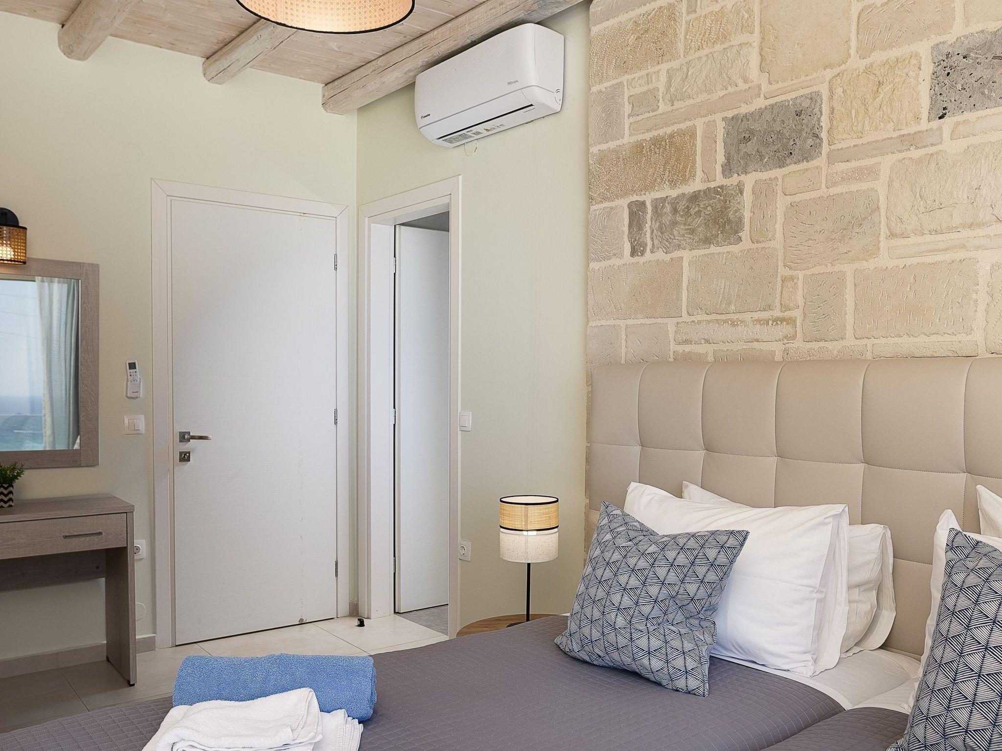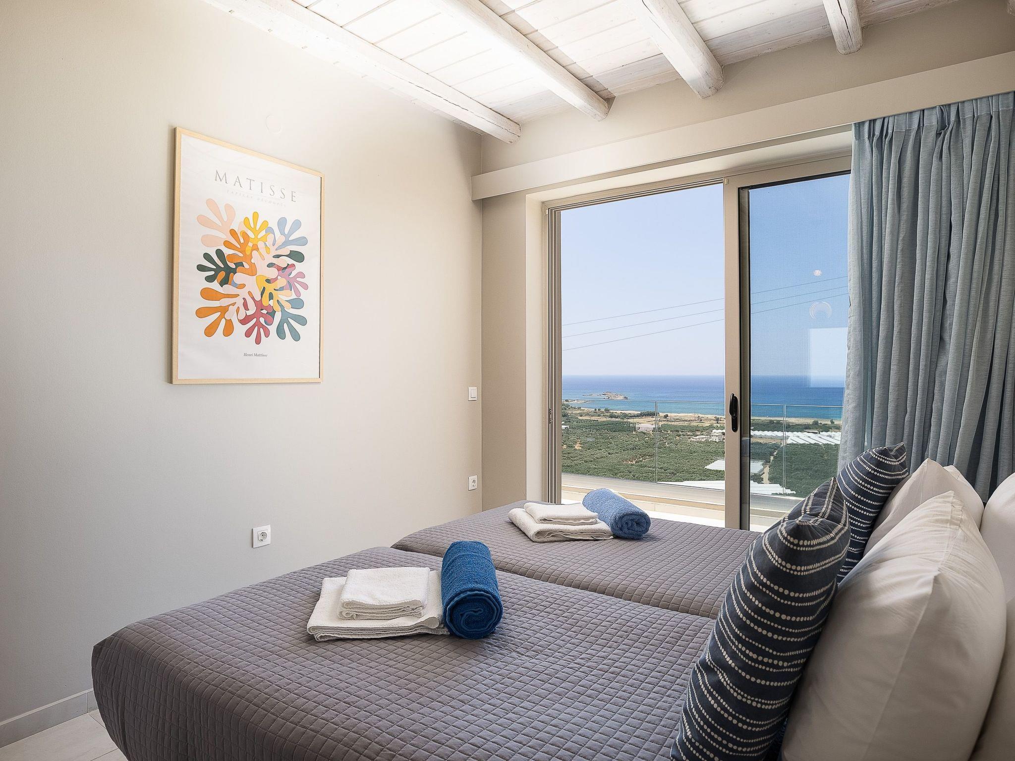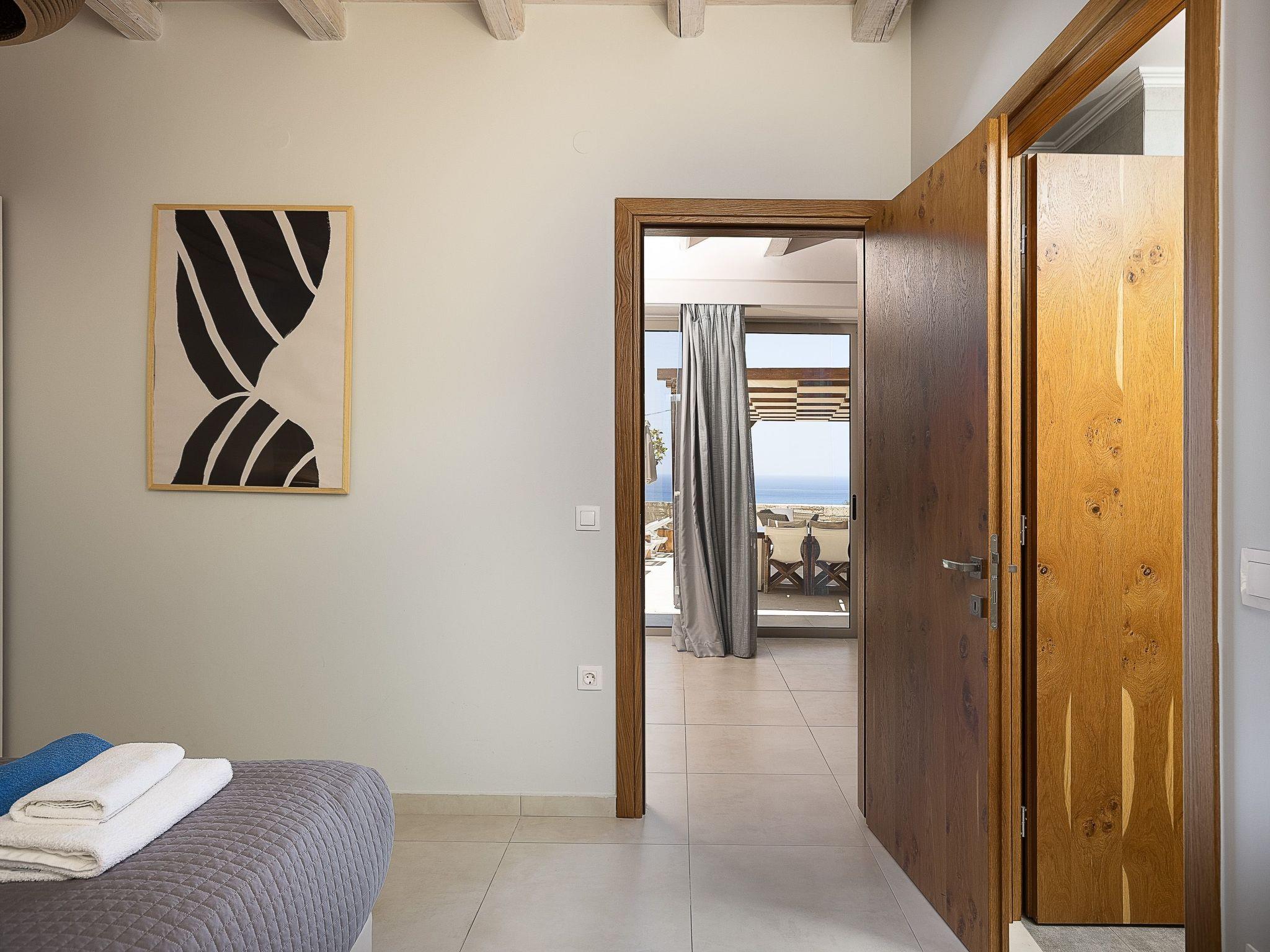 Step inside Villa Elpida, finding a stylish interior that matches the enchanting surrounding of the area. Minimal yet ultimately comfortable, the main living room features large windows gazing at outstanding views of the natural landscape and the Mediterranean Sea. The kitchen is equipped with modern electrical appliances. Five spacious bedrooms with ensuite bathrooms are comfortably dominated by the two floors offering moments of serenity and privacy for all its guests. One bedroom with a double size bed is located on the ground floor with an ensuite bathroom with a shower. The rest bedrooms are located on the first floor two with double-size beds and two with twin-size beds with ensuite bathrooms and a balcony with a sea view.
