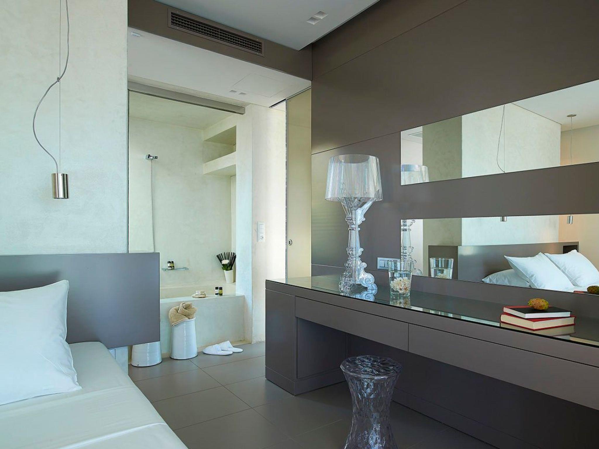 The villa’s exterior is a testament to the luxury of Cretan outdoor living. A natural stone terrace fronts the property, leading to a private infinity pool with the enchanting Cimentogonia surface and full-width Roman steps. The pool area, manageable with a Pool Heat Pump and a provided pool cover, makes for a perfect setting to relax at approximately 28°C, depending on the weather. Complete with outdoor dining and a barbecue, guests can enjoy alfresco meals while surrounded by mature gardens that guarantee privacy and tranquility.