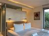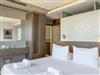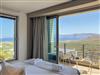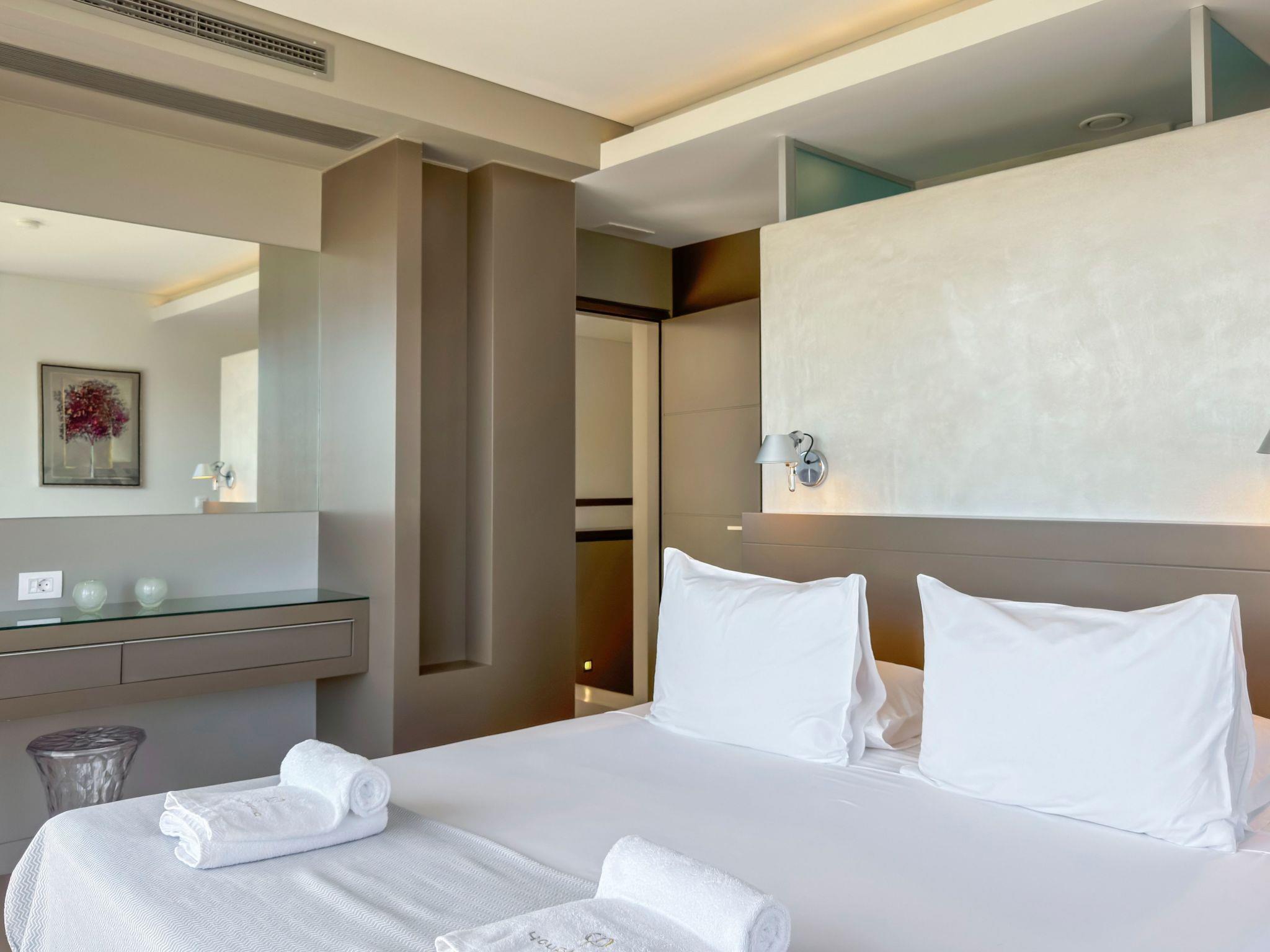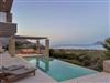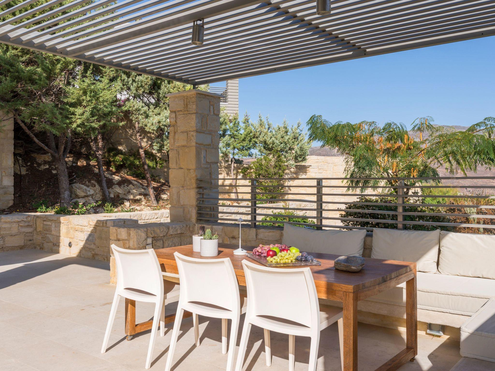 Step outside to discover an oasis in the expansive natural stone terrace, boasting a private infinity pool with breathtaking views stretching towards the Gramvousa and Spatha peninsulas. The Roman steps lead you into the refreshing embrace of the pool, offering a unique spot for relaxation. Surrounding this aquatic paradise, the pergola-shaded lounge and dining area invite you to savor moments of bliss, amidst a garden of endemic shrubs, flowers, and trees—carefully selected to enhance the natural beauty of the villa’s surroundings.