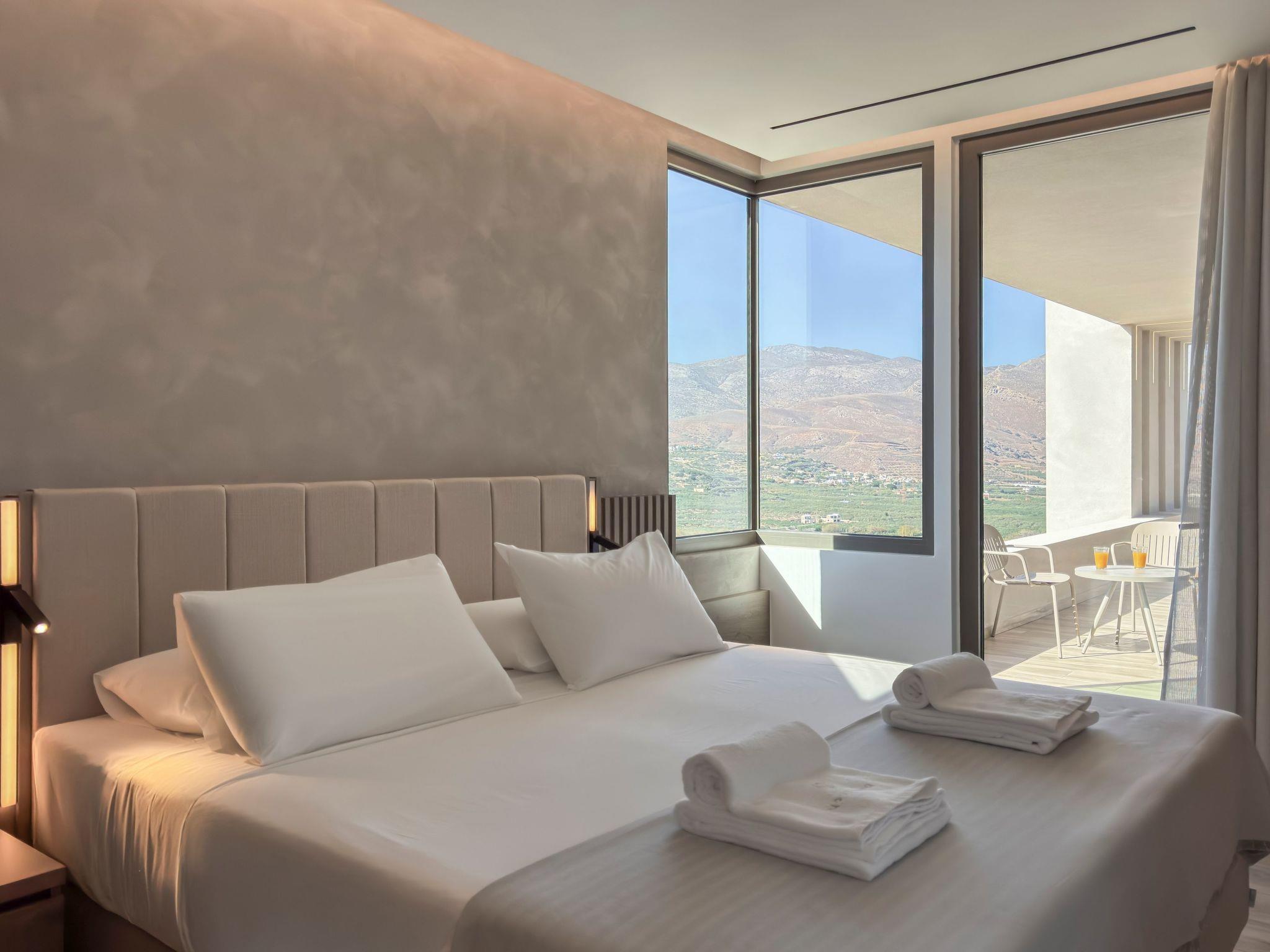 The interior of Majestic is crafted for royalty, boasting a sophisticated open-plan kitchen equipped with modern appliances, extensive work surfaces, and a breakfast bar. This is seamlessly integrated with a dining area and a lounge, offering plush seating centered around an eco-friendly fireplace. Accessibility is considered with a ground-floor bedroom designed for wheelchair users. The upper-floor bedrooms bathe in natural sunlight, enhancing the serene view of olive groves stretching towards the alluring Bay of Kissamos, and each room comes with an en-suite bathroom and veranda access, perfect for private moments of relaxation.