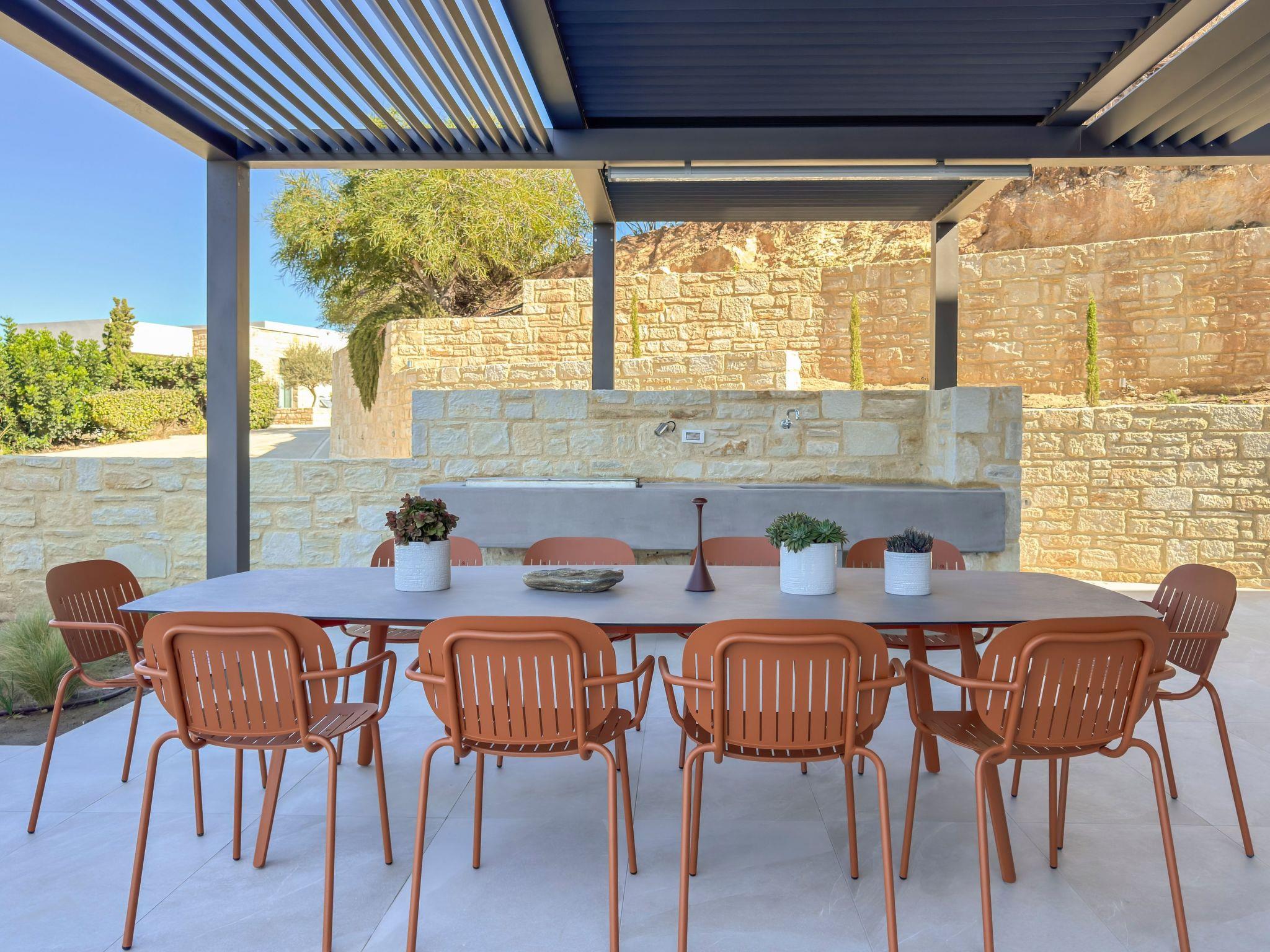 Stepping outside, the villa unveils a splendid 50 square meter pool set within a meticulously landscaped garden adorned with native shrubs, flowers, and trees. The outdoor area is designed for utmost relaxation and entertainment, featuring sunbeds, poolside mattresses, and sofas for lounging under the sun or stars. A pergola with an outdoor dining table invites guests to dine al fresco, next to a BBQ area ideal for culinary exploits with the region's freshest produce, offering a picturesque backdrop of the Aegean panorama.