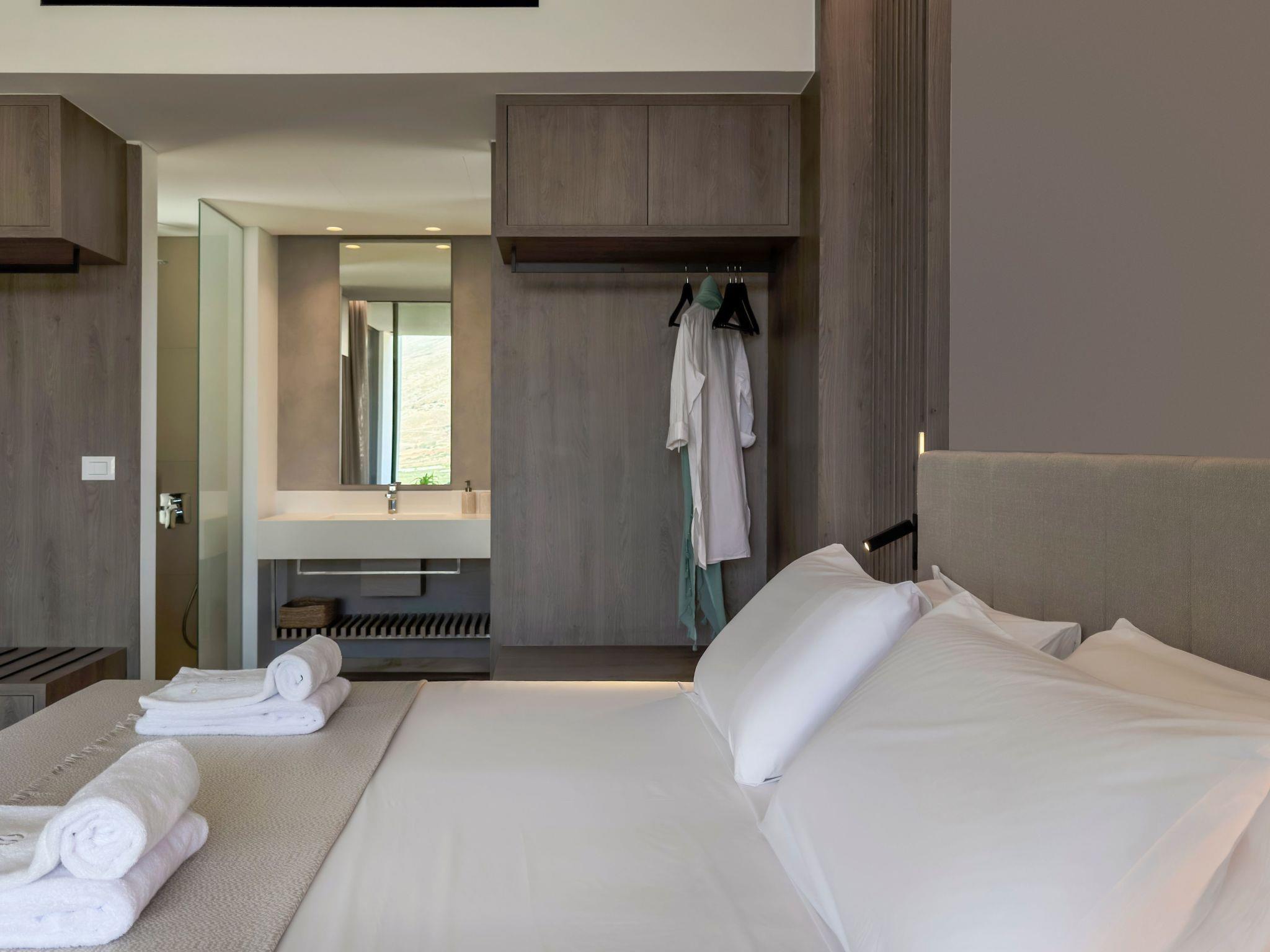 The interior of Utopia exudes contemporary elegance with a large open-plan kitchen furnished with practical appliances and ample work surfaces, adjoining a dining area and lounge centered around an eco-friendly fireplace. Each of the villa's up to 10 guests is treated to sublime comfort, with every bedroom presenting an en-suite bathroom with shower. The rooms are designed to maximize the breathtaking views of the sea and mountains, with each featuring a terrace overlooking the Aegean, merging the beauty of the interior with the enchanting outdoor vista.