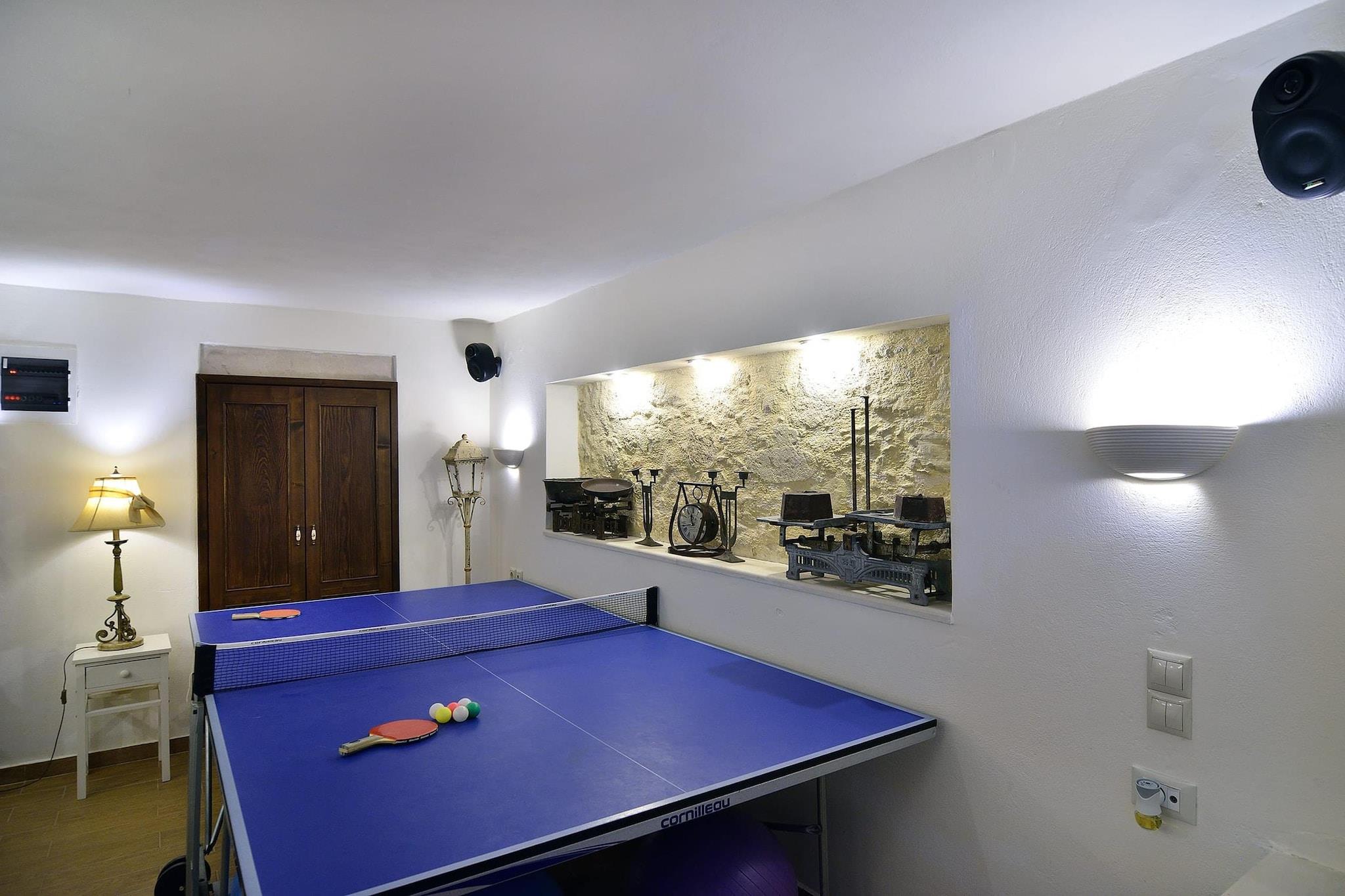 Køkken(elkedel, espressomaskine, opvaskemaskine , (), ()), stue / spisestue(Fjernsyn(Smart-TV), spisebord, sofahjørne, DVD-afspiller, radio, CD-afspiller), soveværelse(enkeltseng), soveværelse(dobbeltseng), soveværelse(dobbeltseng), soveværelse(dobbeltseng), badeværelse(bruser, håndvask, toilet), badeværelse(bruser, håndvask, toilet), badeværelse(bruser, håndvask, toilet), bibliotek, fitnessrum, Internetadgang, Indendørs legerum, pejs, tørretumbler, tremmeseng, bruser(udendørs), vaskemaskine, varme(central), klimaanlæg, have, havemøbler, solstole, grill, parkering, Parasol, swimmingpool(privat, opvarmet), bordtennisbord, barnestol, strygebræt, strygejern, føntørrer