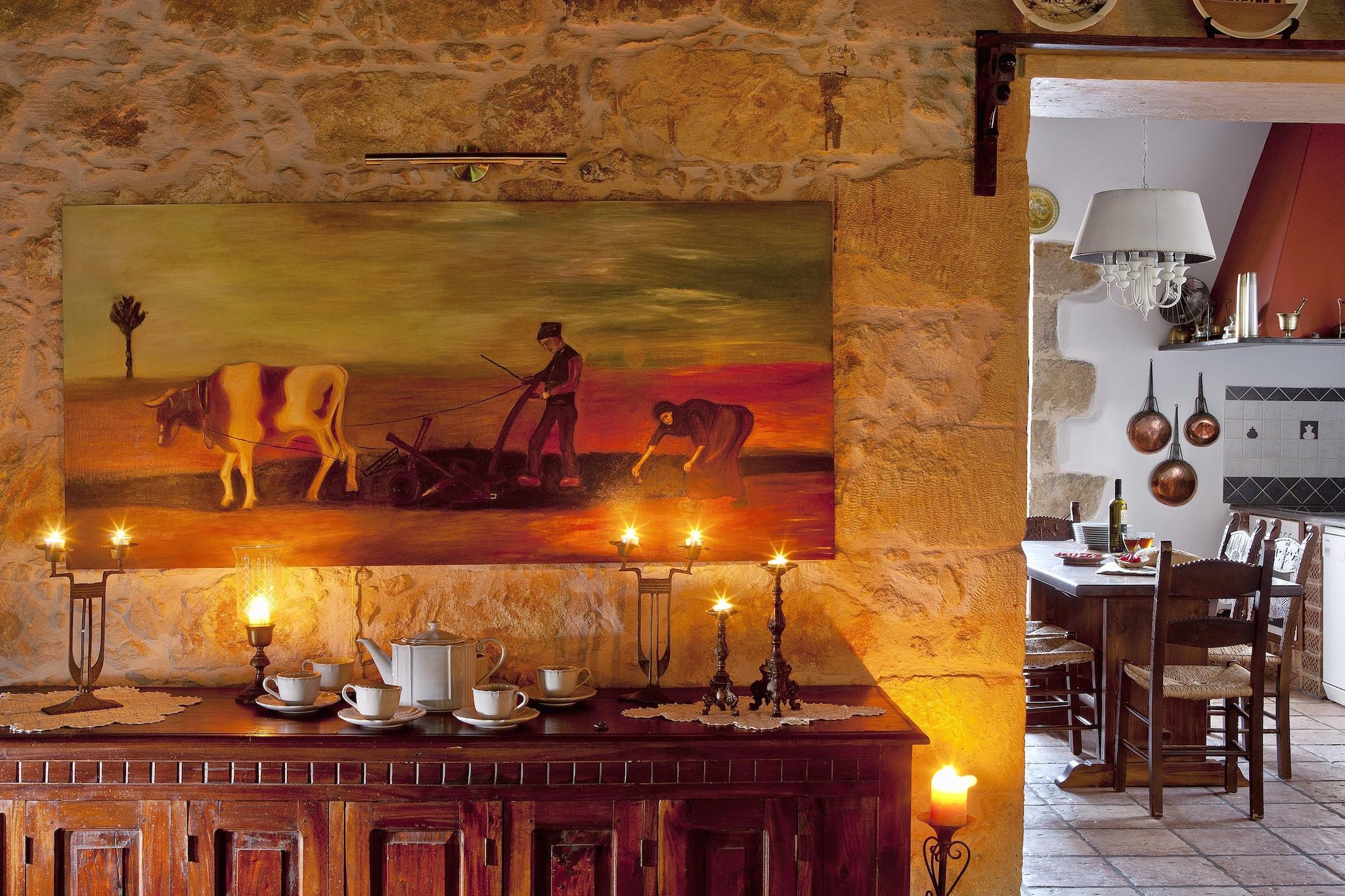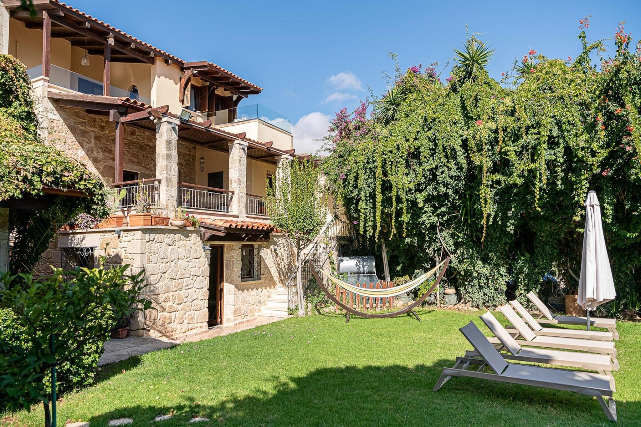 Forestil dig et sted, hvor citrontræer, bougainvillea og havbrise møder stenvægge, trælofter og en privat pool under åben himmel - det er følelsen af Villa Arhontariki på Kissamos Luxury Villas. Beliggende i den fredelige landsby Kalyviani, inviterer dette sted en gruppe venner eller en stor familie til at dele en blanding af komfort, plads og Kretas tidløse charme. Når du træder indenfor, finder du et varmt og indbydende hjem, der er omhyggeligt møbleret, hvor hvert rum flyder over i fællesområder, der opfordrer til samvær. Villa Arhontariki strækker sig over tre etager og har komfortabel plads til op til 6 gæster i tre soveværelser, der hver især er møbleret med en dobbeltseng og fuldt udstyrede badeværelser. I stueetagen er der et fuldt udstyret køkken, en rummelig stue med pejs og et stort spisebord i træ - ideelt til fællesmåltider og afslappede aftener, et hyggeligt spillerum og et fitnesshjørne ved siden af haven og poolområdet. Udenfor inviterer en opvarmet swimmingpool og en velplejet have med skyggefulde siddepladser til frokoster ved poolen og drinks ved solnedgang under den kretensiske himmel. Yderligere faciliteter inkluderer tv, WiFi, grill, liggestole og parkering på stedet. Herfra er du kun en kort køretur fra Kissamos by og dens havn. Lokale tavernaer, små markeder og smukke strande ligger i nærheden - perfekt til spontane ture til havet eller middage ved havet efter en dag med udforskning. Villa Arhontariki er mere end et sted at bo; det er et varmt og rummeligt hjem, hvor I kan lave mad sammen, grine omkring bordet, svømme under stjernerne og udforske Kretas vestkyst med lethed.