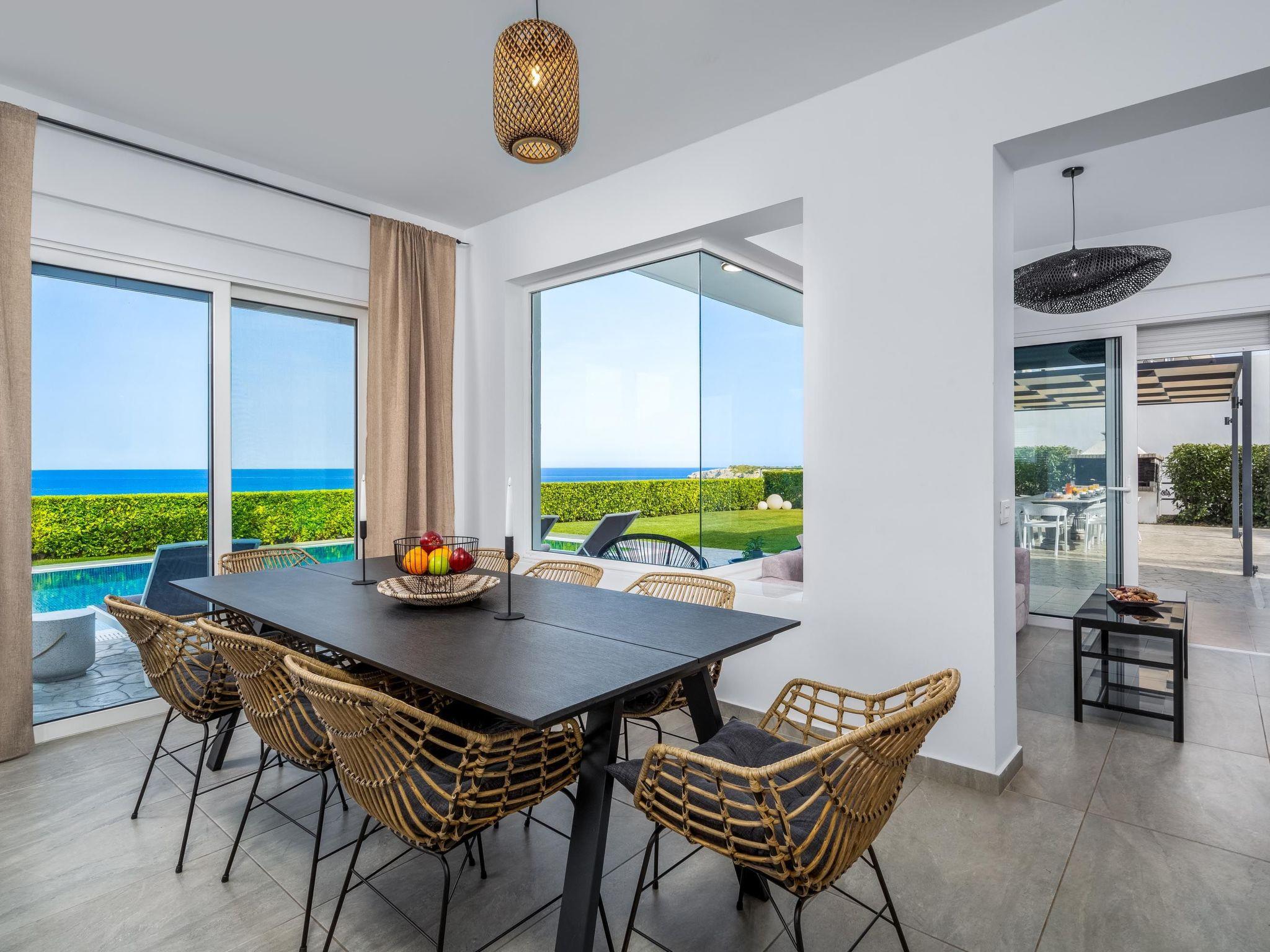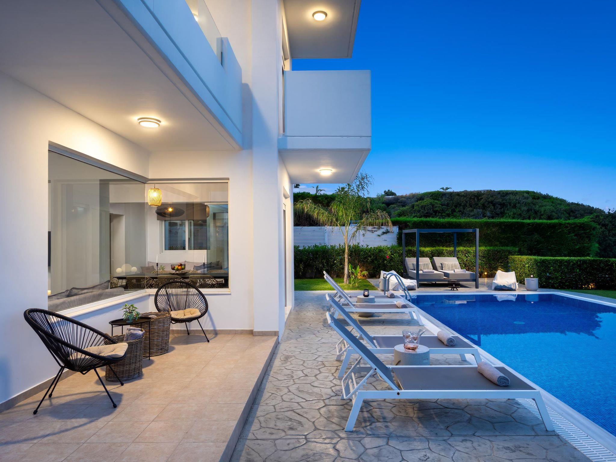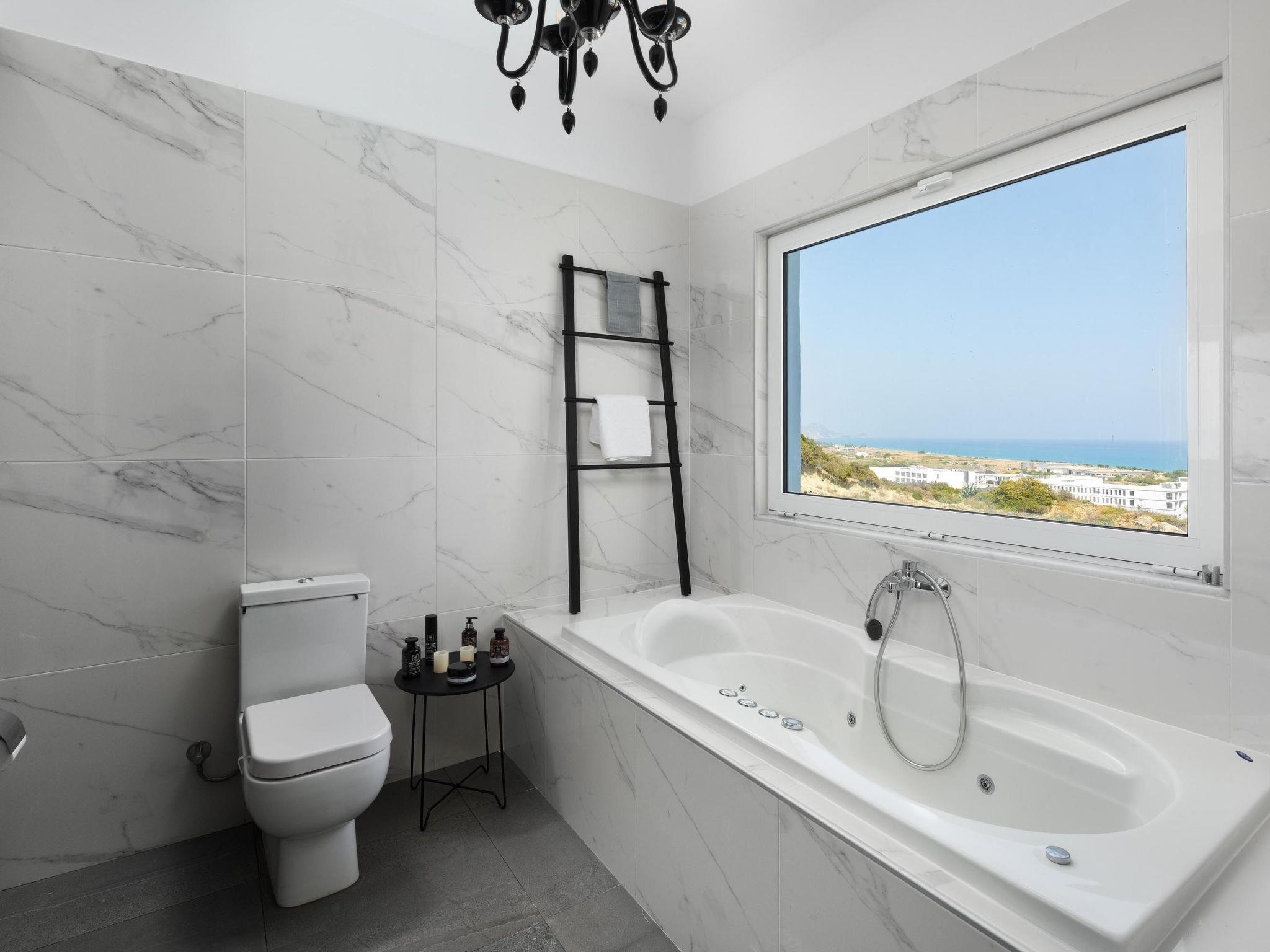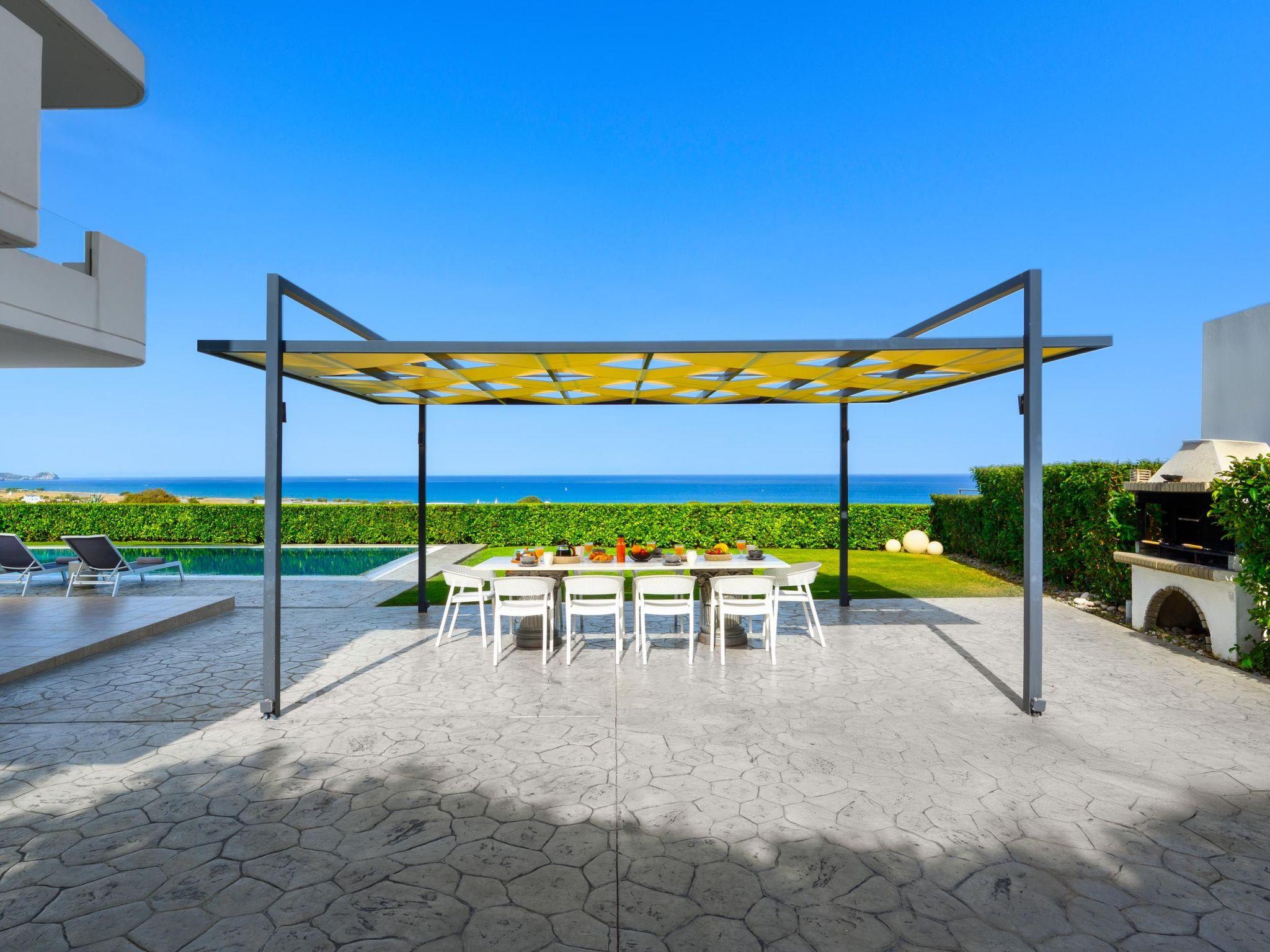 Hill & sea view Villa is brand new and has a tasteful decorating approach that magnetizes you as soon as you arrive to the property. Villa has 5 modern bedrooms and 3 bathrooms, 2 of them are included in the bedrooms, also there is a wc. There is a separate fully equipped kitchen for any meal preparation as well as a luxurious dining area with a window viewing the emerald waters of the island. The living area is quite inviting in its warm colors and the screen TV. There’s free Wi-Fi access throughout the property. Outdoors, guests will find their private swimming pool and the sunbeds, everything designed in a minimal style. The surrounding area of the pool is pretty pleasant, as long as you gaze to this extraordinary view it will offer you peace. Also, you can enjoy the BBQ facilities and the modern sitting area.