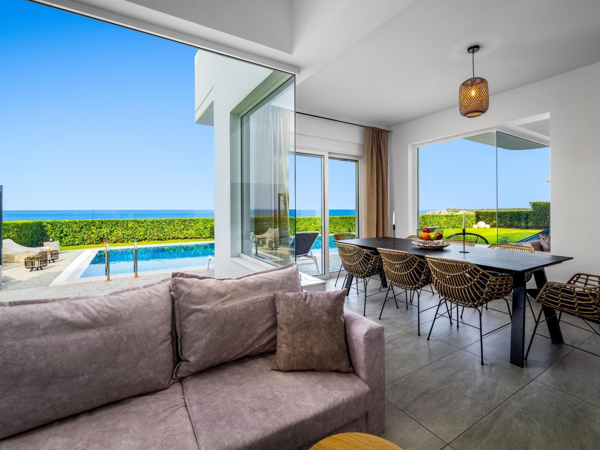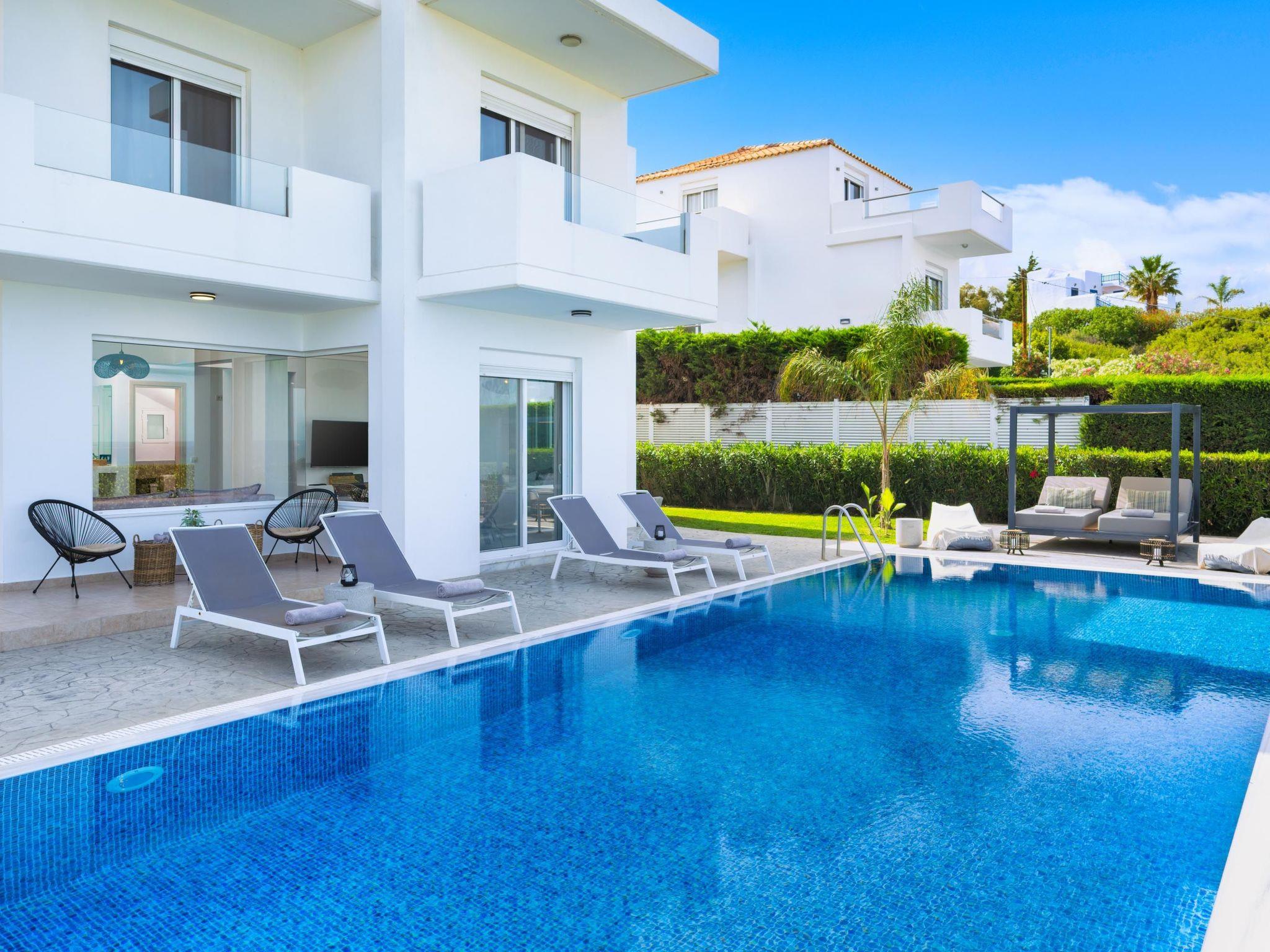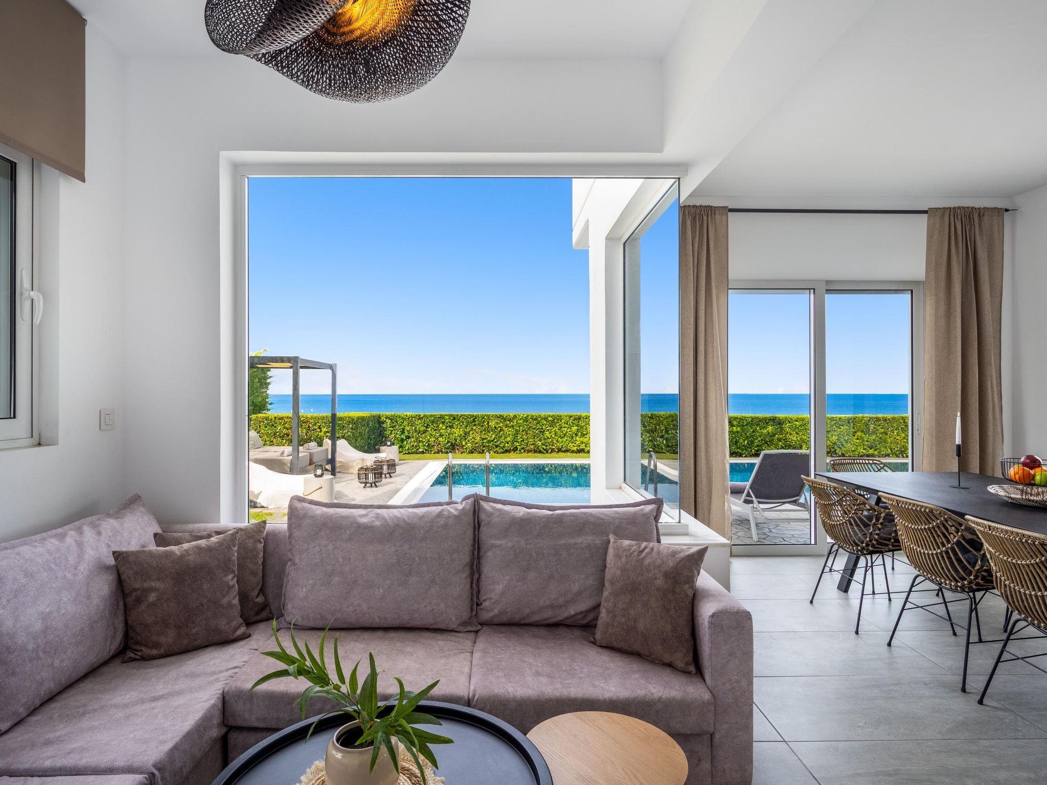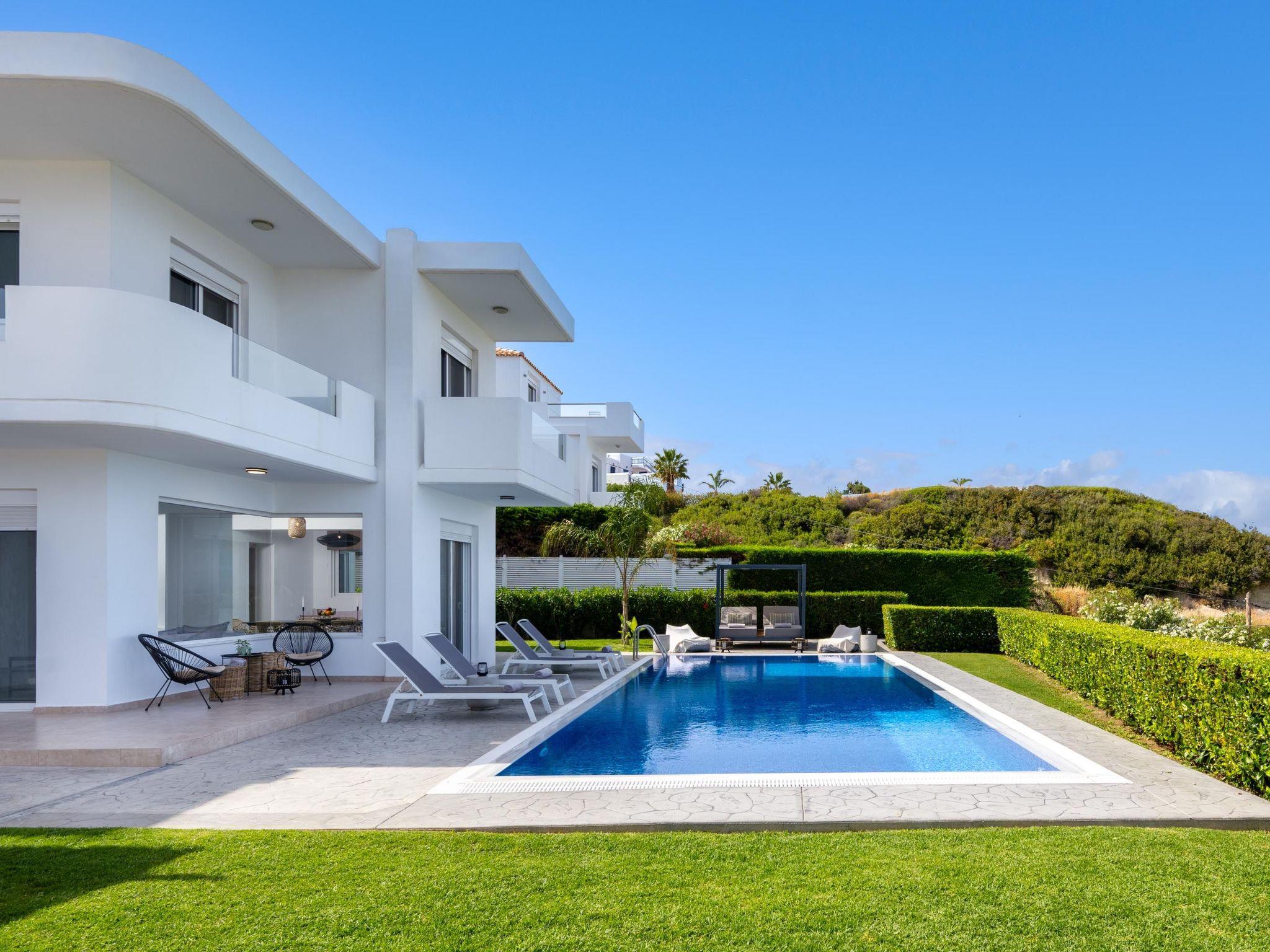 Hill & sea view Villa is brand new and has a tasteful decorating approach that magnetizes you as soon as you arrive to the property. Villa has 5 modern bedrooms and 3 bathrooms, 2 of them are included in the bedrooms, also there is a wc. There is a separate fully equipped kitchen for any meal preparation as well as a luxurious dining area with a window viewing the emerald waters of the island. The living area is quite inviting in its warm colors and the screen TV. There’s free Wi-Fi access throughout the property. Outdoors, guests will find their private swimming pool and the sunbeds, everything designed in a minimal style. The surrounding area of the pool is pretty pleasant, as long as you gaze to this extraordinary view it will offer you peace. Also, you can enjoy the BBQ facilities and the modern sitting area.