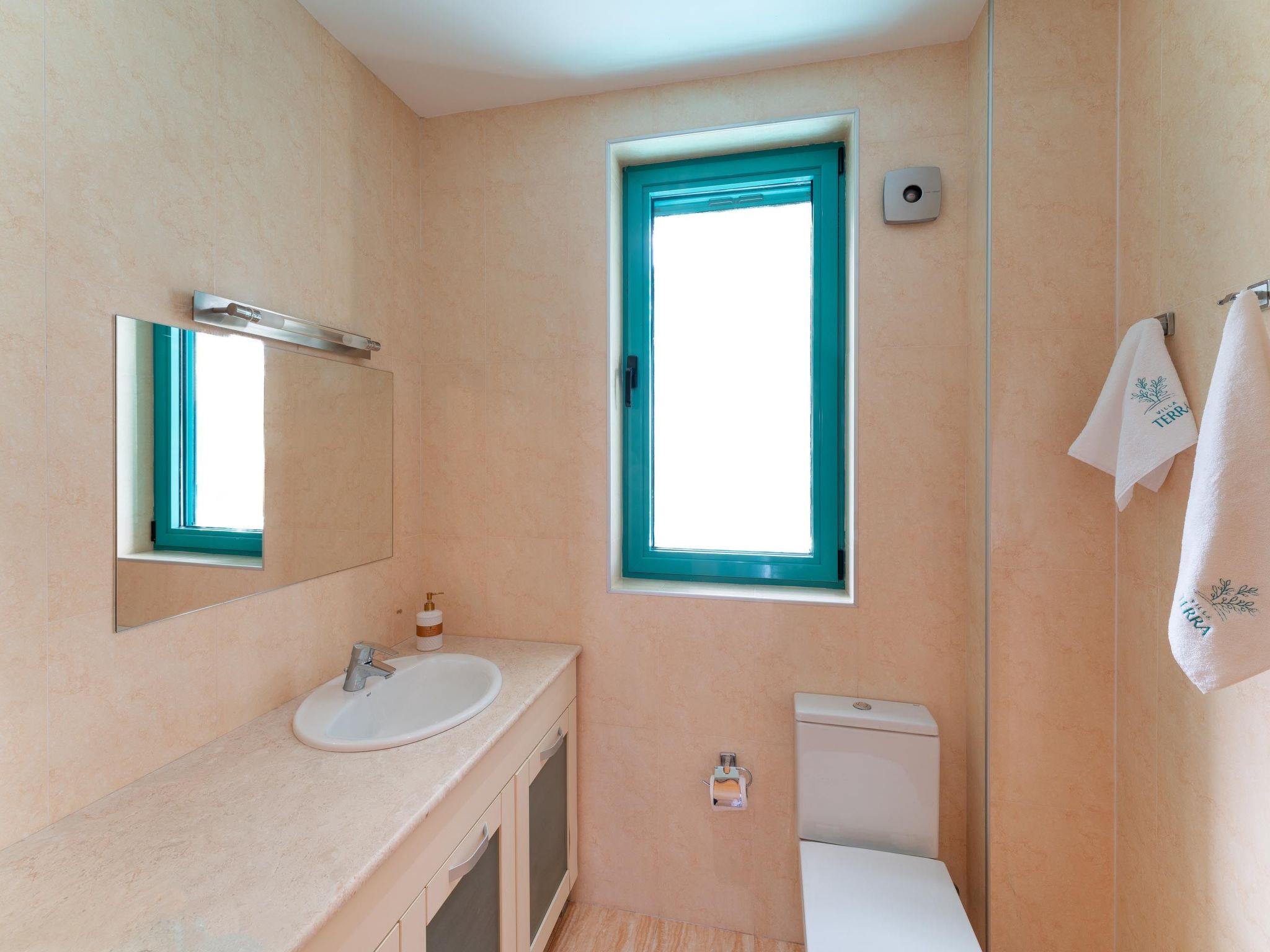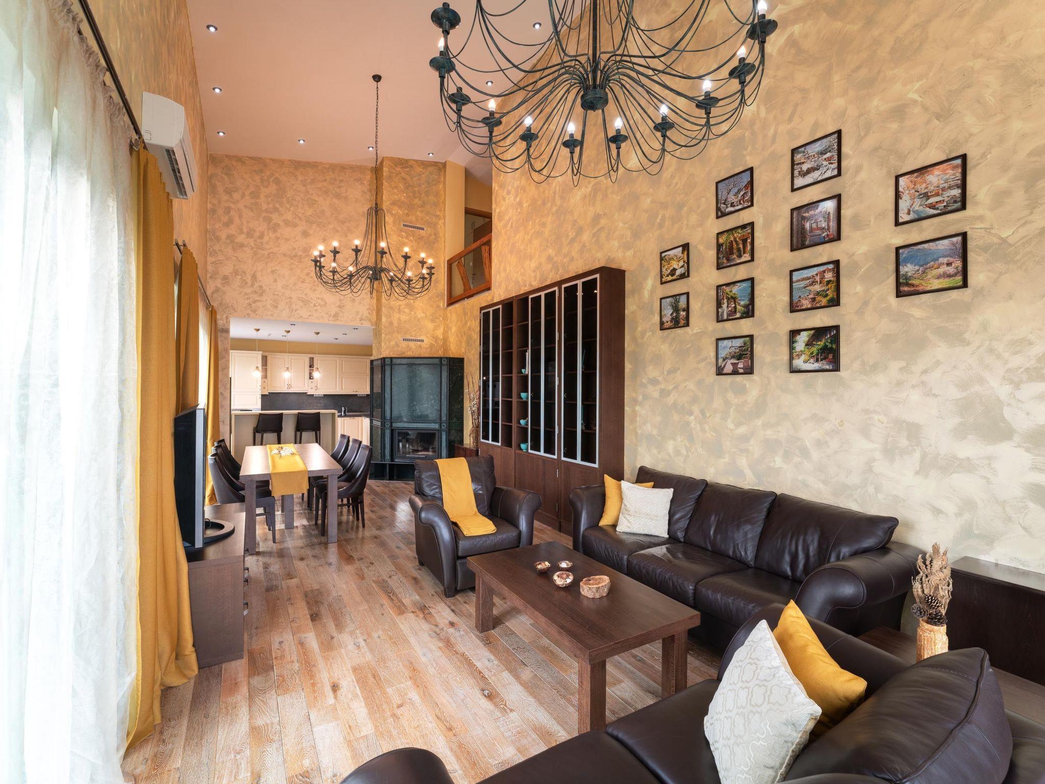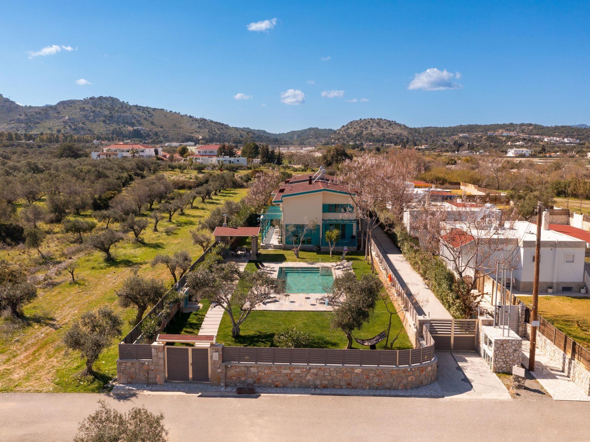 Throughout centuries, the people of Rhodes have used various types of stone to construct their towns, temples. Villa Terra stands as a testament to the craftsmanship and artistry of master stonemasons (?????t?st??), meticulously hand-carving each stone of the fence to preserve the distinctive nuances of the local terrain. The turquoise essence of the Aegean breeze woven into the windows and shutters. Spacious patio, lush green surroundings, a dedicated BBQ area equipped with TV and all the essentials invite guests to leisurely gatherings. Dive into the refreshing embrace of the spacious swimming pool, complete with amenities for both relaxation and recreation, including a counter-current feature and a Jacuzzi section. Inside, Villa Terra exudes a sense of balance and harmony. Natural wooden parquet, marble fireplace, onyx accents and a graceful oak staircase adorn the floors, leading to three elegantly appointed bedrooms with en-suite bathrooms. King-size beds on the upper floor and singles on the lower floor offer comfortable accommodations for up to six guests. With provision for additional 2 beds and 2 baby cots upon request, ensuring comfortable accommodations for larger groups or families. Each room is equipped with air conditioning, guaranteeing optimal comfort throughout your stay. The ground floor features a dedicated toilet and a fully equipped laundry room, complete with ironing facilities for added convenience. An airy open-plan living room seamlessly transitions into a sleek Scavolini kitchen, boasting contemporary appliances and generous counter space. A central island invites casual dining or an afternoon drink on the bar stools, leather sofas and armchairs invite relaxation. A private garage within the villa premises accommodates two cars, with extra parking available outside.