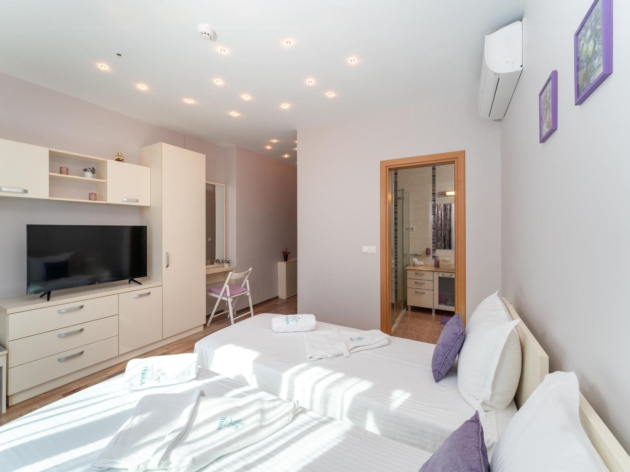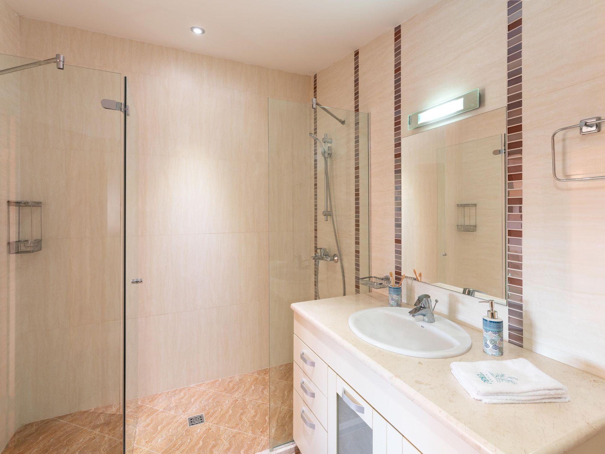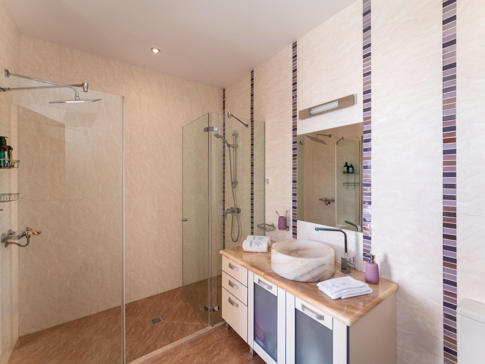 Throughout centuries, the people of Rhodes have used various types of stone to construct their towns, temples. Villa Terra stands as a testament to the craftsmanship and artistry of master stonemasons (?????t?st??), meticulously hand-carving each stone of the fence to preserve the distinctive nuances of the local terrain. The turquoise essence of the Aegean breeze woven into the windows and shutters. Spacious patio, lush green surroundings, a dedicated BBQ area equipped with TV and all the essentials invite guests to leisurely gatherings. Dive into the refreshing embrace of the spacious swimming pool, complete with amenities for both relaxation and recreation, including a counter-current feature and a Jacuzzi section. Inside, Villa Terra exudes a sense of balance and harmony. Natural wooden parquet, marble fireplace, onyx accents and a graceful oak staircase adorn the floors, leading to three elegantly appointed bedrooms with en-suite bathrooms. King-size beds on the upper floor and singles on the lower floor offer comfortable accommodations for up to six guests. With provision for additional 2 beds and 2 baby cots upon request, ensuring comfortable accommodations for larger groups or families. Each room is equipped with air conditioning, guaranteeing optimal comfort throughout your stay. The ground floor features a dedicated toilet and a fully equipped laundry room, complete with ironing facilities for added convenience. An airy open-plan living room seamlessly transitions into a sleek Scavolini kitchen, boasting contemporary appliances and generous counter space. A central island invites casual dining or an afternoon drink on the bar stools, leather sofas and armchairs invite relaxation. A private garage within the villa premises accommodates two cars, with extra parking available outside.