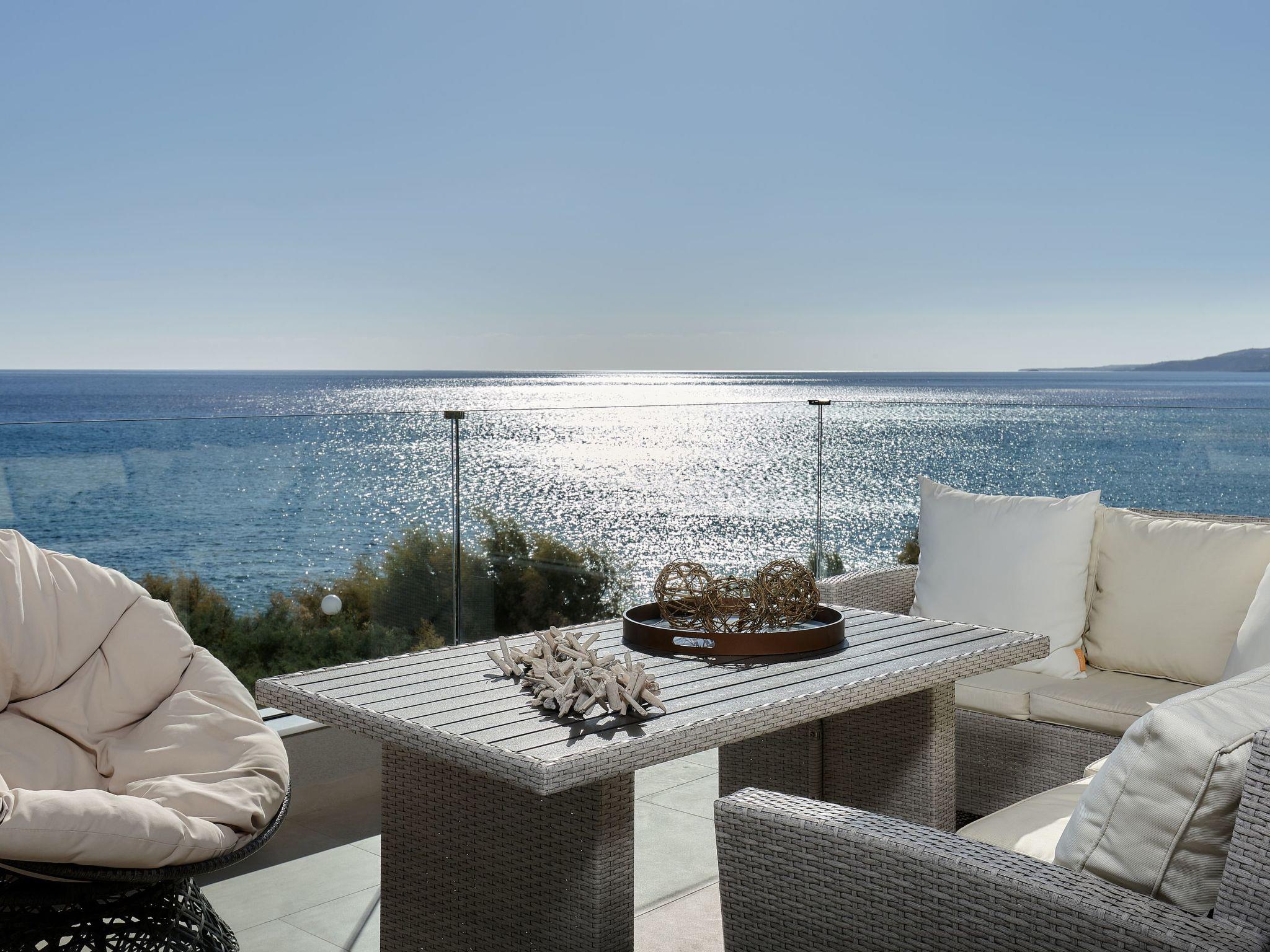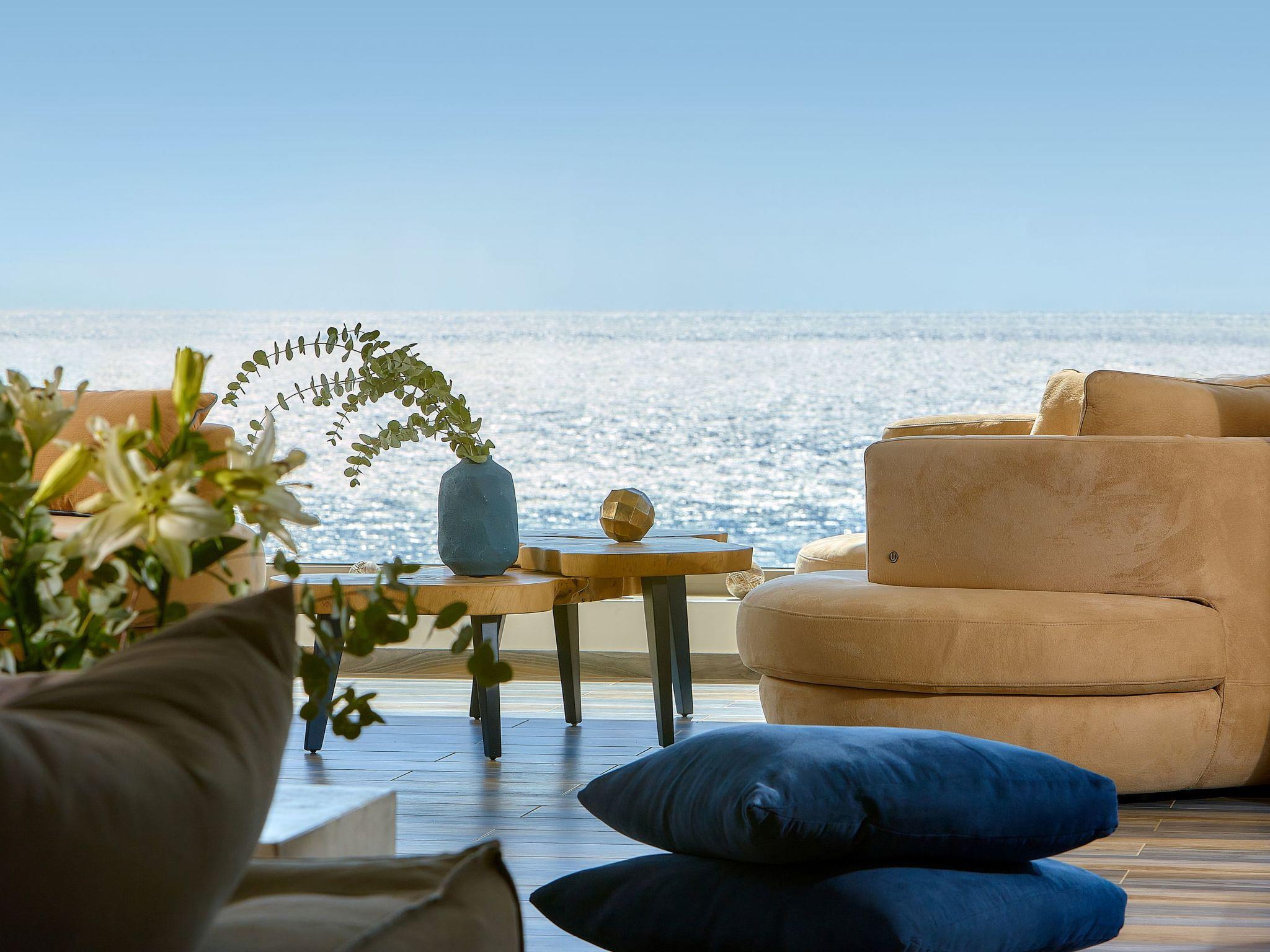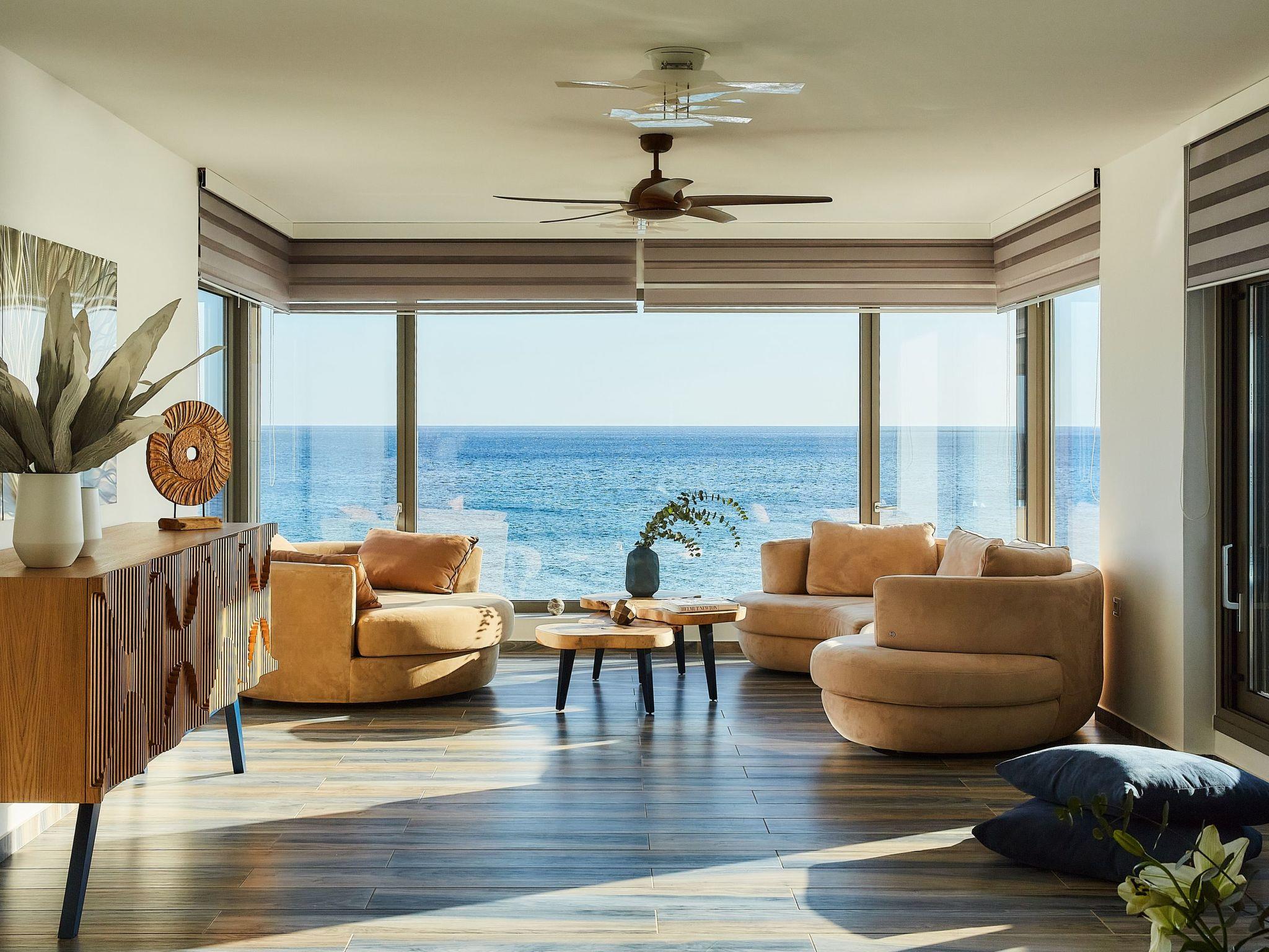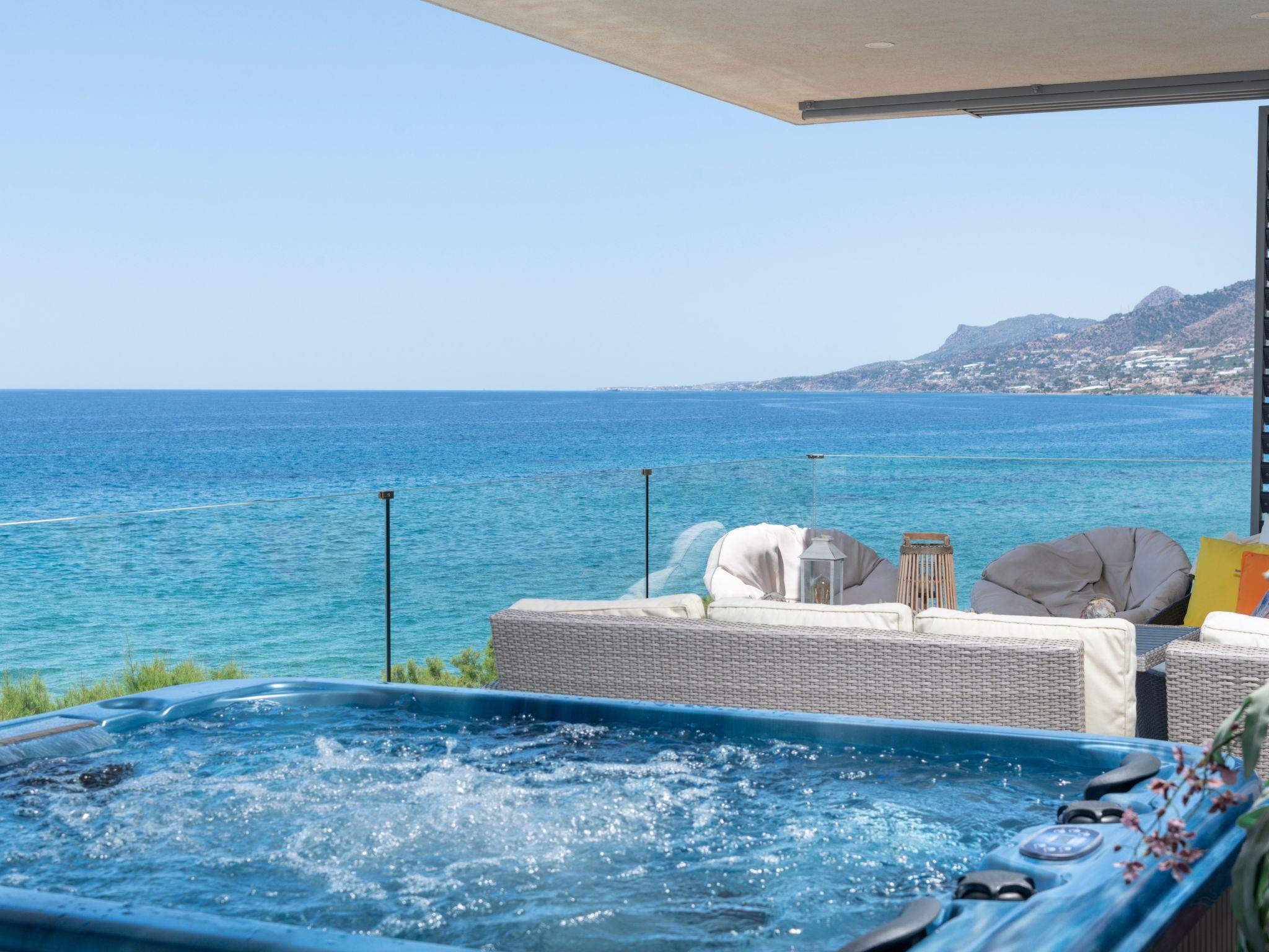 This exclusive designer villa overlooks the crystal-clear, blue waters of the Mediterranean sea - a beautiful rocky horizon ideal for swimming, sunbathing, surfing, and other water sports. It is located in Koutsourás, a quiet, agricultural village in South-Eastern Crete. It is less than 2 km west of the tourist town of Makry Gialos, 23 km east of Ierapetra, and 33 km from Sitia. The luxurious accommodation boasts spectacular views of the southern Crete landscape, moon and sunset. Located only a few minutes’ walk from a local pebble beach, bakery, and coffee shops, patisserie, super markets, bars, restaurants, and pharmacy, the villa combines romantic seclusion with proximity to modern comforts.