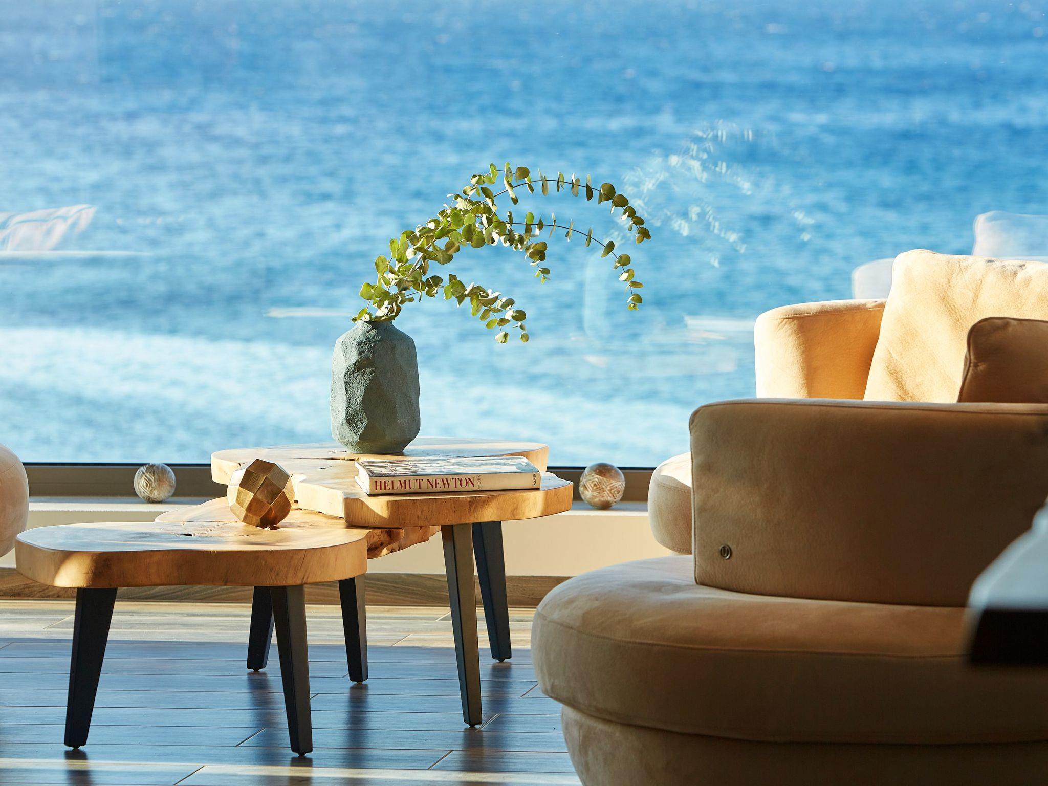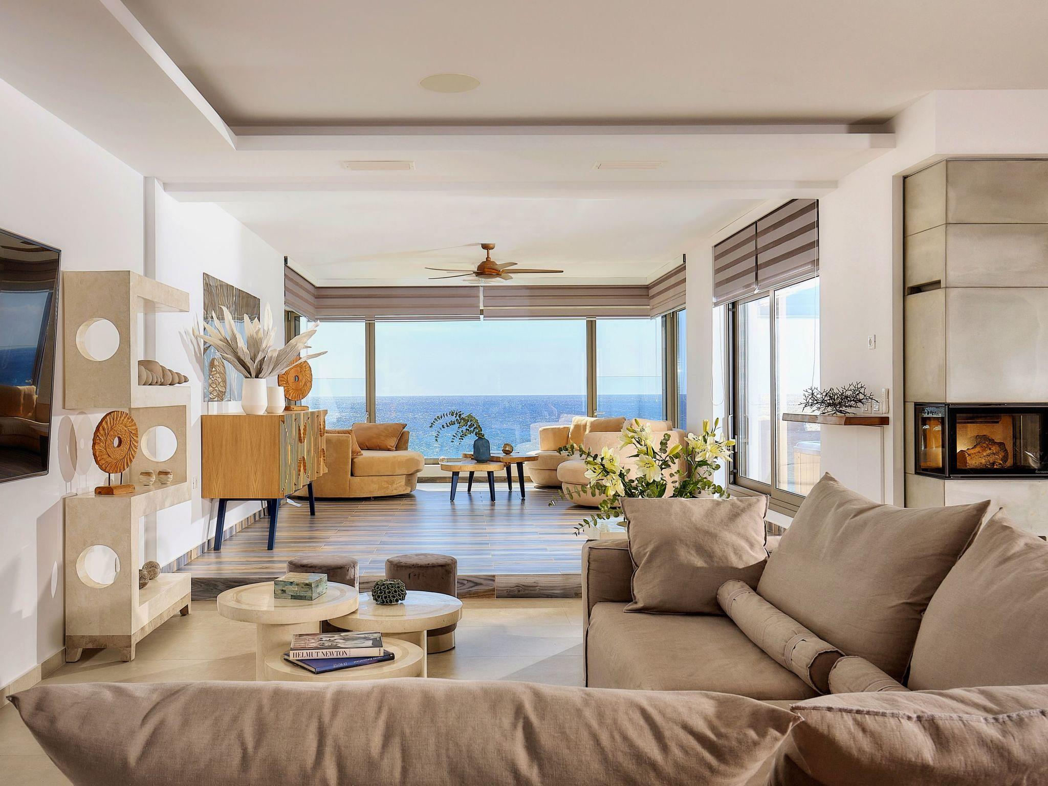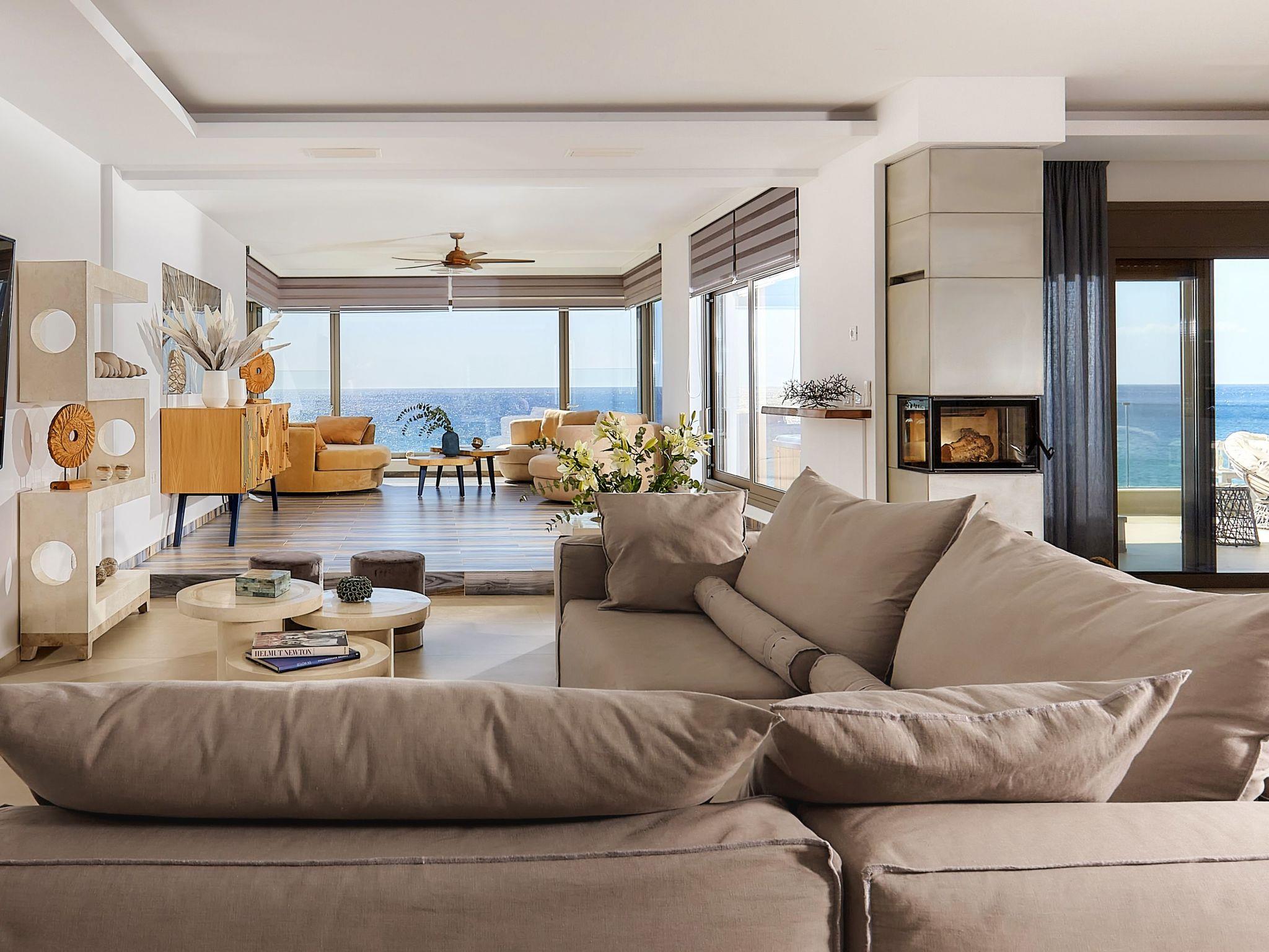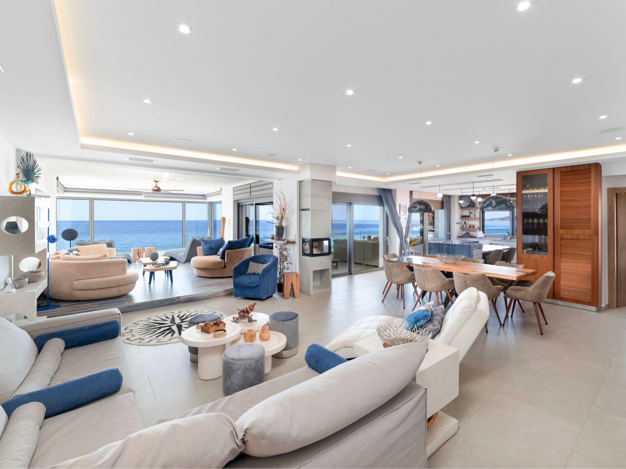 This exclusive designer villa overlooks the crystal-clear, blue waters of the Mediterranean sea - a beautiful rocky horizon ideal for swimming, sunbathing, surfing, and other water sports. It is located in Koutsourás, a quiet, agricultural village in South-Eastern Crete. It is less than 2 km west of the tourist town of Makry Gialos, 23 km east of Ierapetra, and 33 km from Sitia. The luxurious accommodation boasts spectacular views of the southern Crete landscape, moon and sunset. Located only a few minutes’ walk from a local pebble beach, bakery, and coffee shops, patisserie, super markets, bars, restaurants, and pharmacy, the villa combines romantic seclusion with proximity to modern comforts.