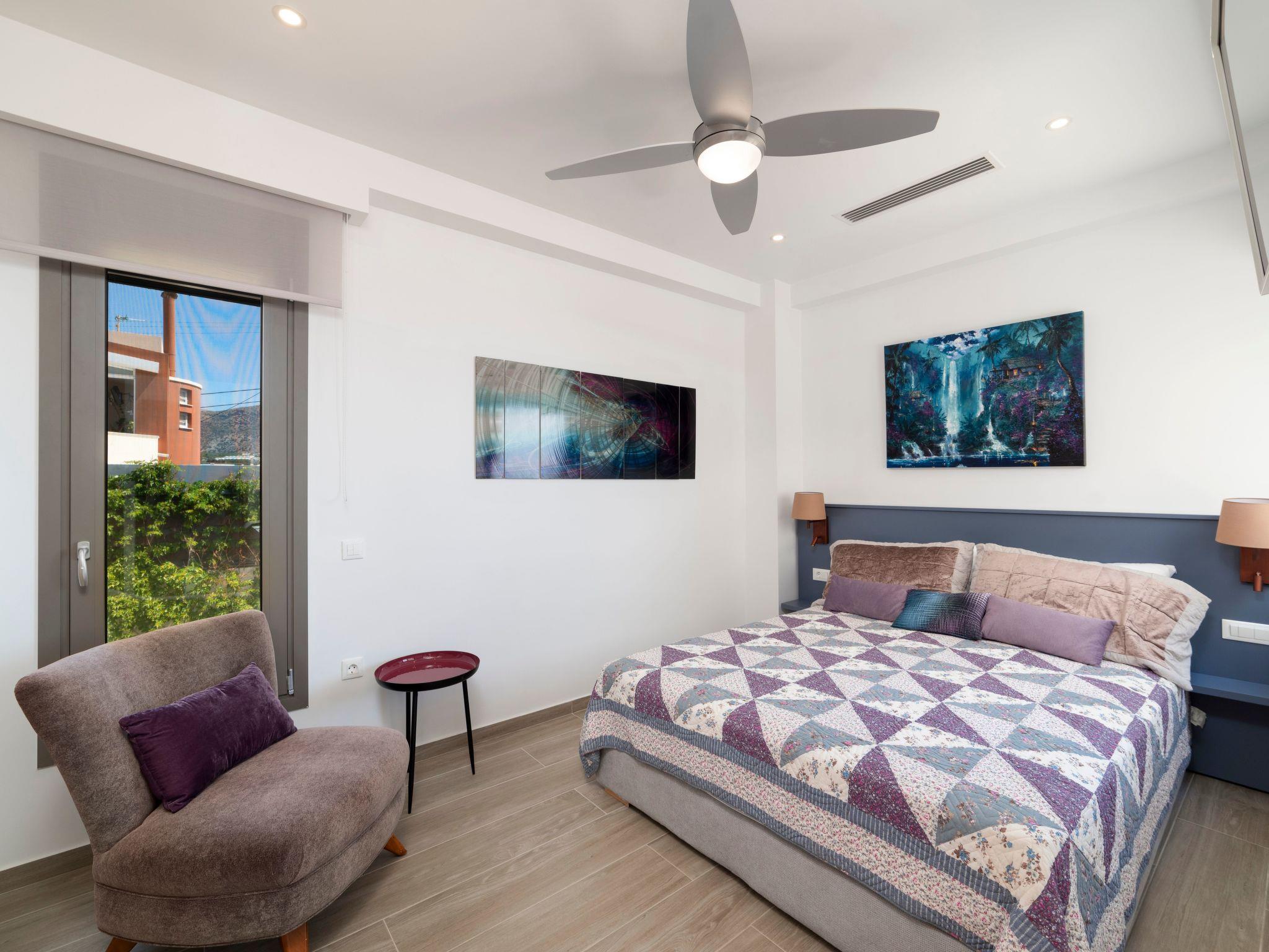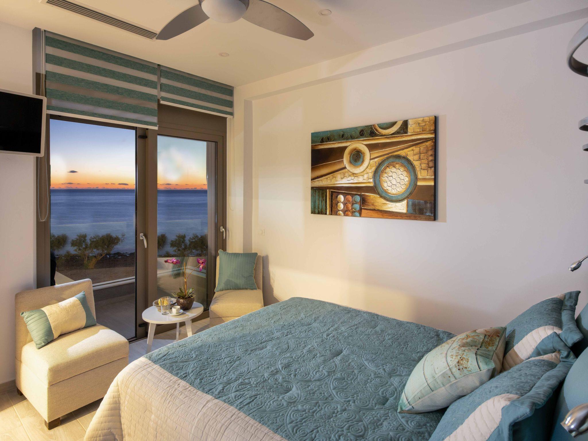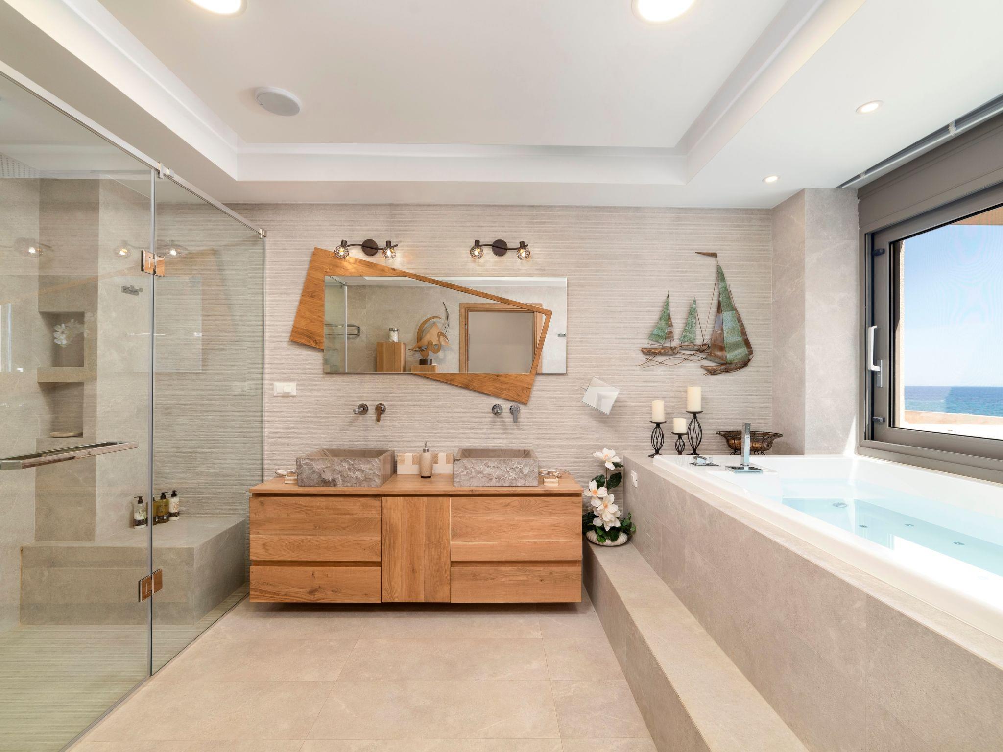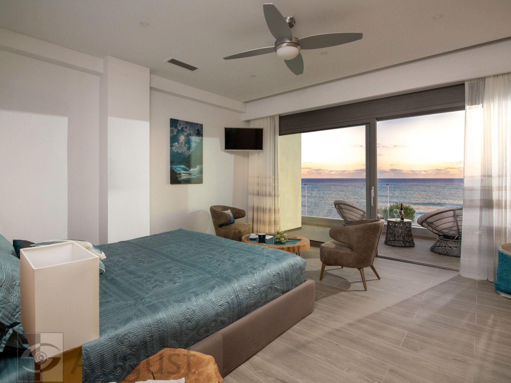 This exclusive designer villa overlooks the crystal-clear, blue waters of the Mediterranean sea - a beautiful rocky horizon ideal for swimming, sunbathing, surfing, and other water sports. It is located in Koutsourás, a quiet, agricultural village in South-Eastern Crete. It is less than 2 km west of the tourist town of Makry Gialos, 23 km east of Ierapetra, and 33 km from Sitia. The luxurious accommodation boasts spectacular views of the southern Crete landscape, moon and sunset. Located only a few minutes’ walk from a local pebble beach, bakery, and coffee shops, patisserie, super markets, bars, restaurants, and pharmacy, the villa combines romantic seclusion with proximity to modern comforts.