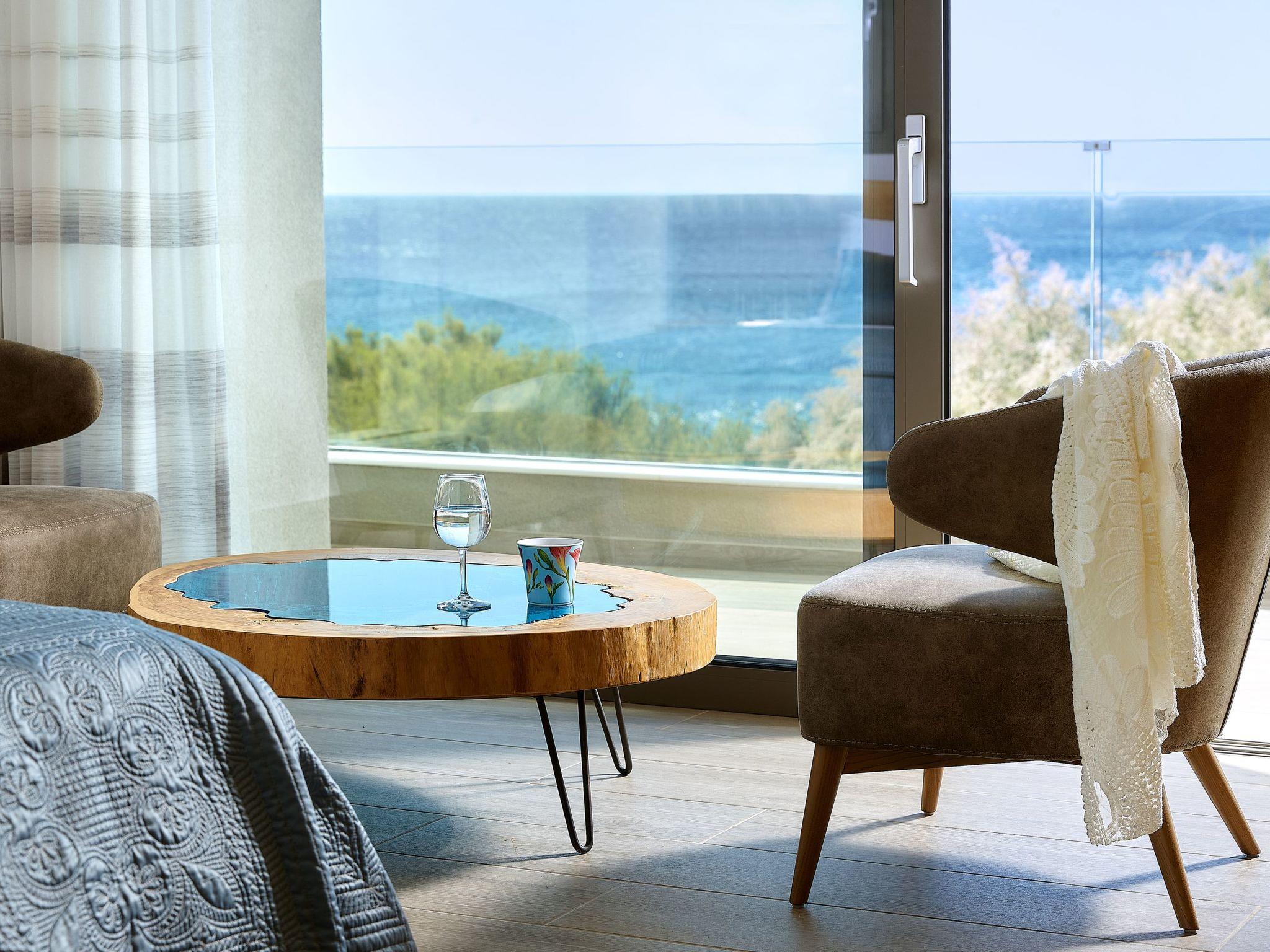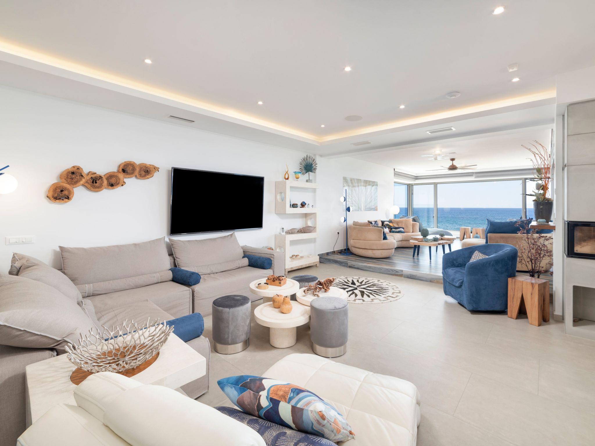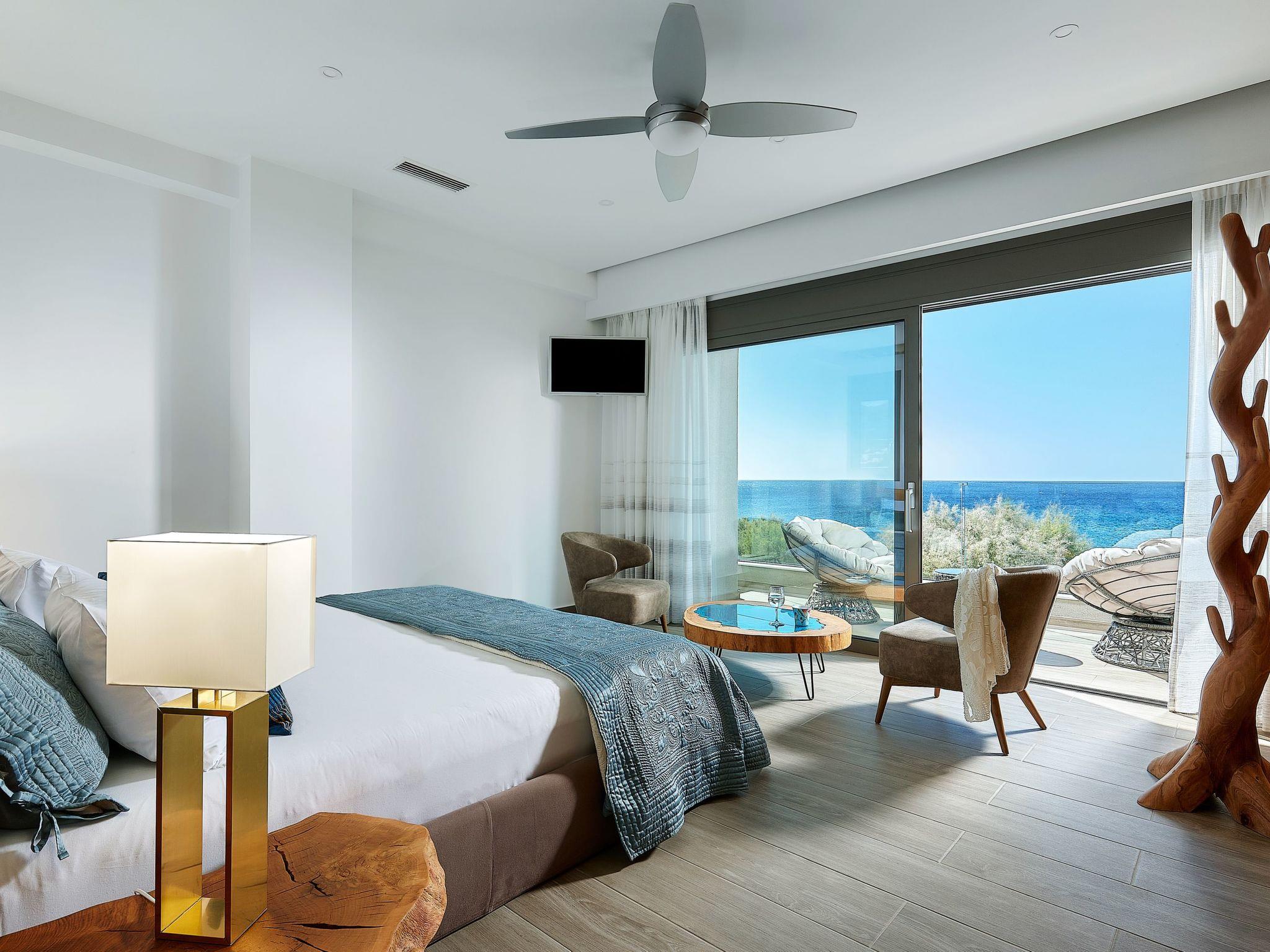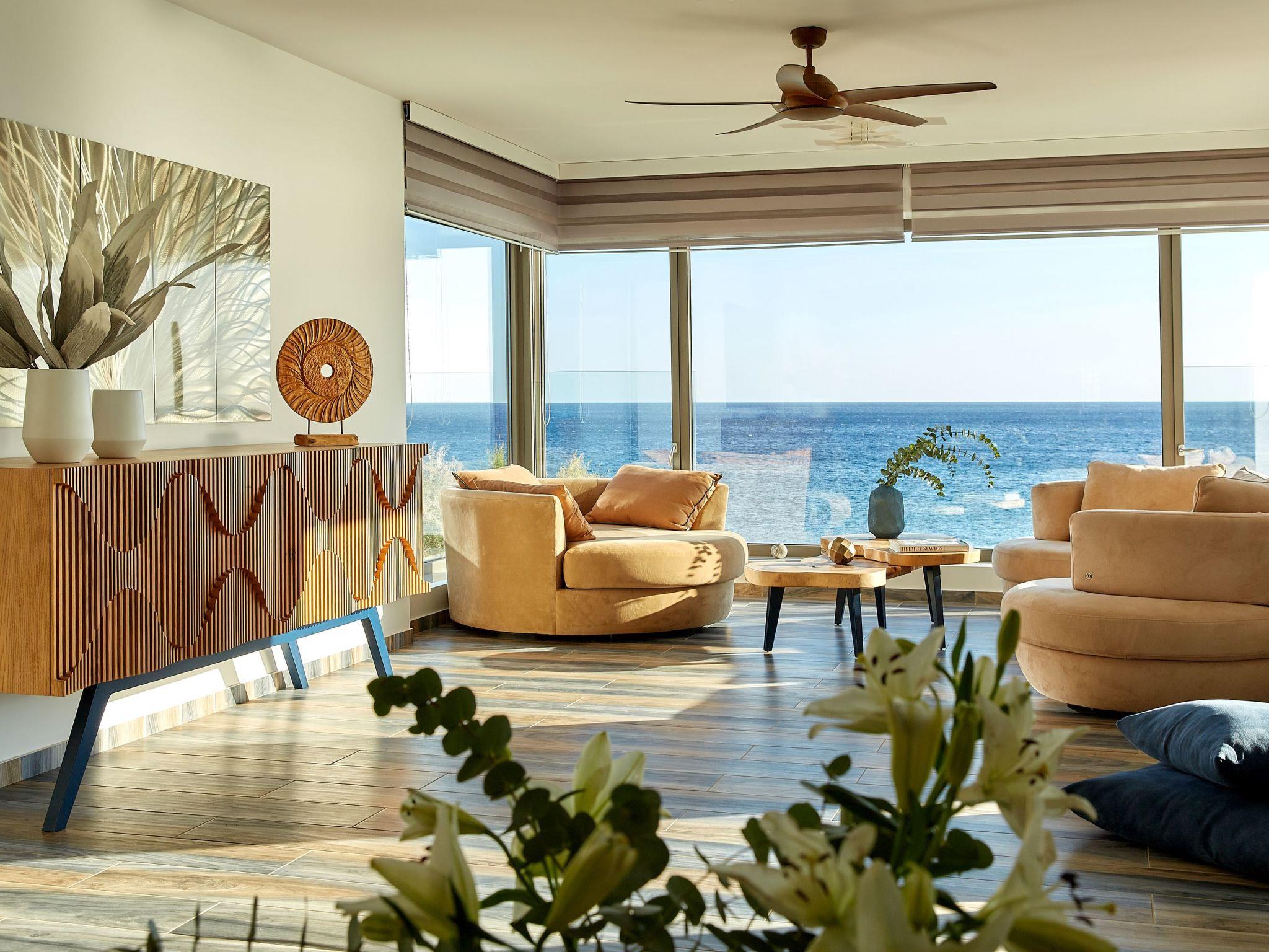 This exclusive designer villa overlooks the crystal-clear, blue waters of the Mediterranean sea - a beautiful rocky horizon ideal for swimming, sunbathing, surfing, and other water sports. It is located in Koutsourás, a quiet, agricultural village in South-Eastern Crete. It is less than 2 km west of the tourist town of Makry Gialos, 23 km east of Ierapetra, and 33 km from Sitia. The luxurious accommodation boasts spectacular views of the southern Crete landscape, moon and sunset. Located only a few minutes’ walk from a local pebble beach, bakery, and coffee shops, patisserie, super markets, bars, restaurants, and pharmacy, the villa combines romantic seclusion with proximity to modern comforts.