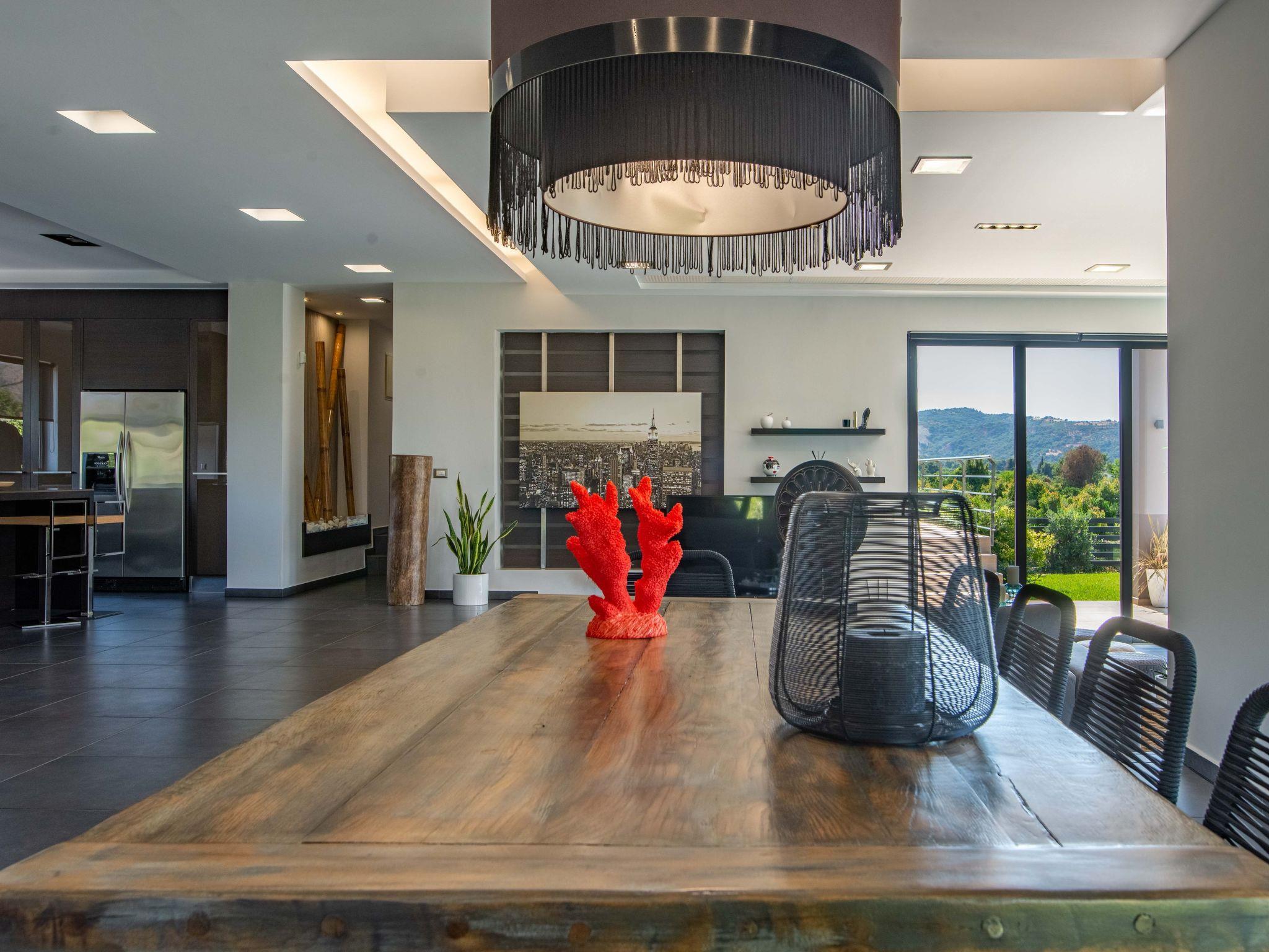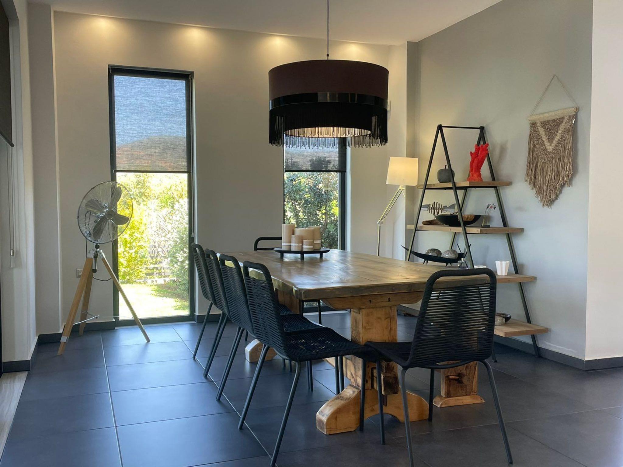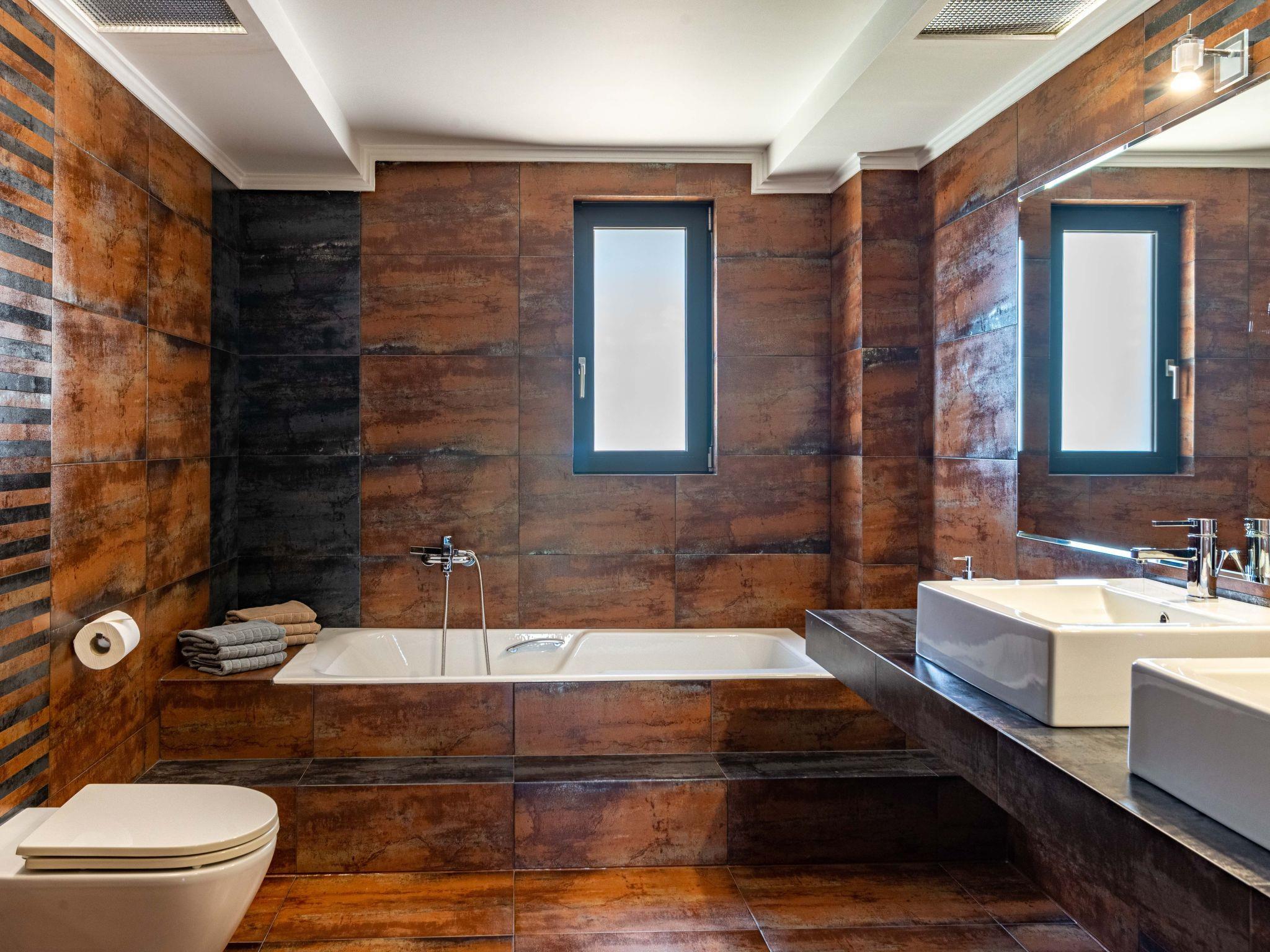 Villa Vega is built on a plot of 2000 sqm with a living space of 30 sqm. The villa consists of six bedrooms, with double-sized beds and smart TV, and five bathrooms. On the lower level, there are three bedrooms with en-suite bathrooms and on the upper level, there are the rest three bedrooms and a bathroom with a bathtub and a WC. Natural materials meet modern design for a calming atmosphere that is luxurious yet comfortable with every space designed to embrace the exterior environment. On the same level, there is also a living room with a satellite TV and windows that create the illusion of transparency, a dining room with seating for 8 persons, and a fully equipped kitchen with an extra dining table and a bar with stools. The kitchen is well-organized with all the electrical appliances.