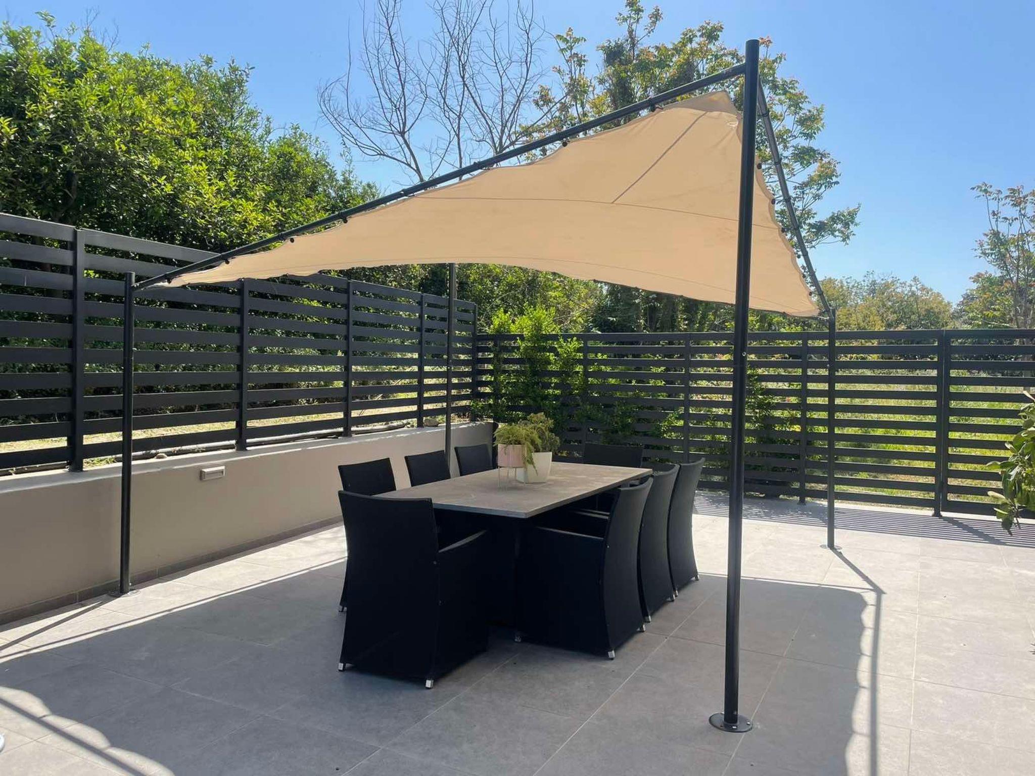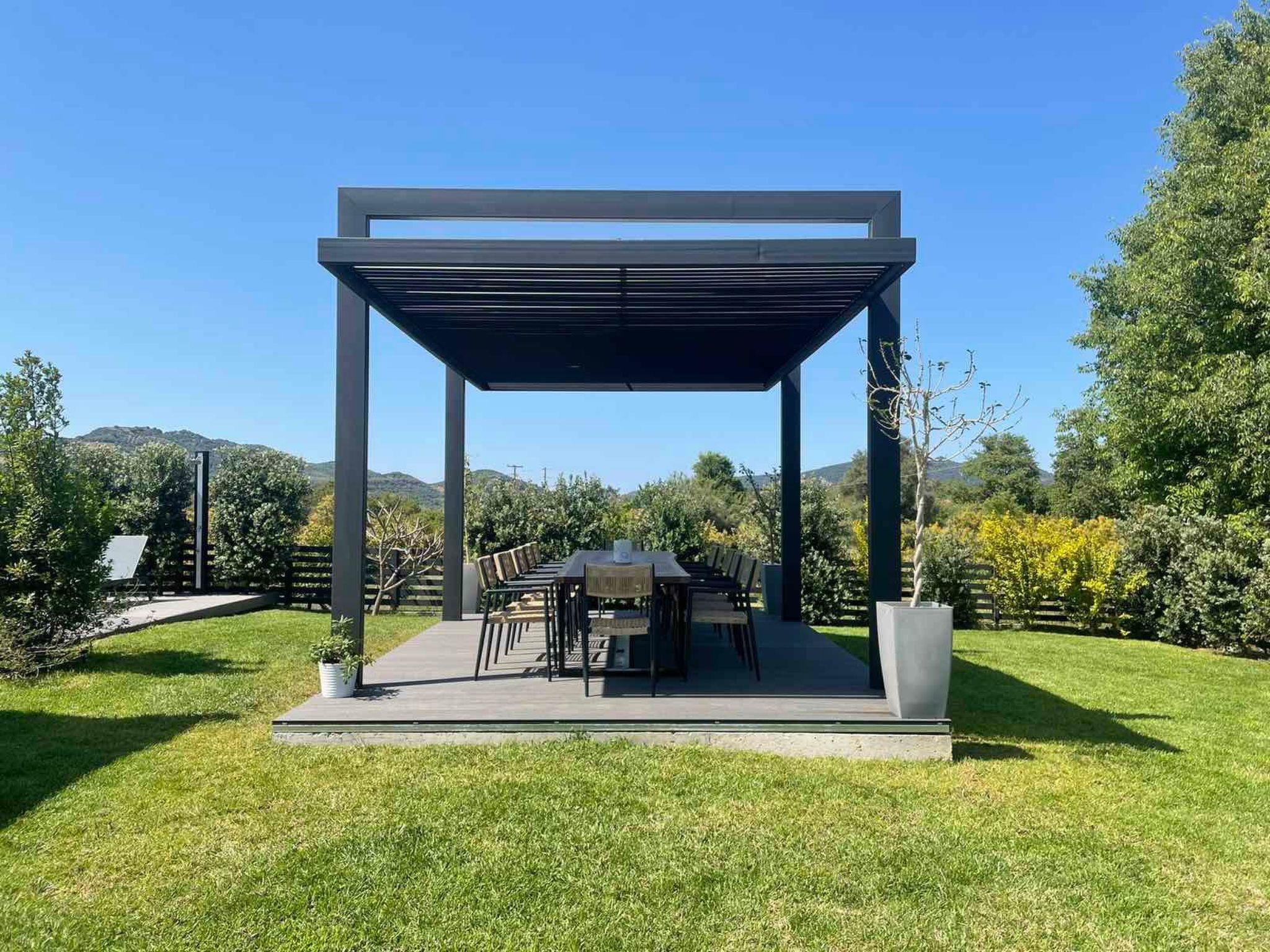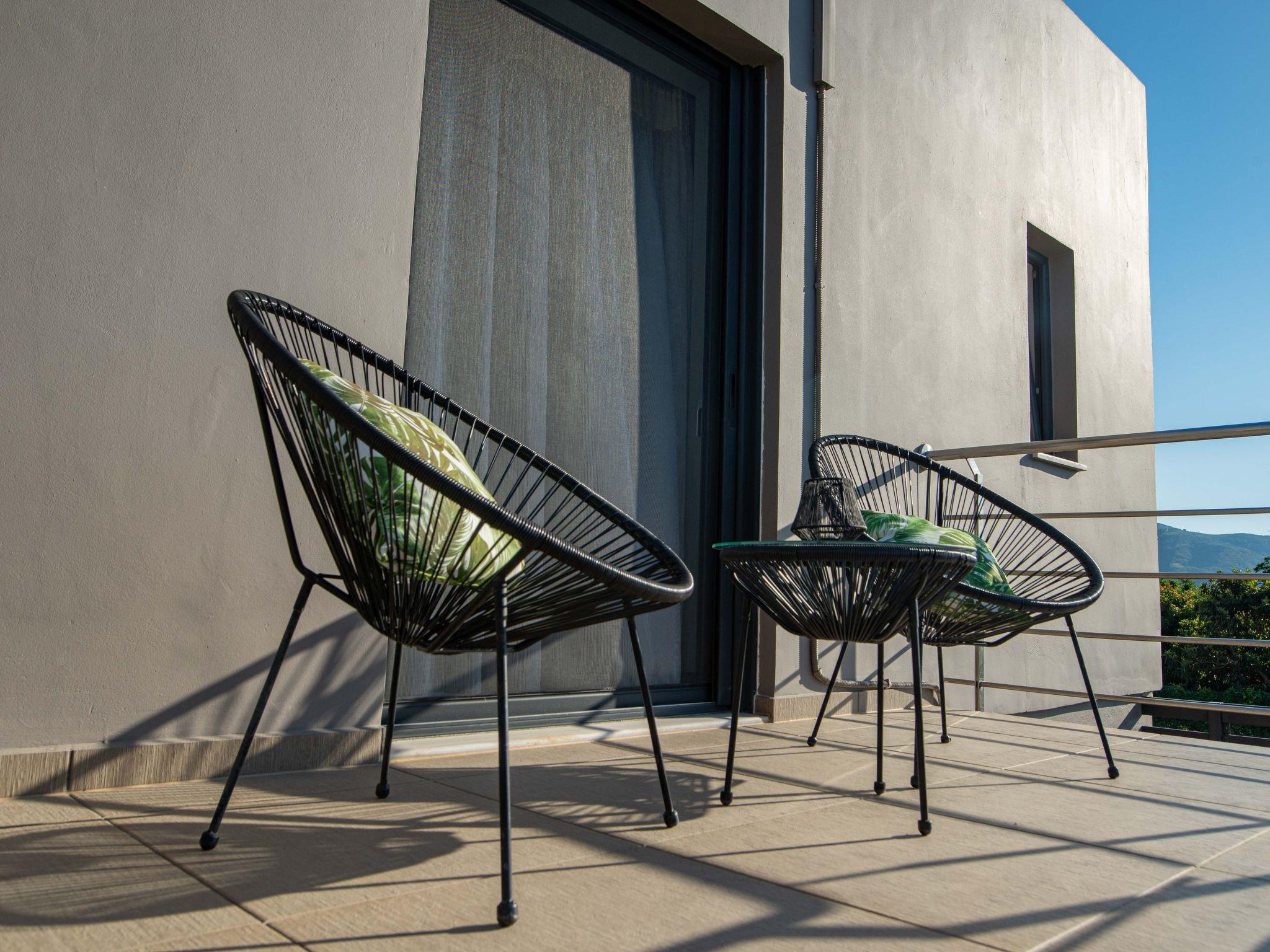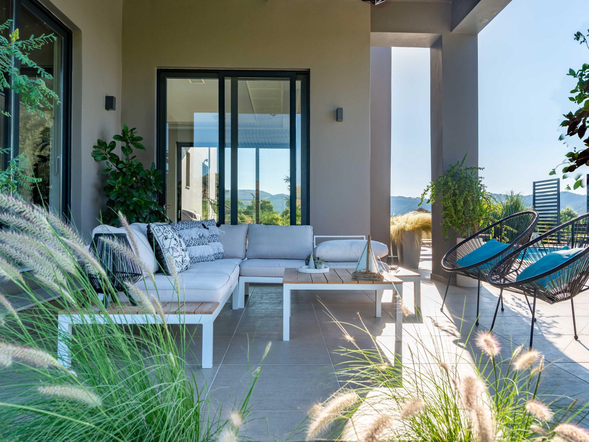 Villa Vega is built on a plot of 2000 sqm with a living space of 30 sqm. The villa consists of six bedrooms, with double-sized beds and smart TV, and five bathrooms. On the lower level, there are three bedrooms with en-suite bathrooms and on the upper level, there are the rest three bedrooms and a bathroom with a bathtub and a WC. Natural materials meet modern design for a calming atmosphere that is luxurious yet comfortable with every space designed to embrace the exterior environment. On the same level, there is also a living room with a satellite TV and windows that create the illusion of transparency, a dining room with seating for 8 persons, and a fully equipped kitchen with an extra dining table and a bar with stools. The kitchen is well-organized with all the electrical appliances.
