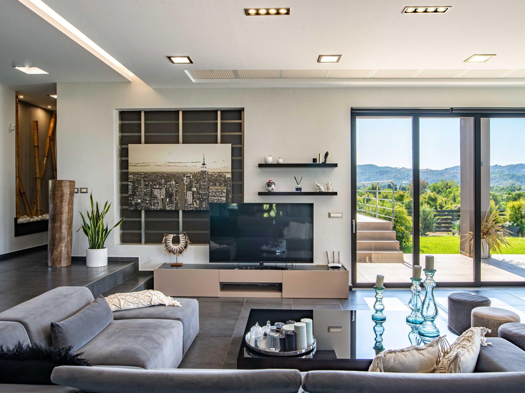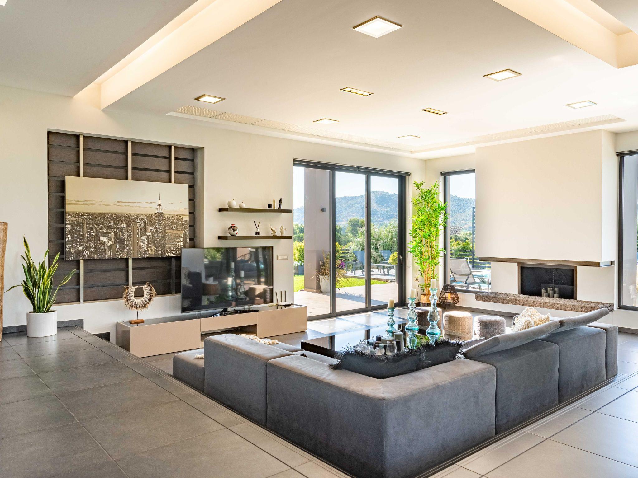 Living area with sofa, 60’’ satellite Smart TV, energy fireplace, access to the pool terrace