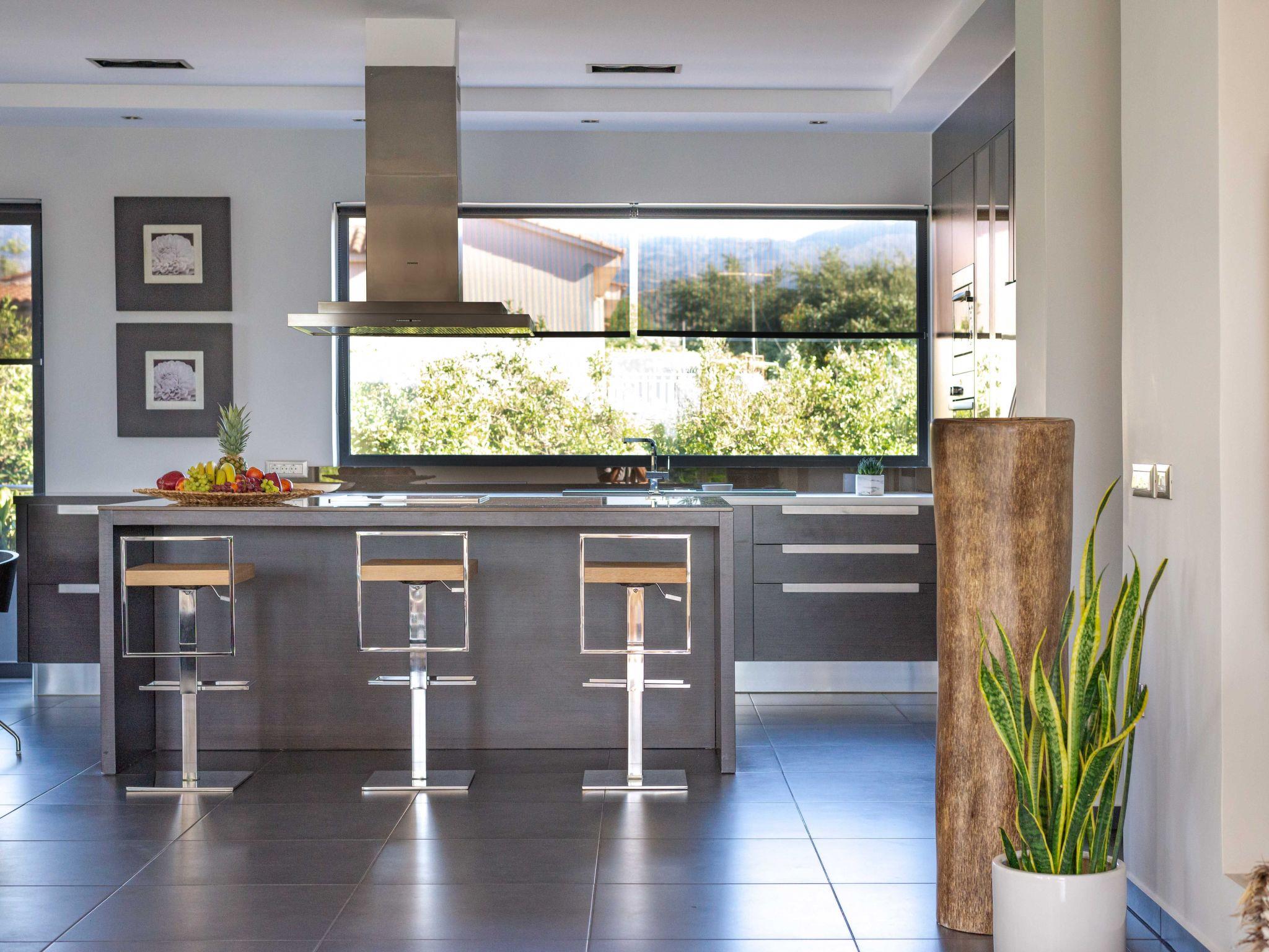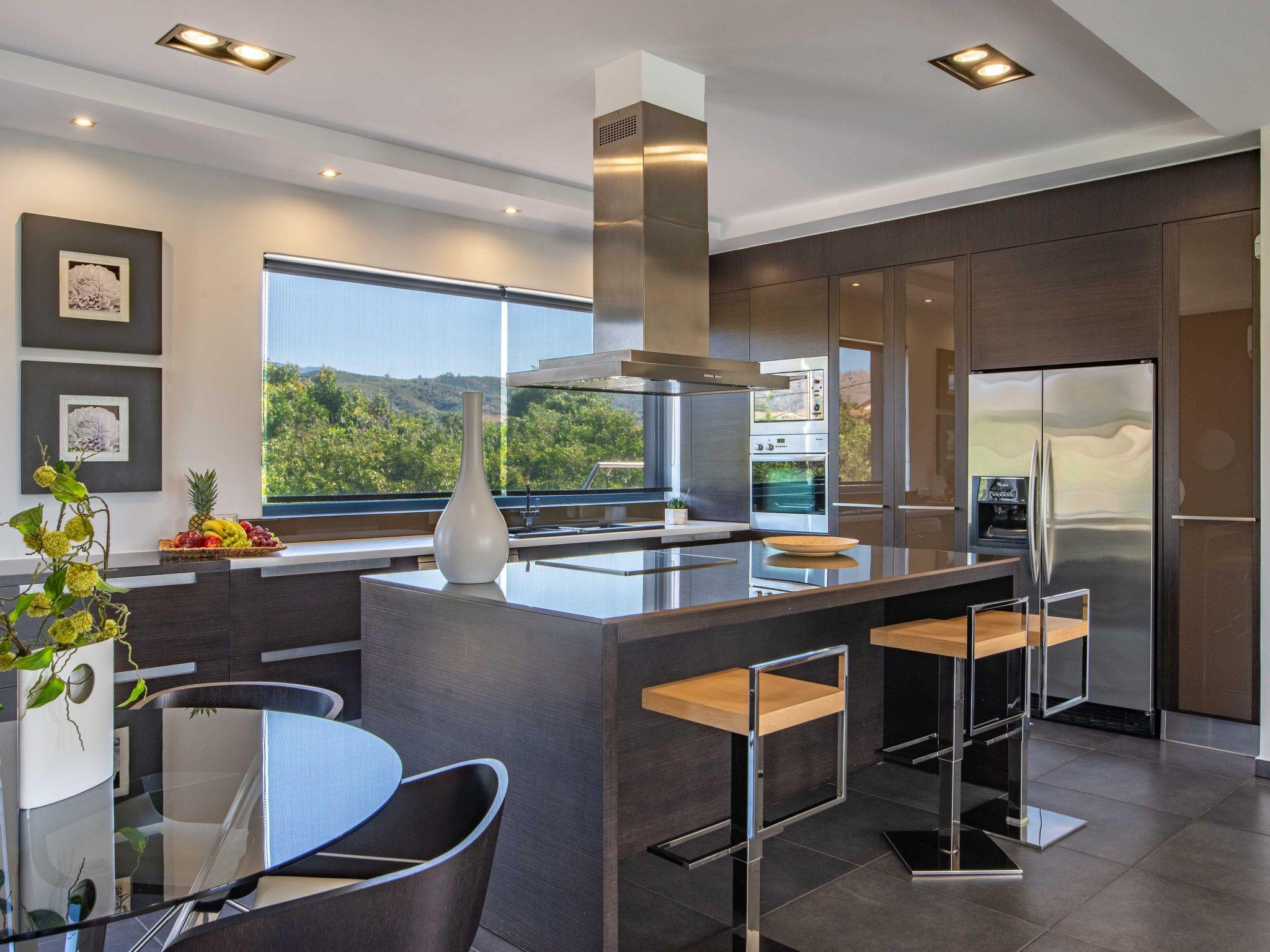 Open plan fully equipped kitchen with a dining area and modern appliances