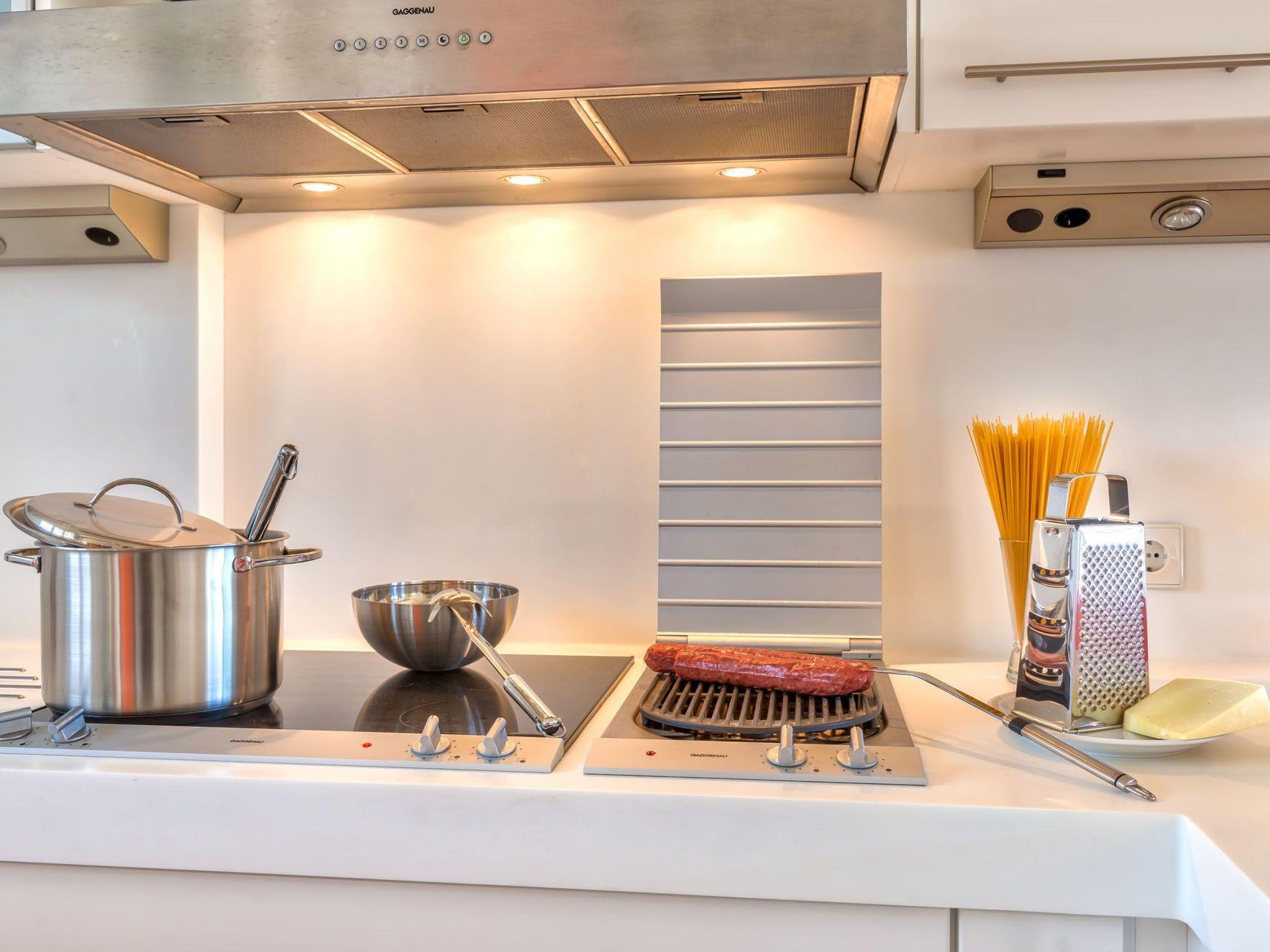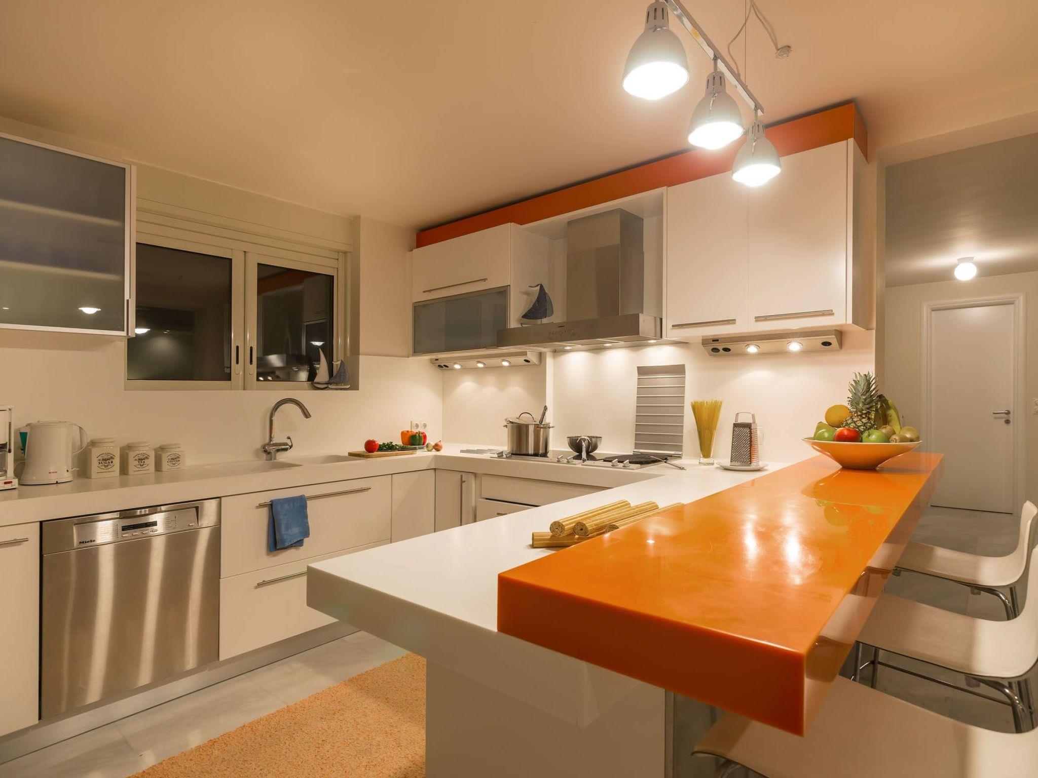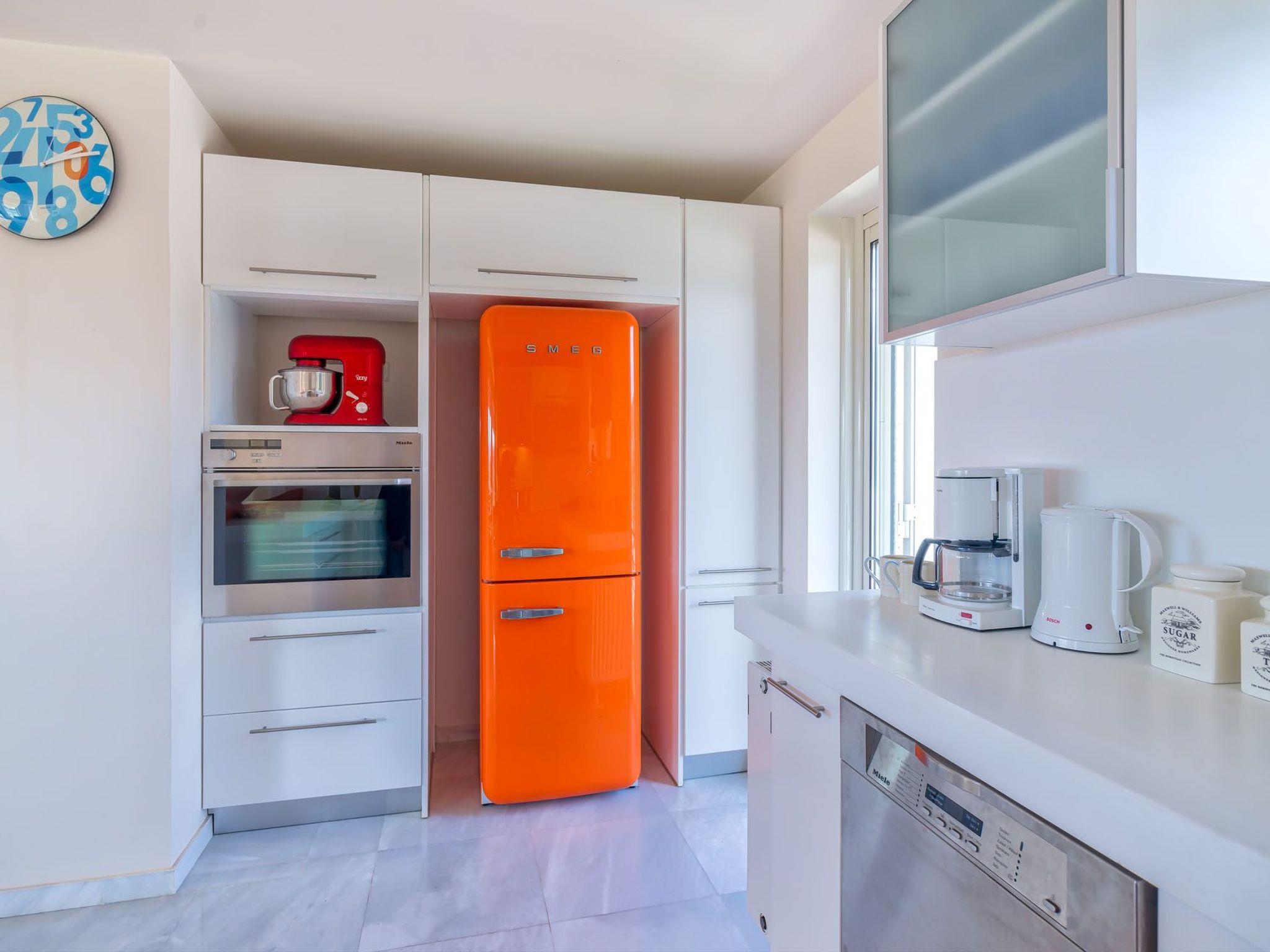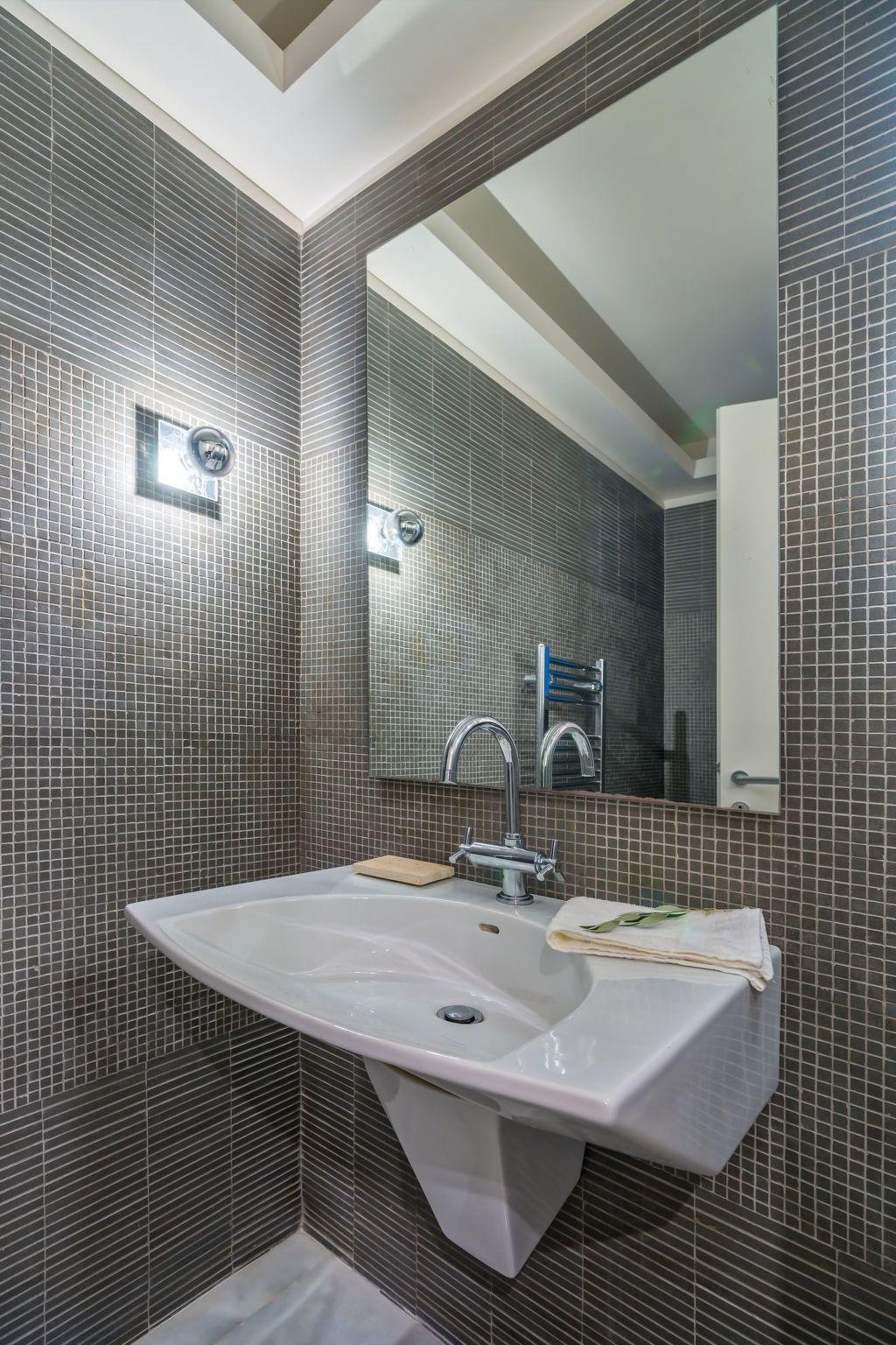The villa itself spans an impressive 315 sq.m. across three exquisitely designed levels. The basement serves as the primary entrance, welcoming you into a spacious living room that opens onto the main balcony. The left side presents a cozy sitting area equipped with two couches and a TV, while to the right, you'll find a stunning open-plan kitchen, fully equipped for all your culinary needs, and a dining area capable of seating 8 people comfortably. For those who prefer dining alfresco, the veranda offers another dining setup with immediate access to the enchanting garden.