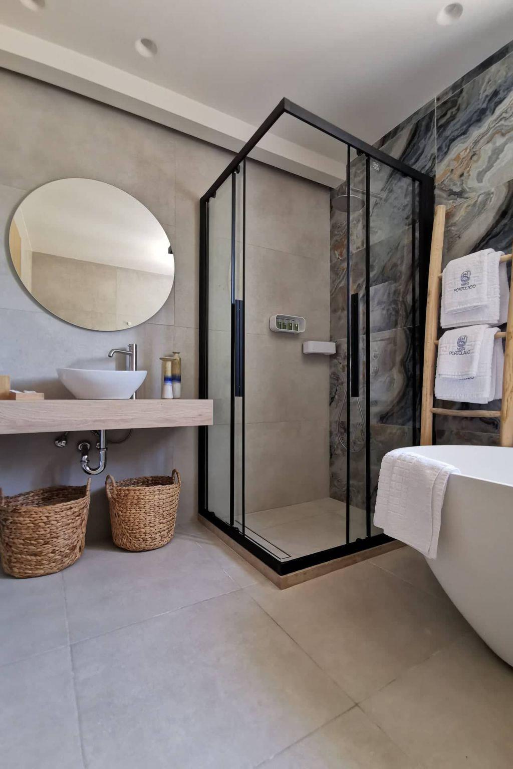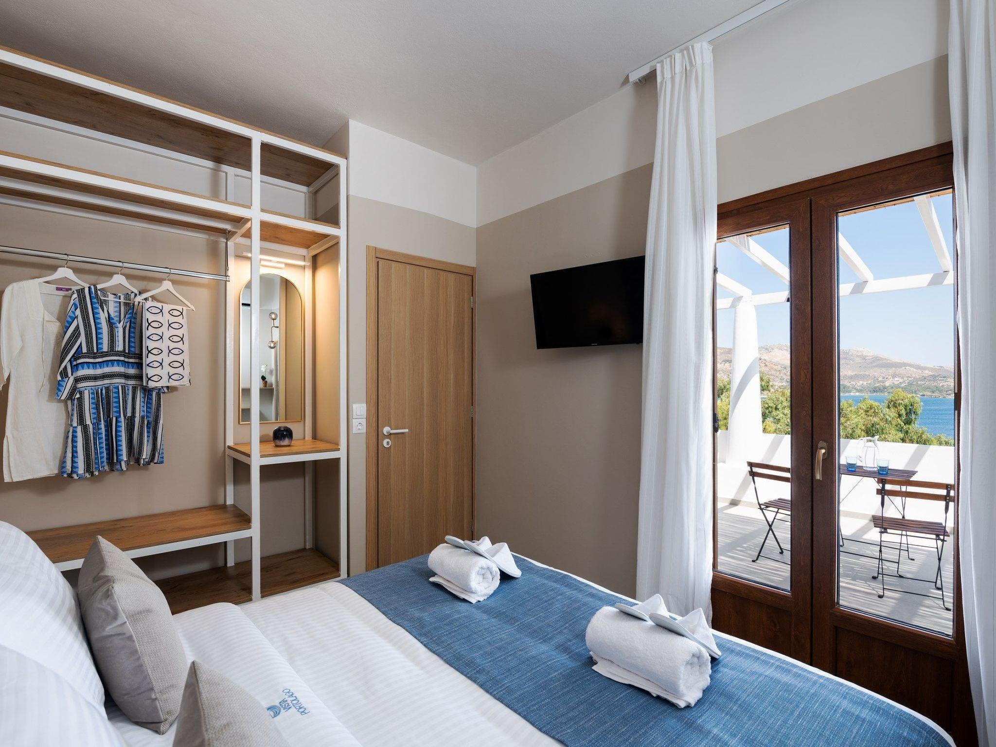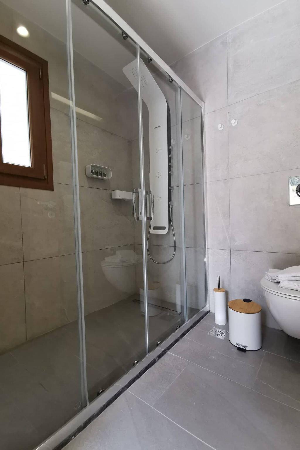 The interior of the villa is elegant as well as functional with a modern minimal decoration. Two bedrooms, one located in the ground floor with 2 single beds that can be used as a double, balcony with side view to the bay and the second one located in the first floor with one double bed and access to sunny terrace overlooking the bay. Both bedrooms are eqquiped with open closets, air condition and HD tvs. .Two bathrooms, one located in the ground floor eqquiped with hydromassage shower column and one in the first floor with free style bathtub. Both bathrooms have shower cabins.Living room located in the ground floor, eqquiped with a 3 seated sofa bed and a modern relaxing armchair, opening to a stonebuilt balcony with uninterrupted views. Plus there is a fully-equipped bright kitchen with an oven, microwave, coffee machine and a dining area.Washing machine and small wc available on the basement.