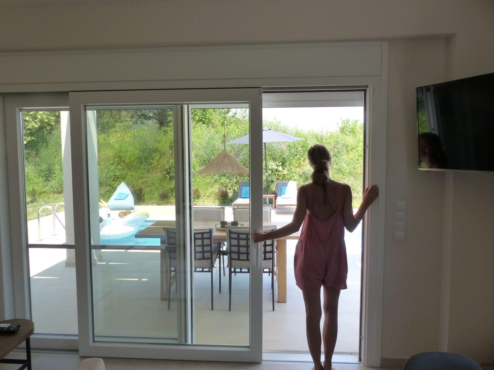 Very large terrace on 2 sides of the house. The swimming pool is embedded. Cosy loungers, pergola, dining area - from everywhere you have a wonderful view of the landscape and the mountains.