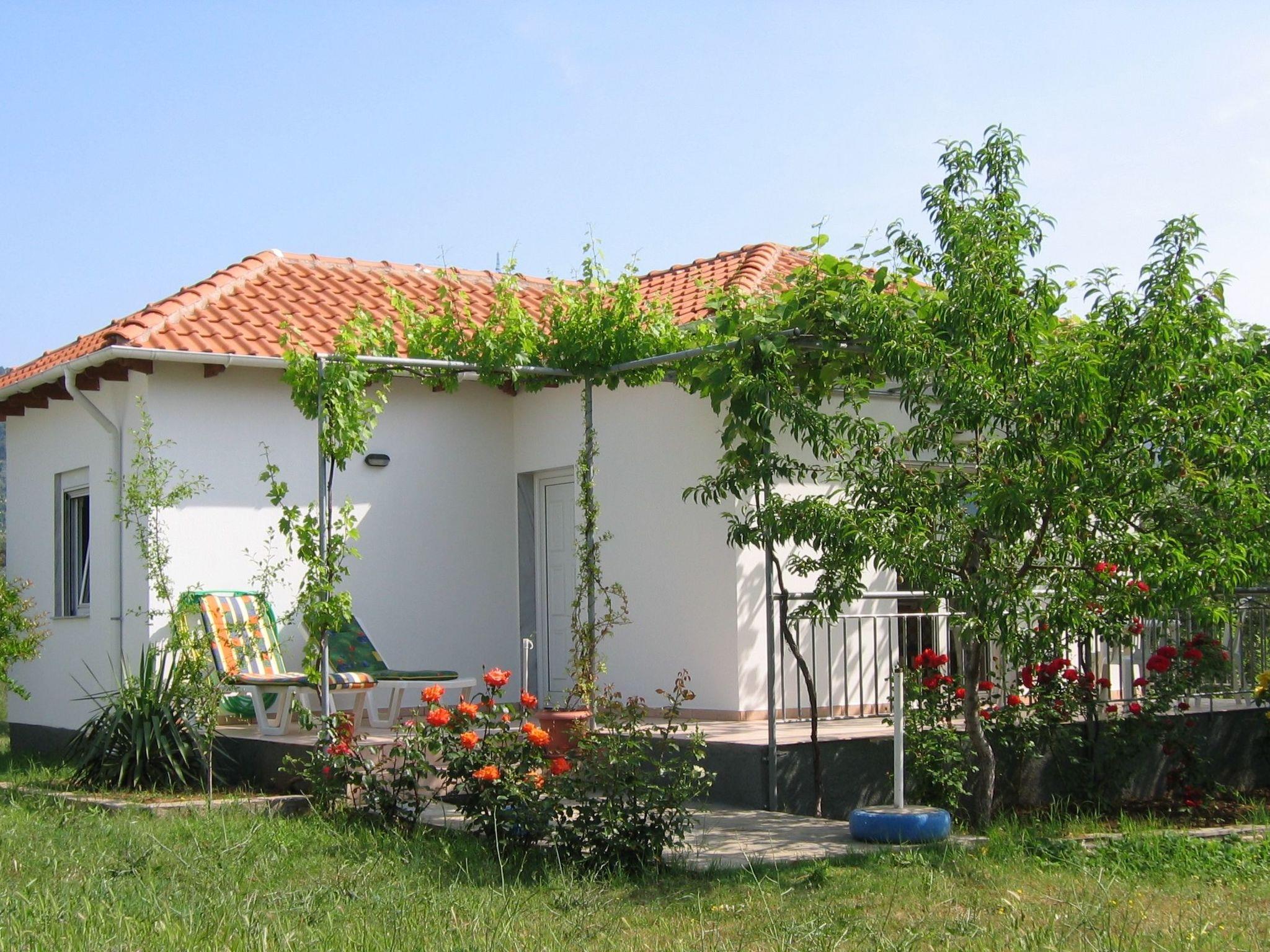 The house is surrounded by a large terrace and a beautifully landscaped garden with colourful roses. The terrace is furnished with a table, chairs, a parasol and two garden loungers. Here you can end the day with a cosy barbecue and enjoy the impressive view of the surrounding mountain landscape. During the day, a vine arbour provides plenty of shade on the terrace. The swimming pool of a hotel is hidden behind olive trees approx. 30 metres away and can be used communally at any time. Your holiday accommodation also includes two private outdoor parking spaces.