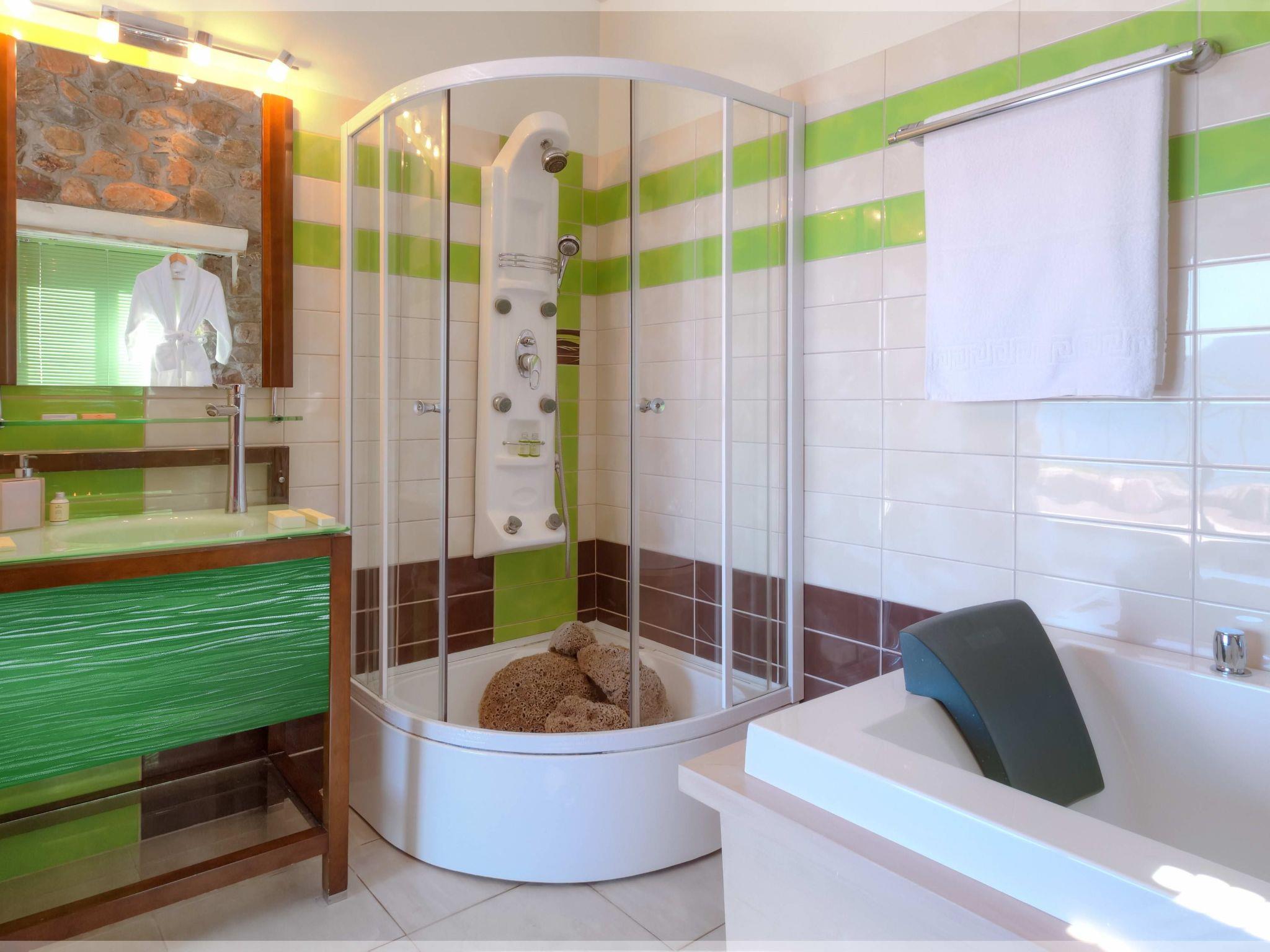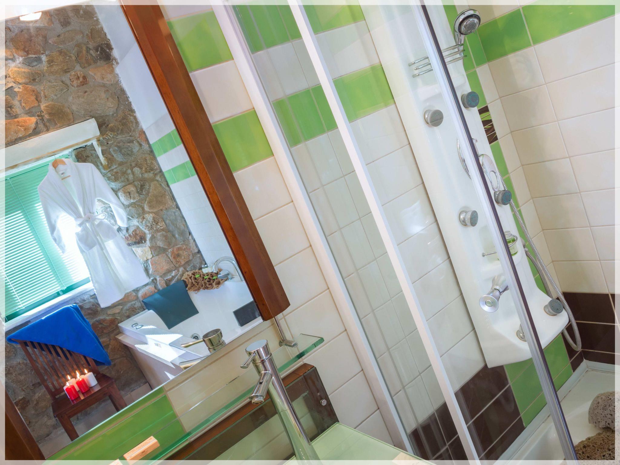 Stepping outside where a 4x2.5 meter pool awaits. The outdoor space of our villa offers panoramic views of the sea, providing the perfect backdrop for unwinding and appreciating the beauty of the surroundings. Exclusive amenities such as a BBQ and an outdoor shower enhance your experience, ensuring a truly luxurious seaside getaway.