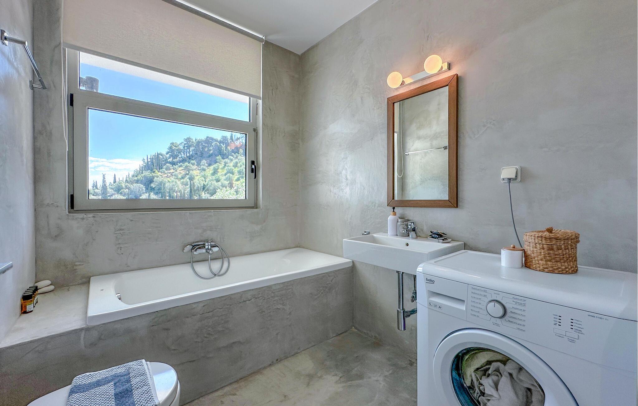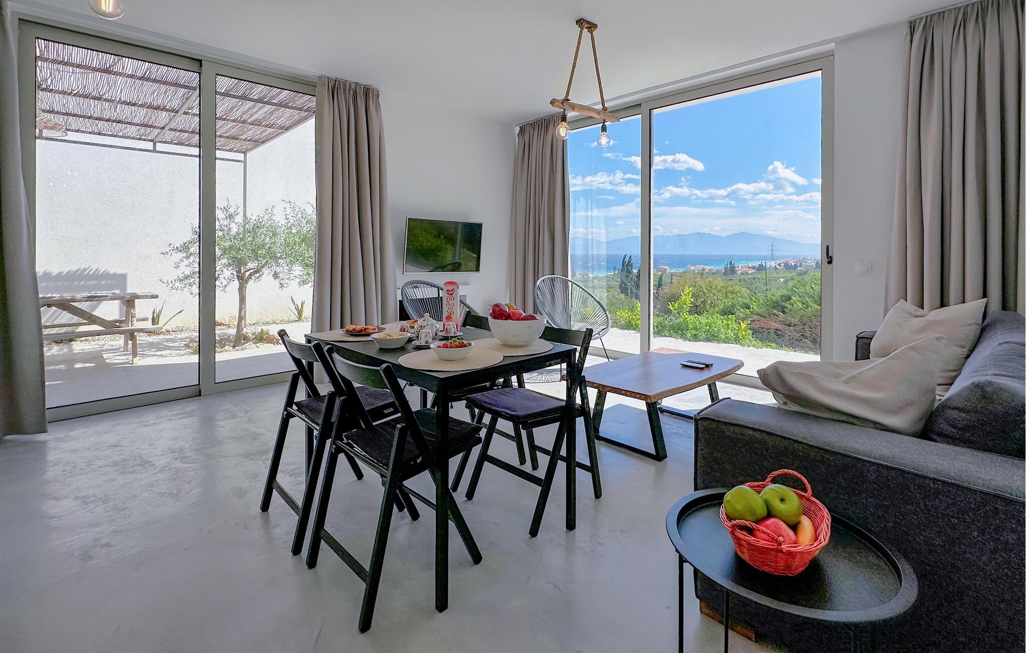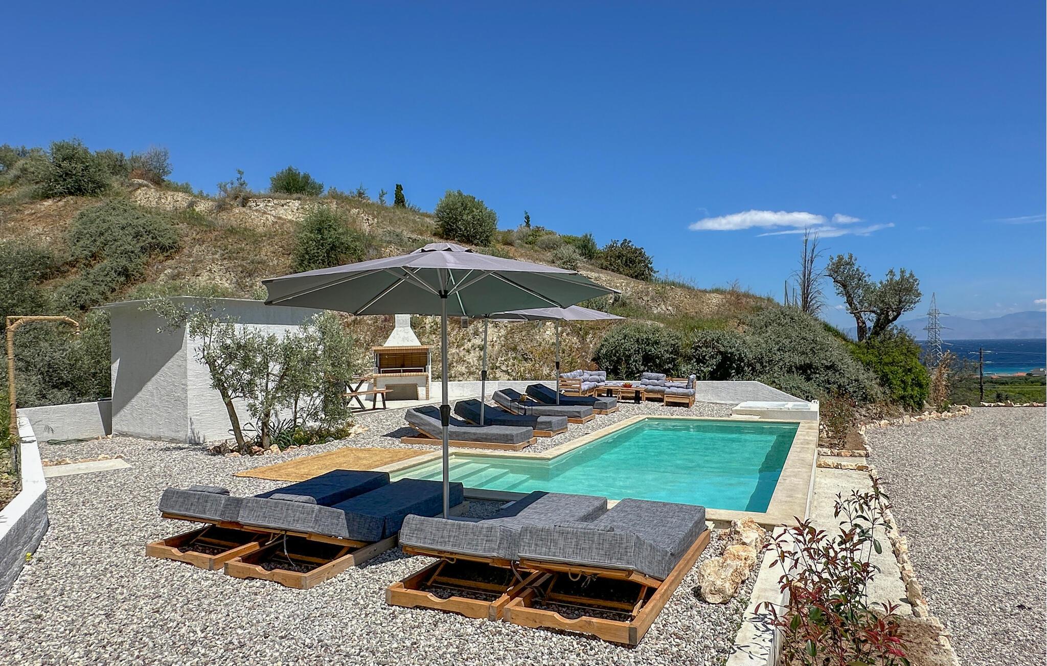 Oplev en solrig ferie i dette komfortable feriehus med havudsigt og adgang til poolen. Dette moderne feriehus forkæler jer med en smuk udsigt over Korinthbugten og byder jer velkommen med en lys og stilfuldt møbleret opholdsstue. Nyd udsigten, mens I spiser, takket være de store vinduer, og planlæg jeres aktiviteter i den friske atmosfære i det åbne opholdsområde. Efter en lang dag kan I streame en film på sofaen eller udfordre jer selv til et brætspil. Den skyggefulde terrasse er det ideelle sted til en lækker morgenmad. På varme dage kan I forfriske jer i den fælles pool og nyde solen på de behagelige liggestole. Hyg jer omkring grillen og snak over græsk vin i den lune sommernat. Vandr gennem de fantastiske Helmos-bjerge og oplev skjulte vandfald, eller slentre langs den maleriske promenade i Xylokastro med dens traditionelle tavernaer. Hold en picnic under fyrretræerne i Pefkias-skoven ved havet, tag den historiske tandhjulsbane gennem den betagende Vouraikos-kløft, eller tag en dagstur til det gamle Korinth.
