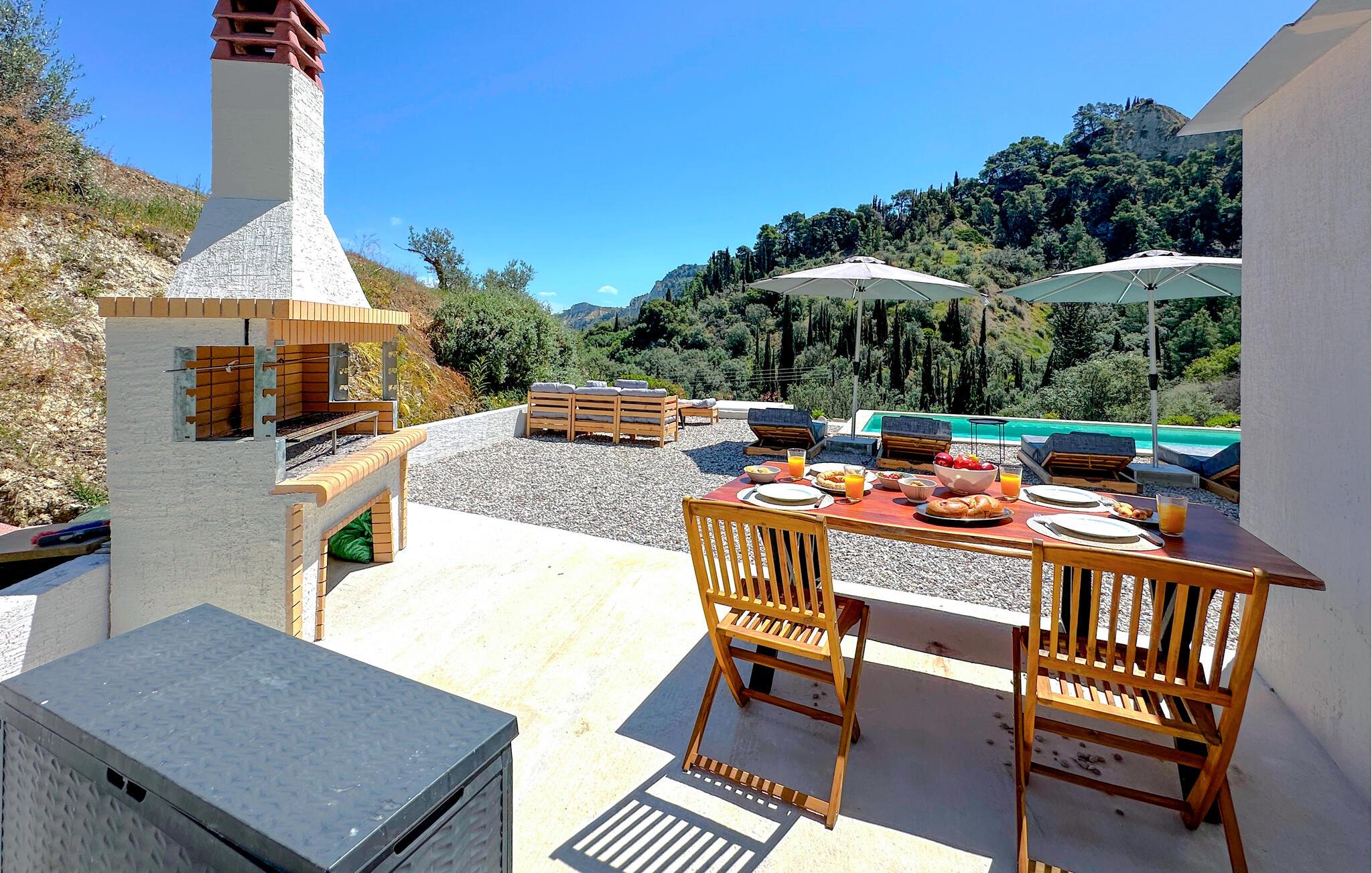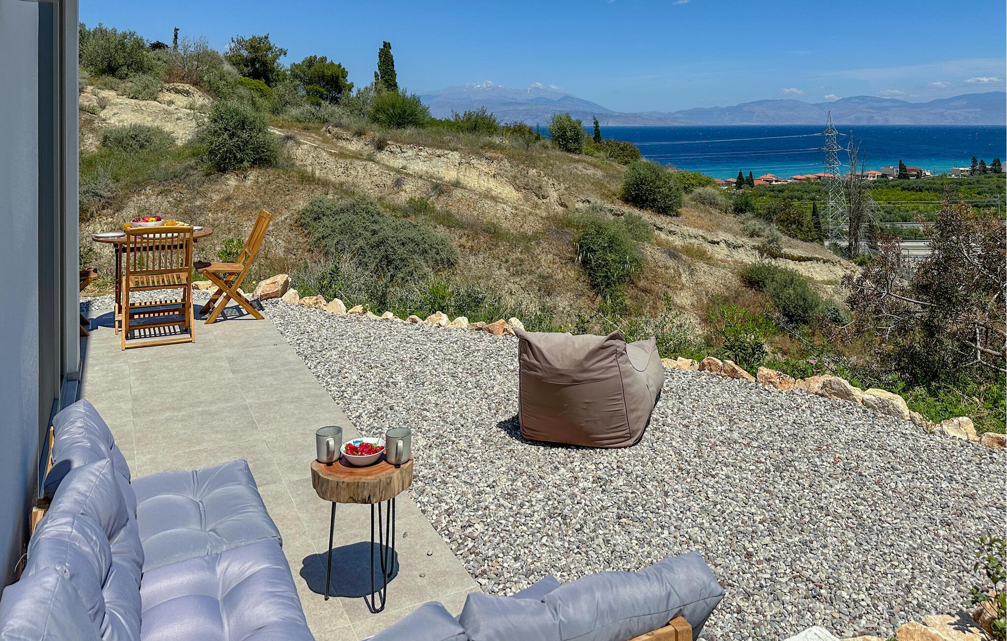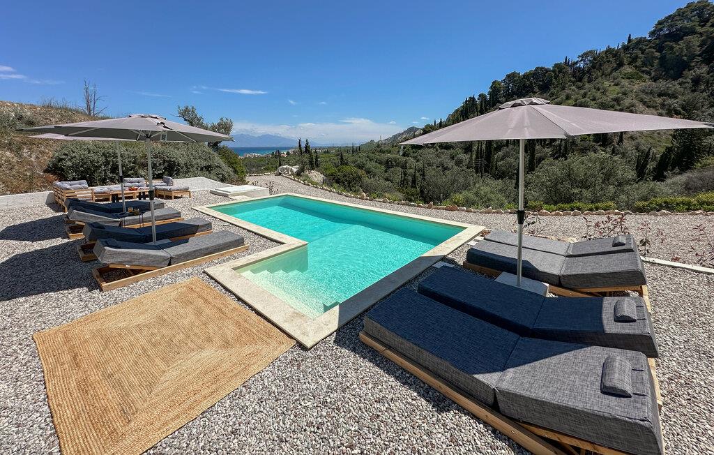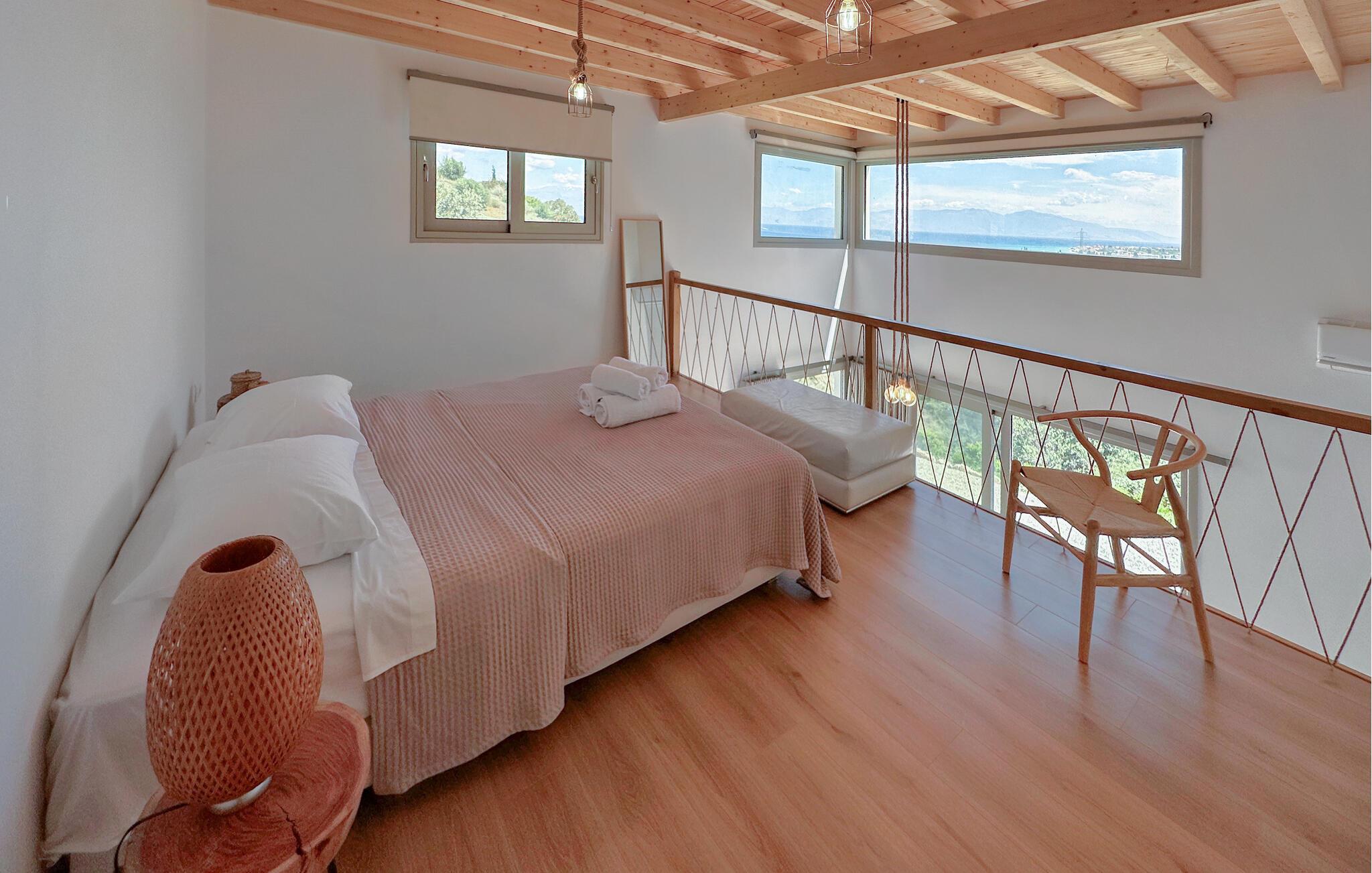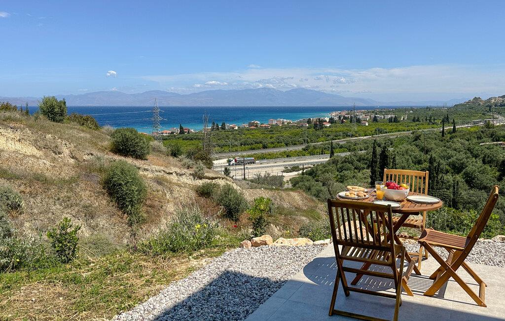 Oplev afslappende dage i dette komfortable feriehus med havudsigt og adgang til poolen. Dette moderne feriehus forkæler jer med en smuk udsigt over Korinthbugten og byder jer velkommen med et lyst og stilfuldt interiør. Glæd jer til harmoniske måltider og planlæg jeres aktiviteter i den friske atmosfære i det åbne opholdsrum. Efter en lang dag kan I streame en film på sofaen eller udfordre jer selv til et brætspil. Den åbne terrasse er det ideelle sted til en dejlig morgenmad udendørs. Forfrisk jer i den fælles pool og nyd solen på de behagelige liggestole. Hyg jer omkring grillen og snak over græsk vin i den lune sommernat. Vandr gennem de fantastiske Helmos-bjerge og oplev skjulte vandfald, eller slentre langs den maleriske promenade i Xylokastro med dens traditionelle tavernaer. Hold en picnic under fyrretræerne i Pefkias-skoven ved havet, tag den historiske tandhjulsbane gennem den betagende Vouraikos-kløft, eller tag en dagstur til det gamle Korinth.
