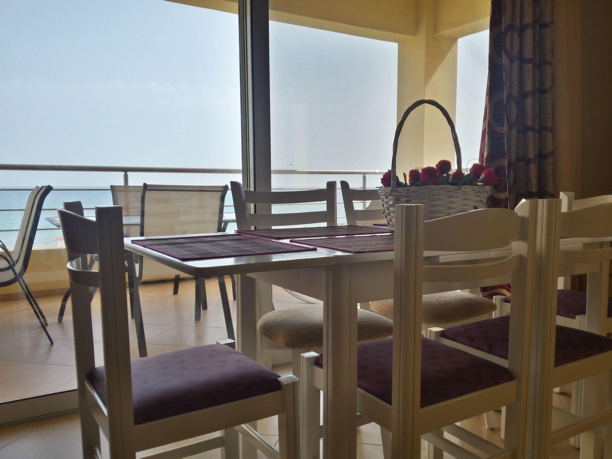 The apartment spreads over two levels. It comprises of the following rooms: A living room, a flatscreen TV, a double sofa, and a three-seater sofa. In addition there is a big veranda which is equipped with a table and chairs with sea view. There is also a bedroom, which includes two single beds. Plus there is a fully-equipped kitchen with an oven, microwave, coffee machine, kettle and a dining area, as well as a bathroom with a shower. The upper level is about 55 m² in size and comprises of the following rooms: Three bedrooms and a bathroom with a shower. The first bedroom has a double bed with a garden view balcony, the second bedroom has two single beds with a sea view balcony and the third bedroom has also two single beds.