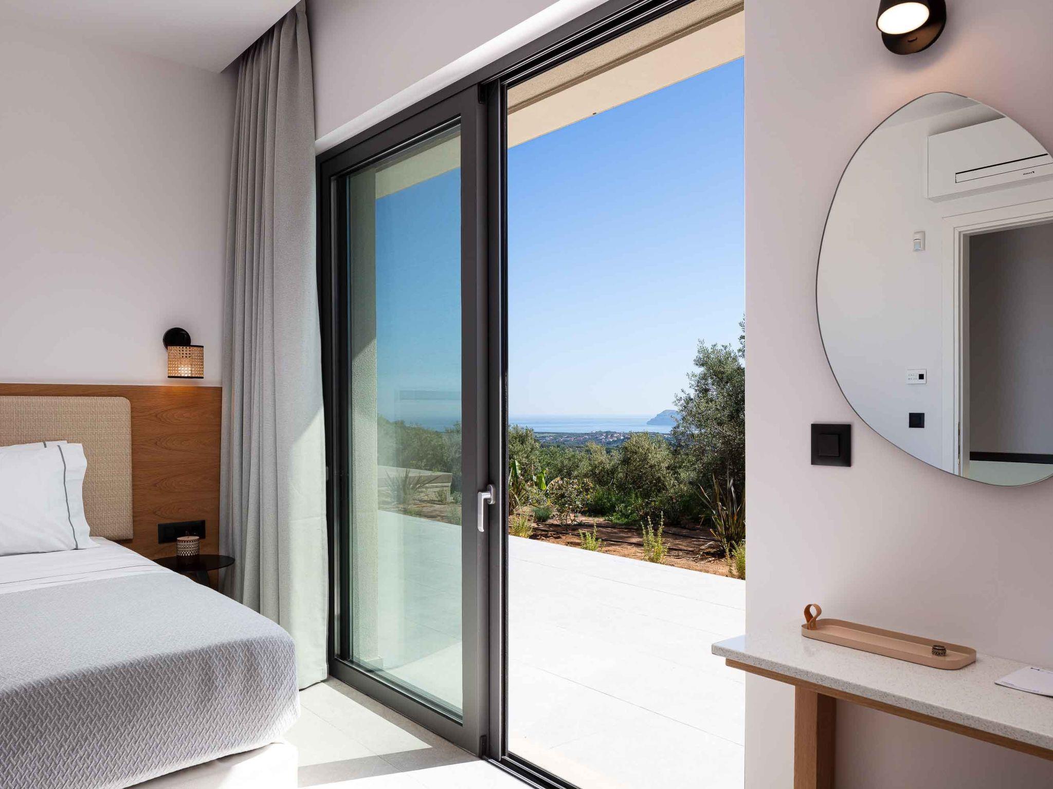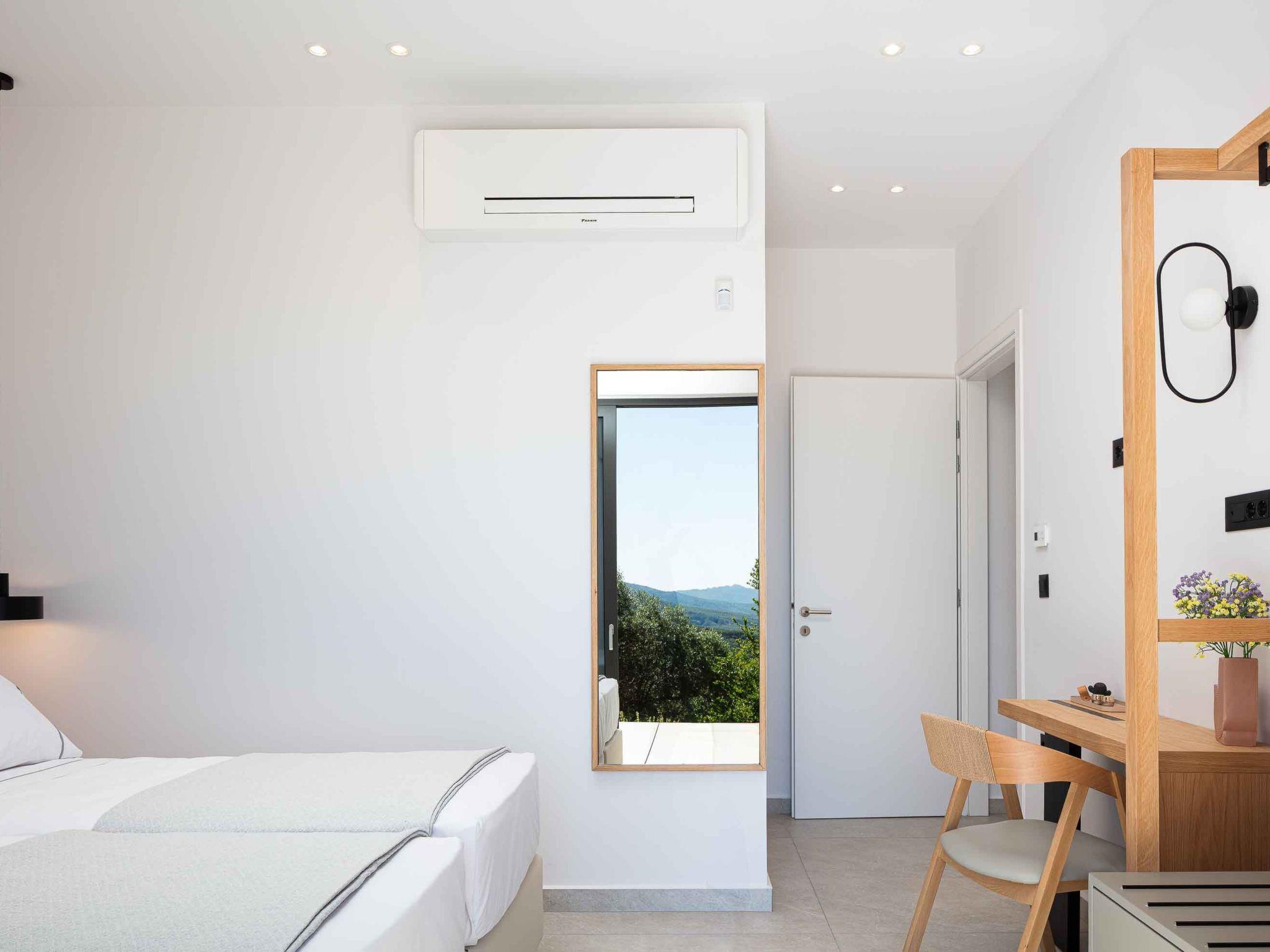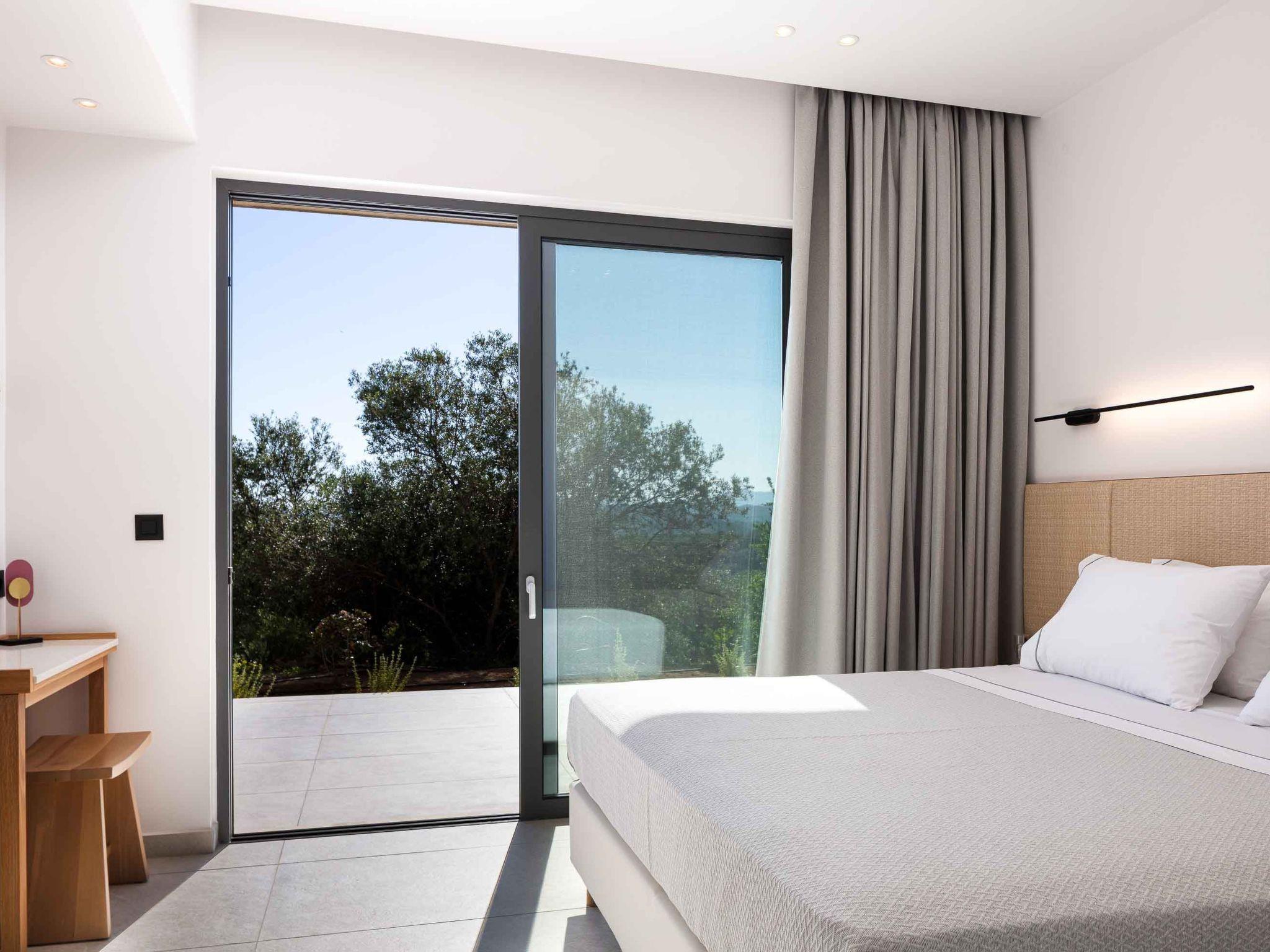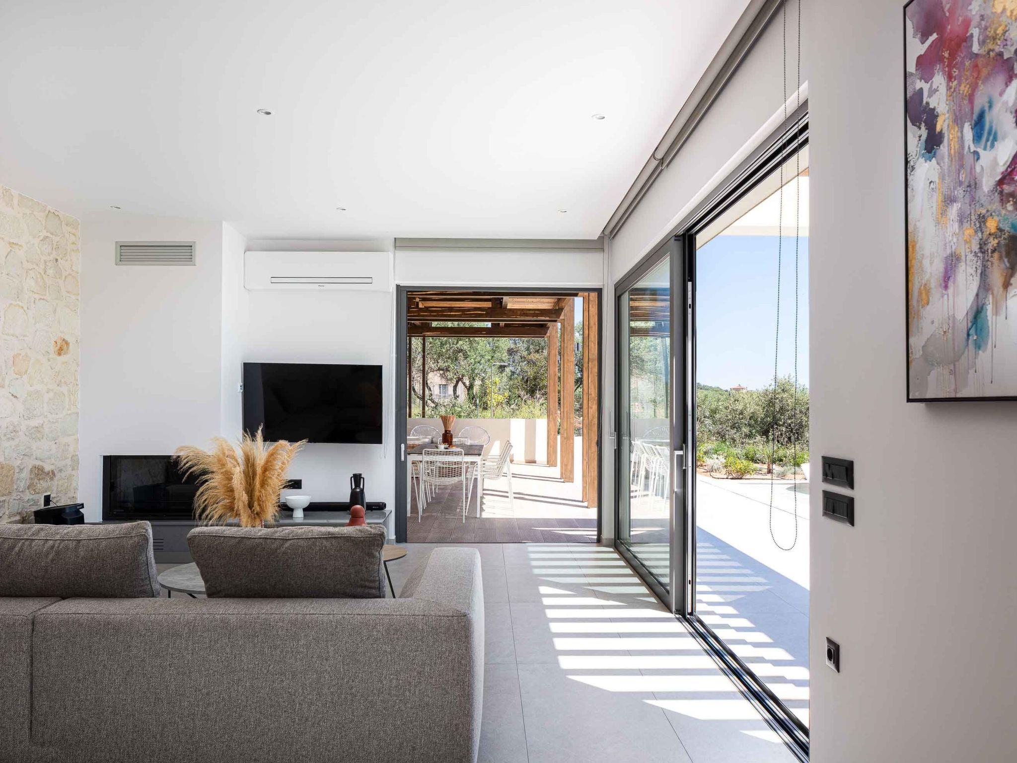 Villa Aglaea is set on one floor, covering 157 sq.m. in total and it accommodates 6 guests in its 3 ensuite bedrooms. Sleek, monochrome and practical, combining the wooden element with the earthy stone, Villa Aglaea invokes a sense of calm, something that makes staying here feel like a proper treat! Entering through its airy open-plan living space, you will be amazed by how the contemporary and fresh interior balances neutral tones, and hues of beige with textures creating the perfect spot for you and your loved ones. The lounge area wraps around the fireplace and the 55” Smart Satellite TV includes a sofa seating large enough for the entire family or friends. Unfolding across one floor, the large windows create a bright, airy living space waiting for you while in the meantime, a few steps further a fully equipped kitchen is found. The same area consists of three bedrooms, spread all over the left side of the villa, with en-suite bathrooms all with showers, adequate for you and your loved ones after a long day in the sun. Not far from this area, there is an extra communal WC, which is suitable for every guest here. There are two yoga mattresses for yoga lovers.