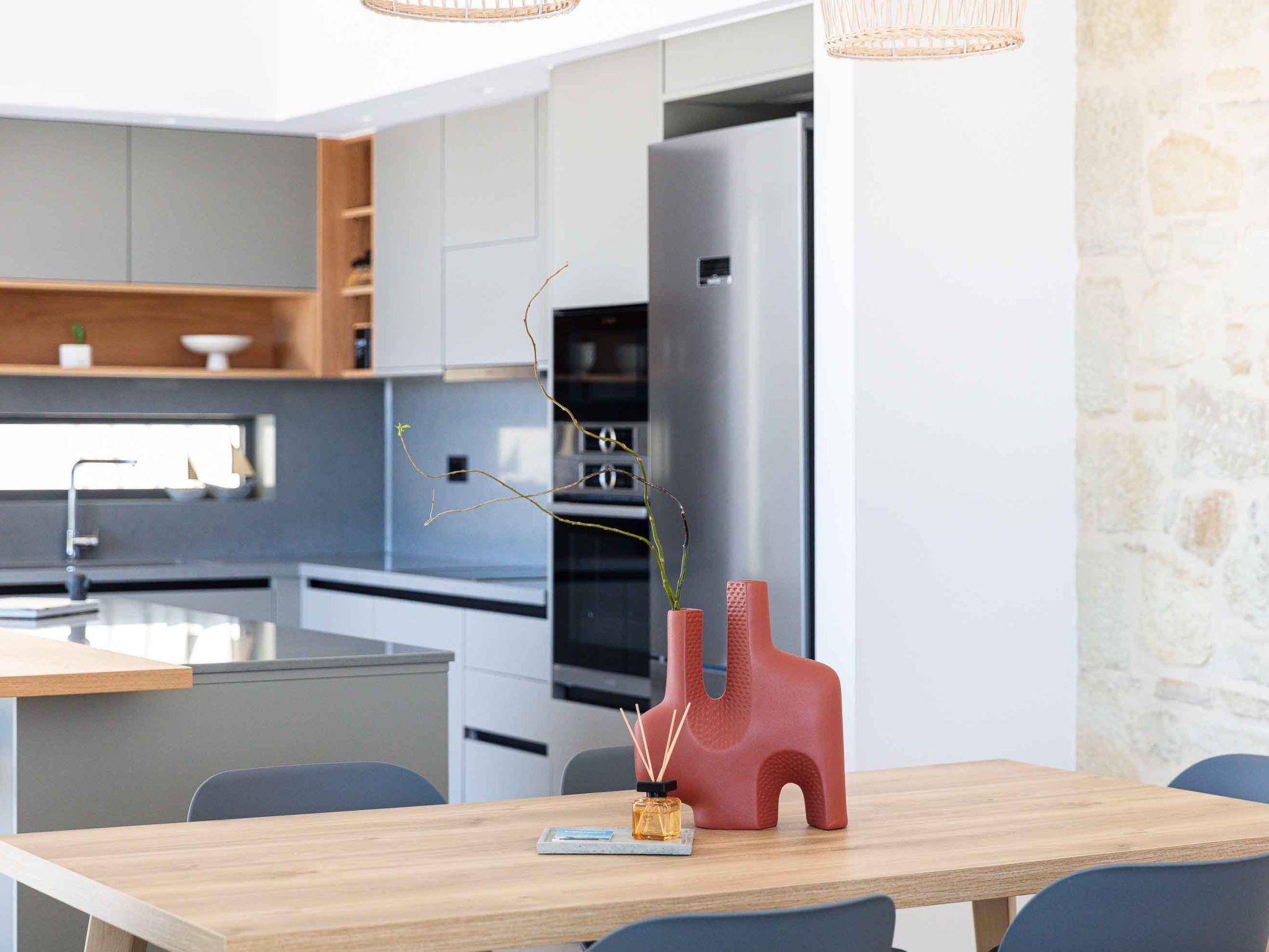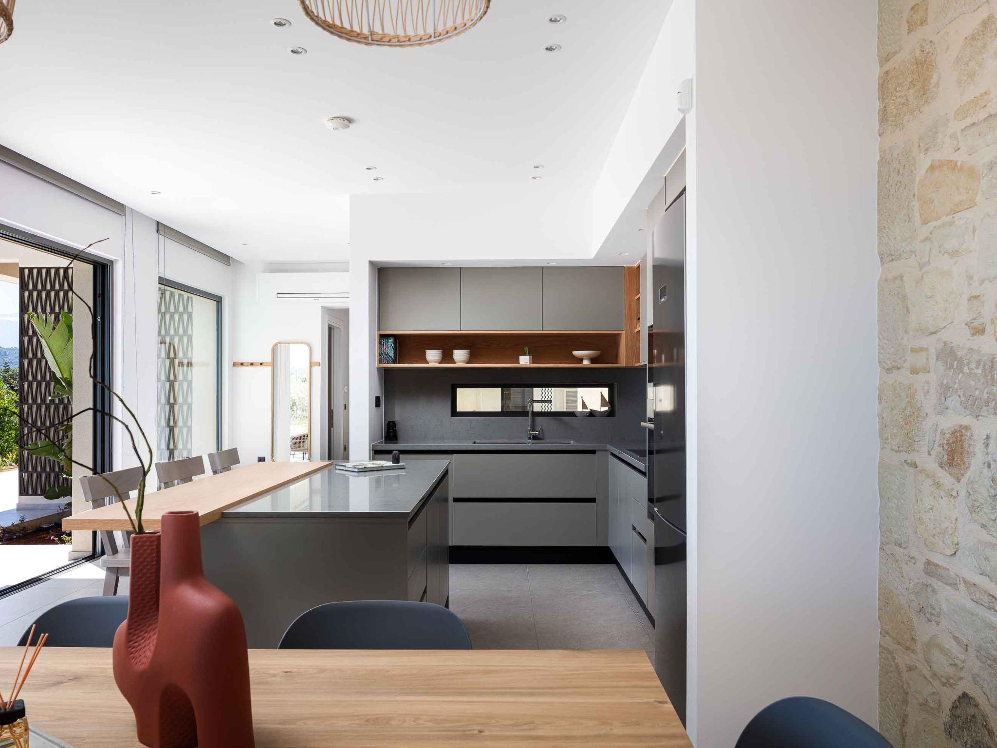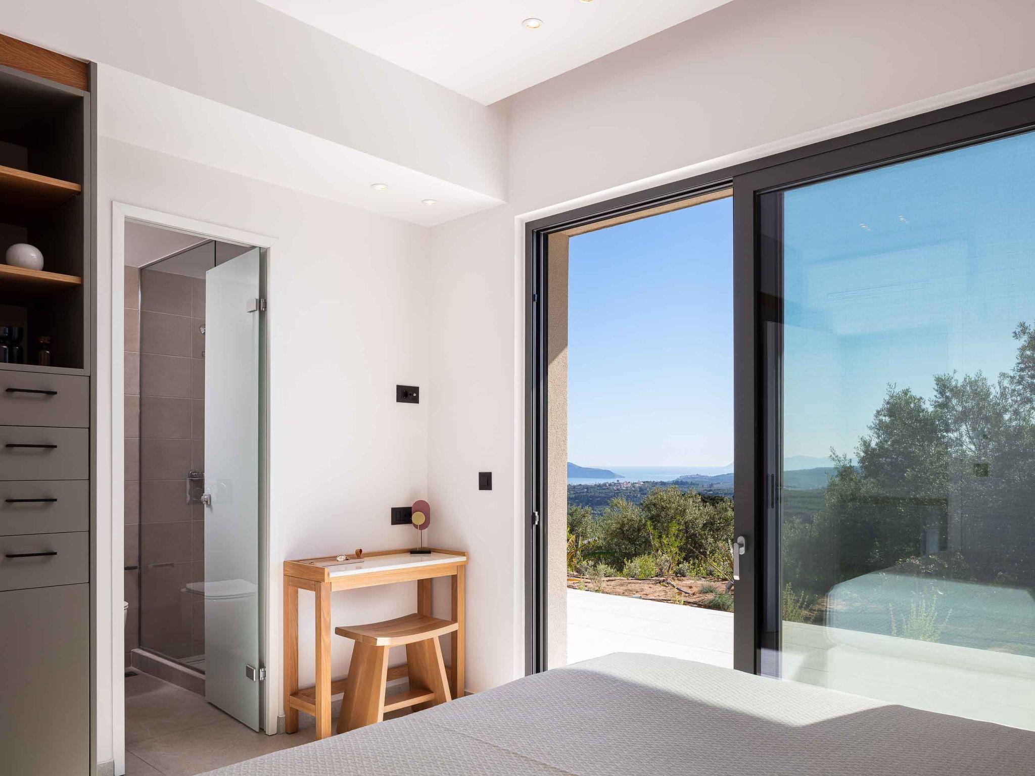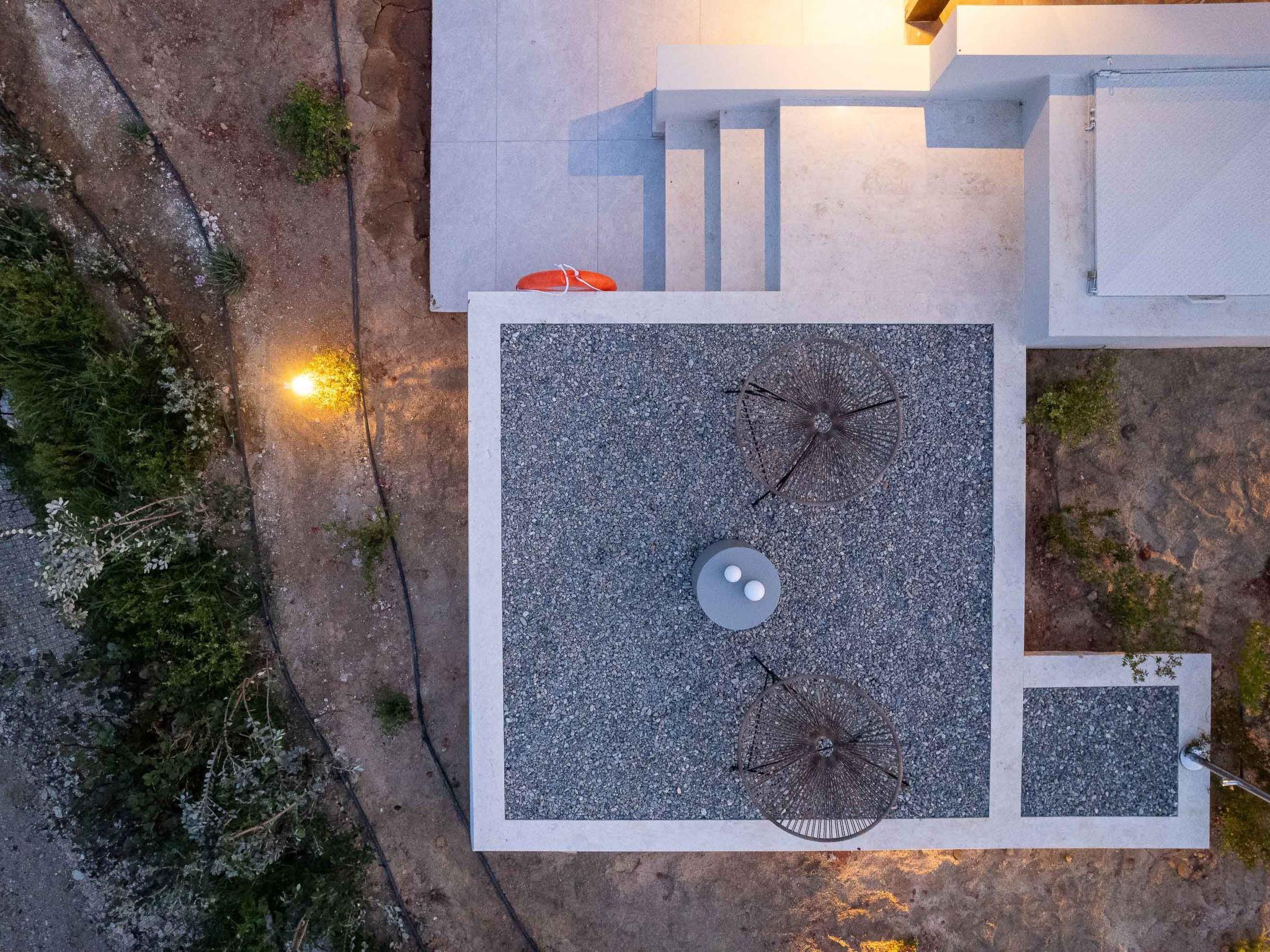 Villa Aglaea is set on one floor, covering 157 sq.m. in total and it accommodates 6 guests in its 3 ensuite bedrooms. Sleek, monochrome and practical, combining the wooden element with the earthy stone, Villa Aglaea invokes a sense of calm, something that makes staying here feel like a proper treat! Entering through its airy open-plan living space, you will be amazed by how the contemporary and fresh interior balances neutral tones, and hues of beige with textures creating the perfect spot for you and your loved ones. The lounge area wraps around the fireplace and the 55” Smart Satellite TV includes a sofa seating large enough for the entire family or friends. Unfolding across one floor, the large windows create a bright, airy living space waiting for you while in the meantime, a few steps further a fully equipped kitchen is found. The same area consists of three bedrooms, spread all over the left side of the villa, with en-suite bathrooms all with showers, adequate for you and your loved ones after a long day in the sun. Not far from this area, there is an extra communal WC, which is suitable for every guest here. There are two yoga mattresses for yoga lovers.