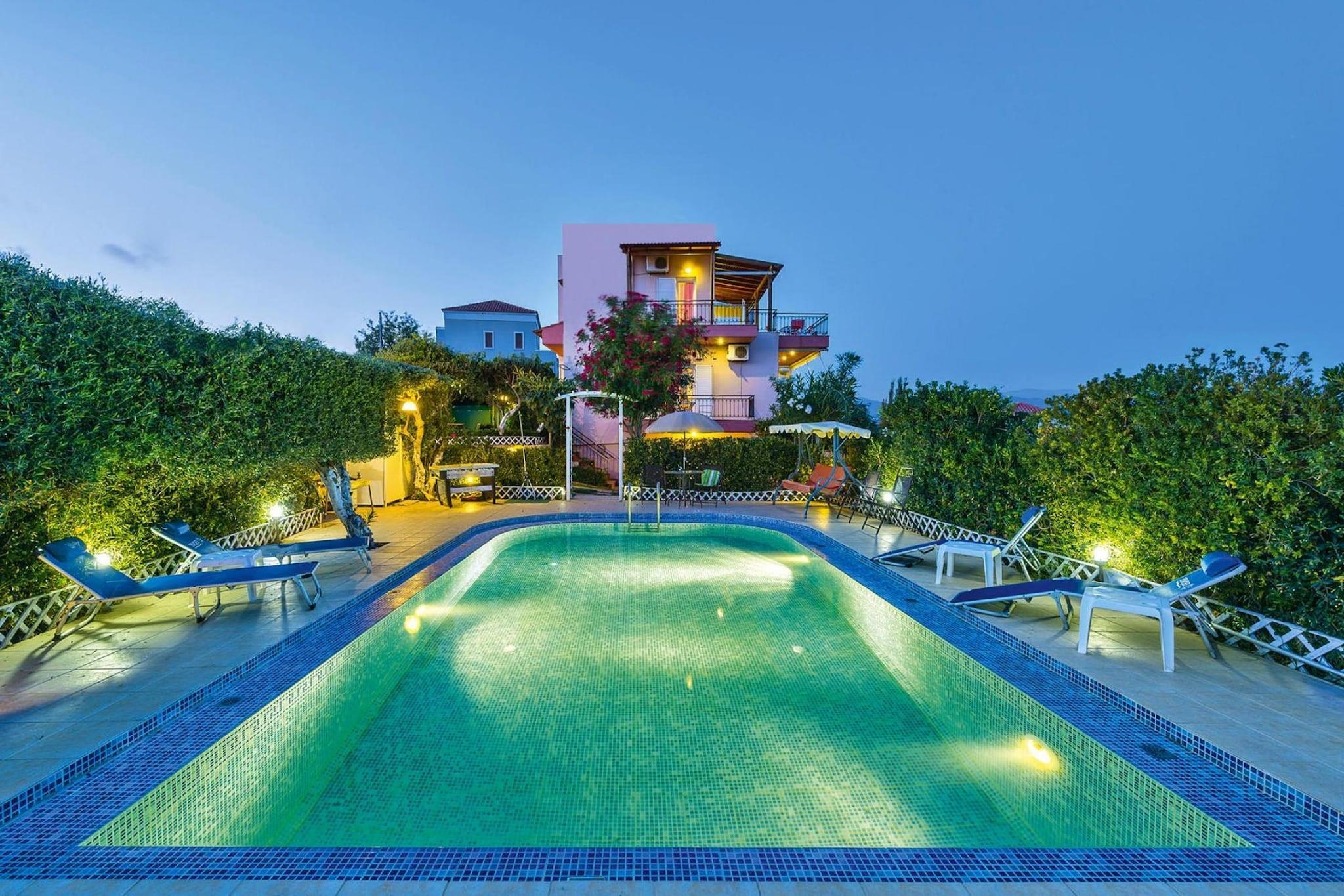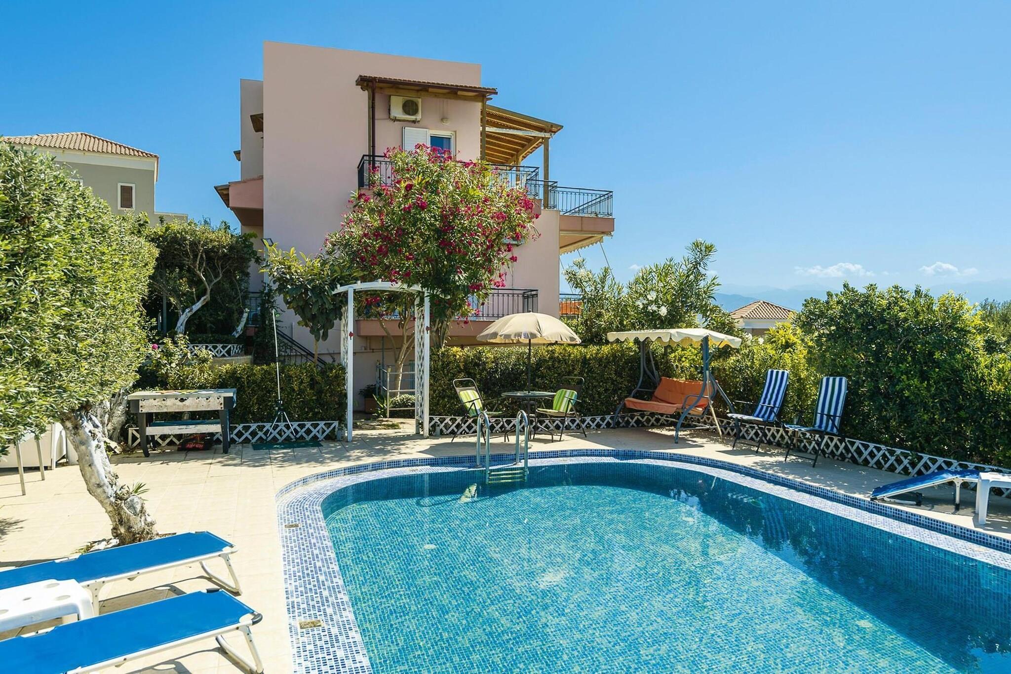 Det komfortable feriehus med privat pool ligger på en bakke over turistbyen Kolimbari og har en smuk panoramaudsigt over havet. Du kan slappe af i den smukt bevoksede have med solterrasse, liggestole og parasoller. Kolimbari-stranden samt restauranter, caféer og butikker ligger 2 km derfra. Detaljer: forbrugsbaserede energiomkostninger, sengelinned, håndklæder, slutrengøring