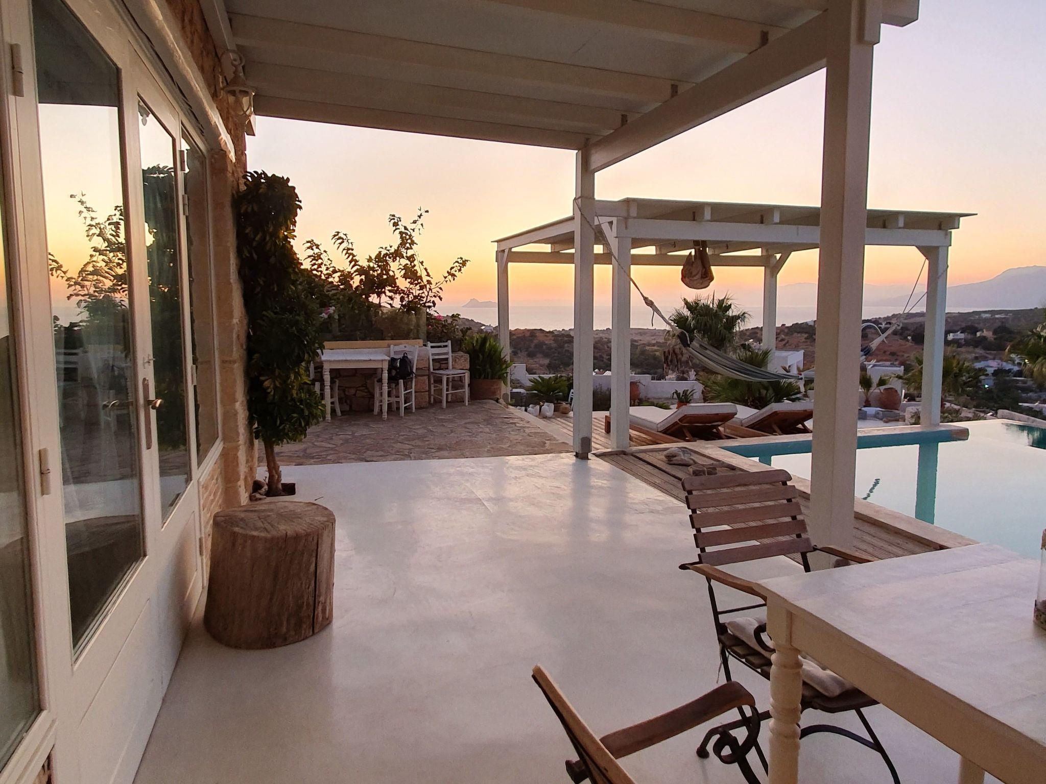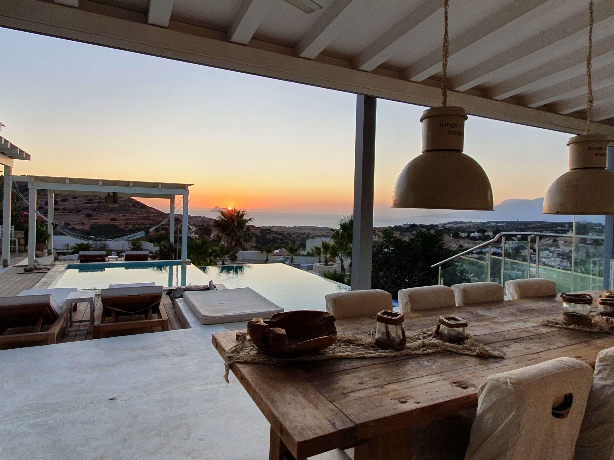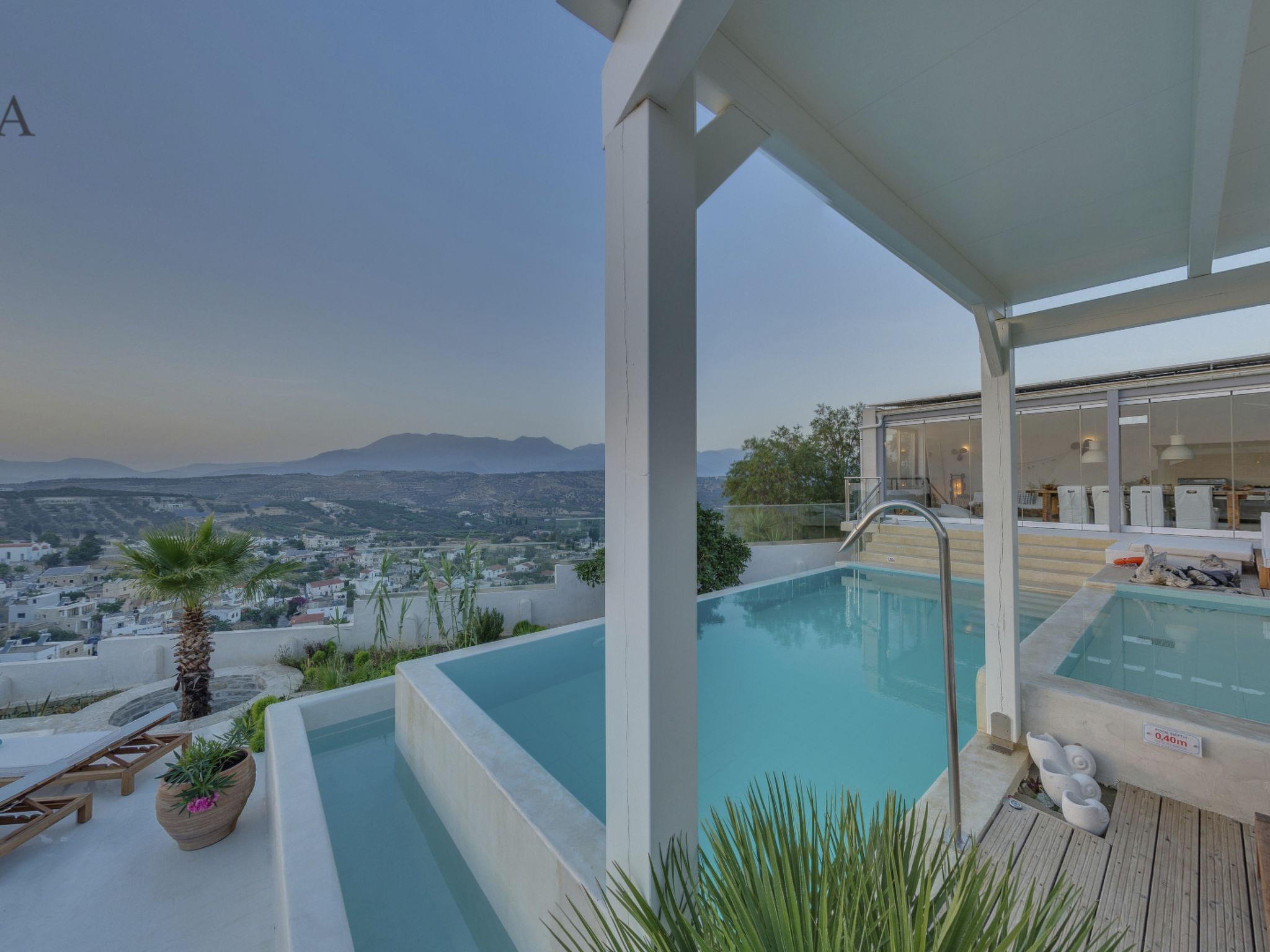 Luxury domicile with sea view to the Libyan Sea, mountain panorama Psiloritis as well as the Messara plain, top location on the mountain above Pitsidia, detached, fascinating 360° view, lots of light, bright and high rooms, natural stone and modern, alternate harmoniously with glass, on 350m² living space.