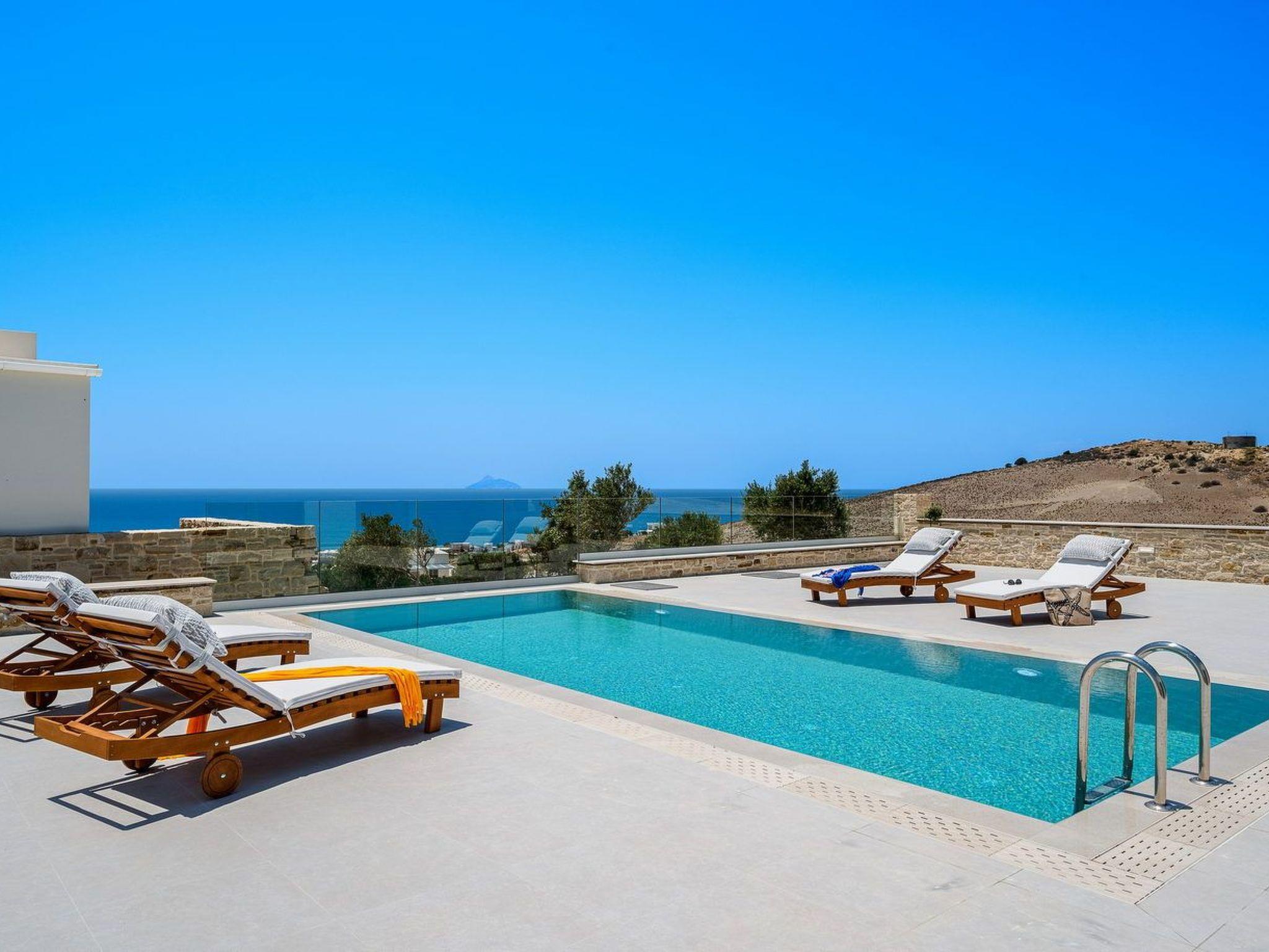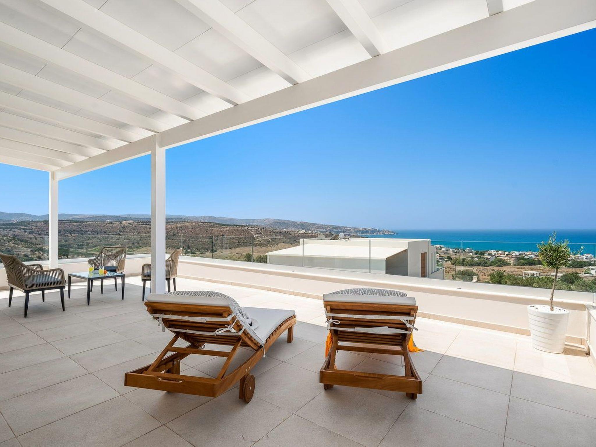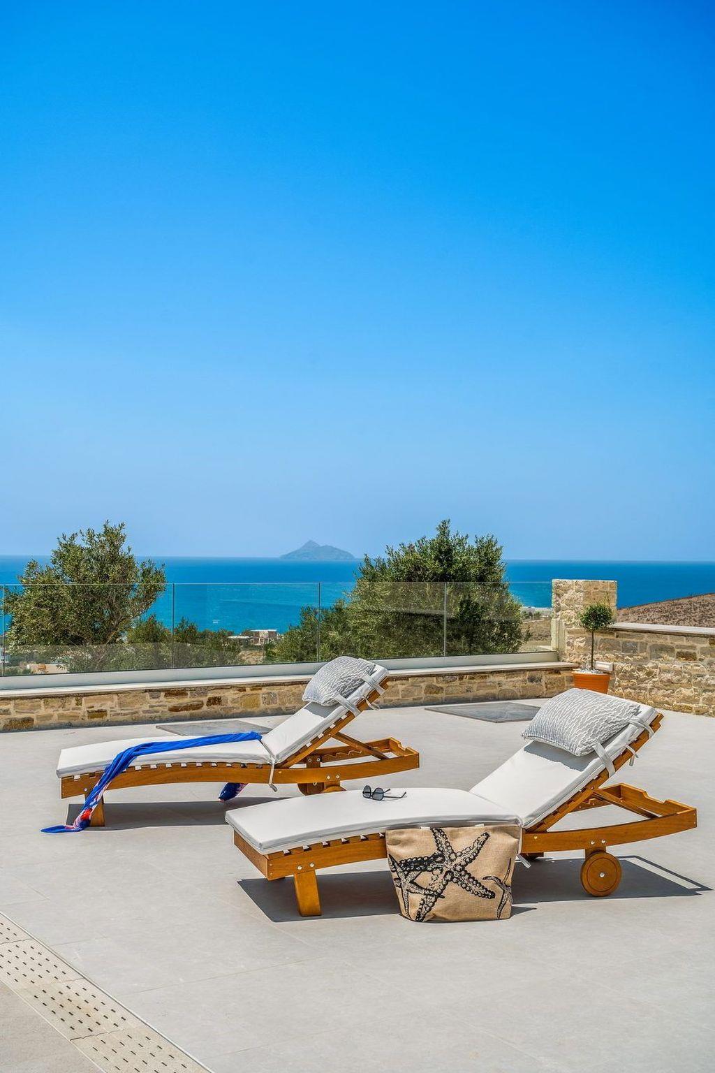 In the villa you will find a modern interior design on two levels with a total of 150m² of living space and a 50m² balcony, ideal for 4-6 people. The upper floor contains an inviting eat-in kitchen with smart home technology, sofa bed, high-quality kitchen equipment, dining table and panoramic windows that flood the room with light and bring the fascinating sea view directly into your living room. A staircase leads to the 3 spacious bedrooms on the lower floor, each equipped with king-size beds, Smart TV, fan coil air conditioning and an en-suite shower room, each with access to the pool and outdoor kitchen.