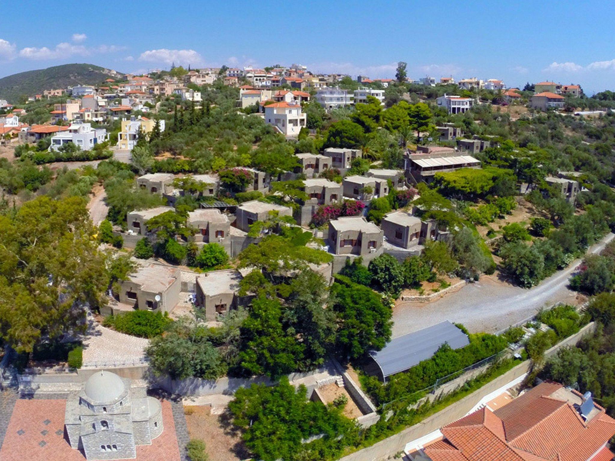 The architectural style of the bungalows is modelled on the castle houses of Mani and thus conveys a special atmosphere. The bungalows are situated along narrow footpaths with flowerbeds and trees and each has a front courtyard from which there is a marvellous view of the deep blue sea.