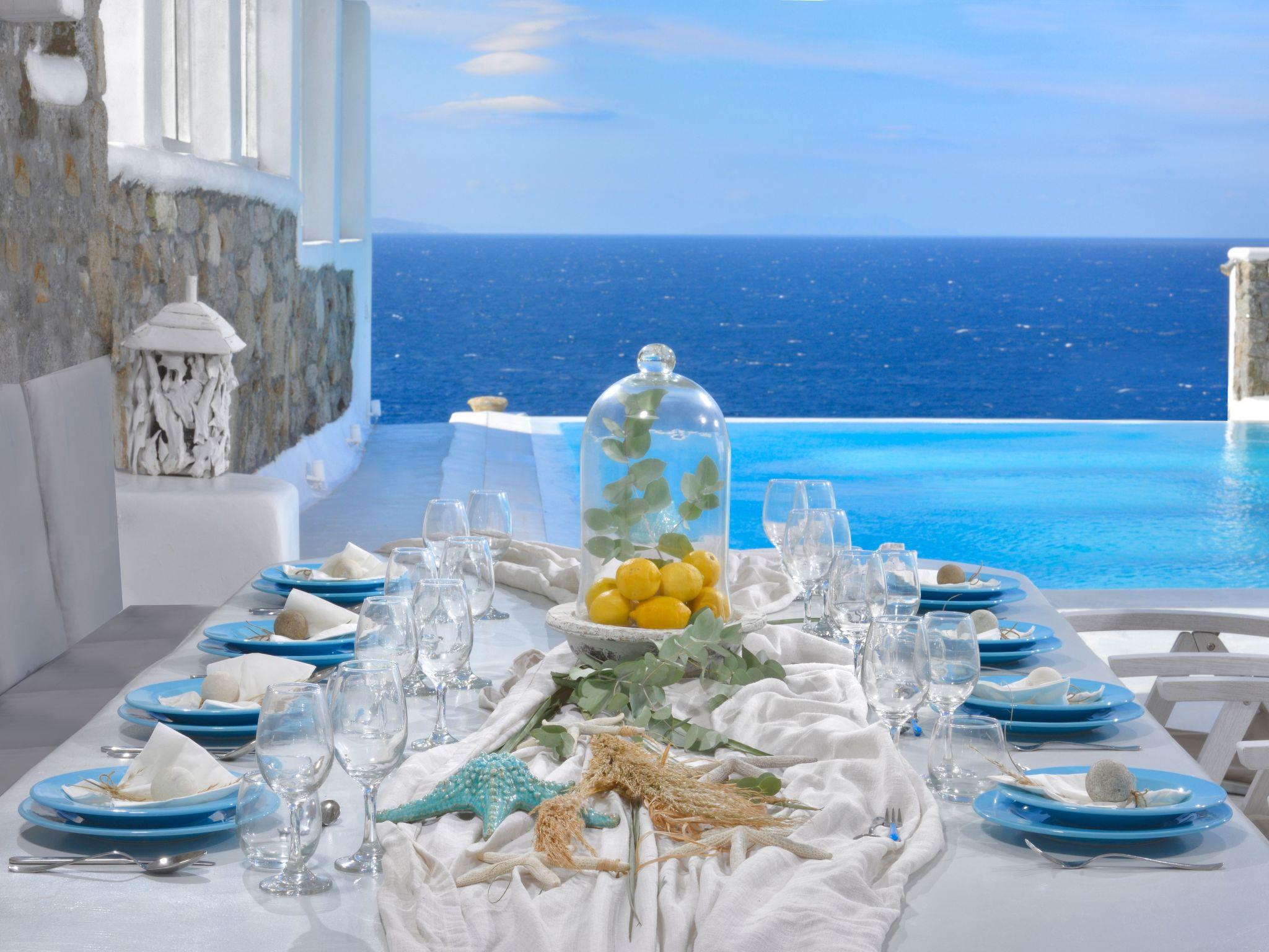 The villa has 180 degrees sea views, spacious terraces, a large infinity edged swimming pool with a pergola-covered outdoor dining area, huge dining table made of rock for 20 persons, two large built in seating areas and comfortable sun beds.
