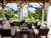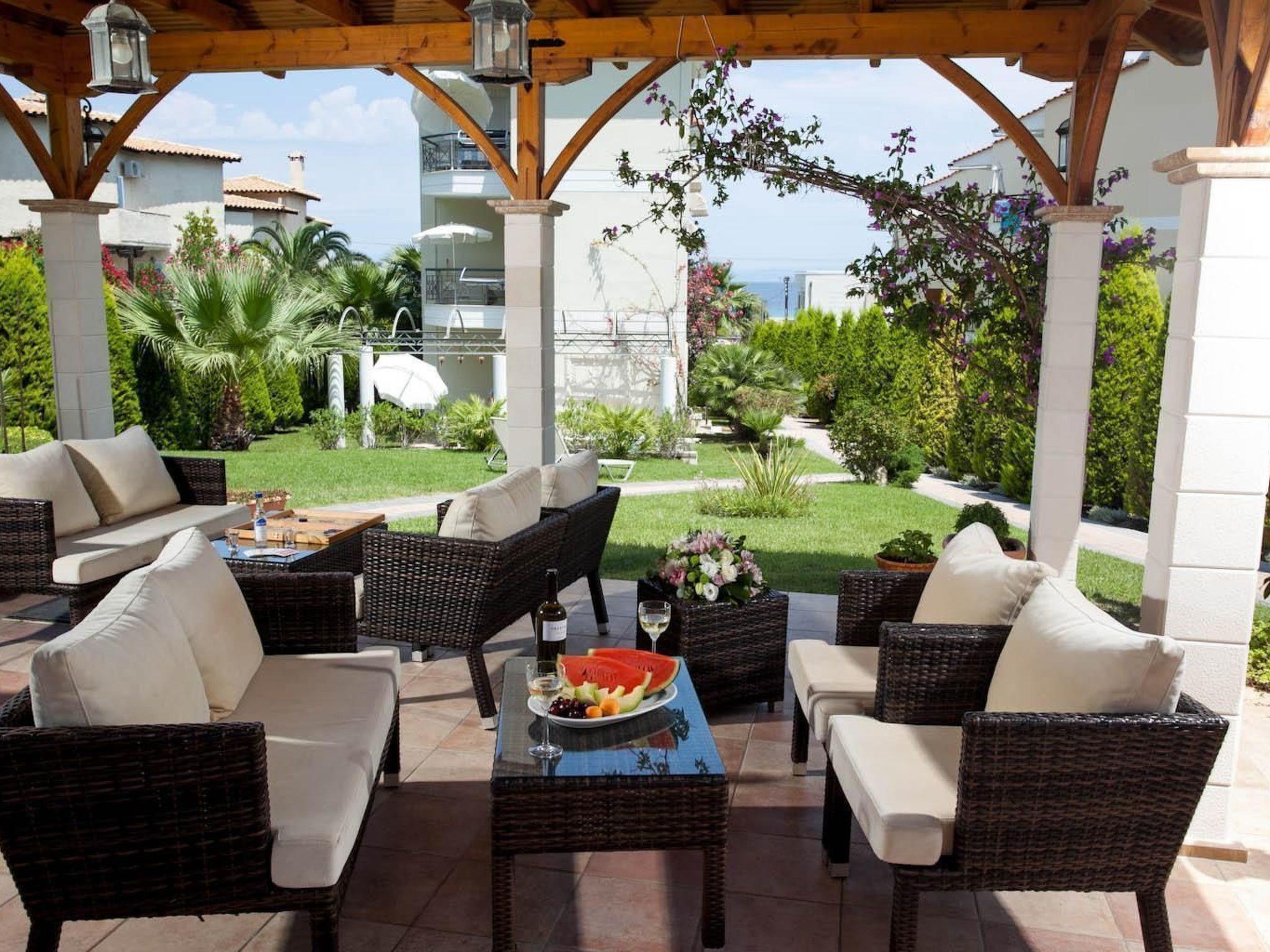 A park-like garden welcomes you with spacious grassy areas as well as cypresses, shrubs and palm trees. A large pergola and an outdoor barbecue invite you to eat and enjoy al fresco dining. Enjoy the beautiful weather on the communal terrace. The terrace is equipped with garden furniture, parasol and some garden loungers. The view of Mount Athos and the whole of Halkidiki is indescribable. The property is fenced. Enjoy the surroundings, the view of the garden and the beautiful weather on your own terrace with garden furniture and parasol.
