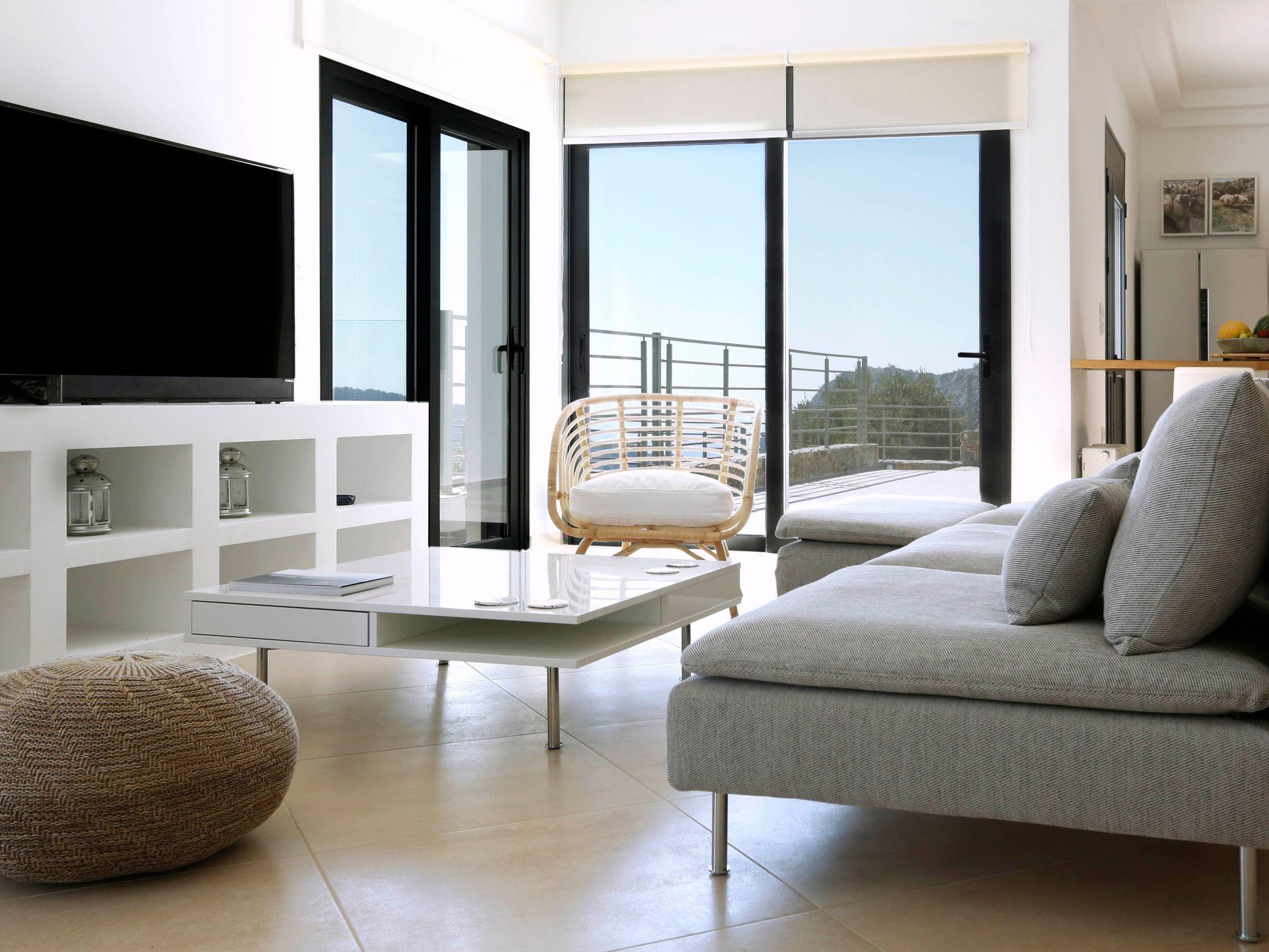 The architecture of the Villa is harmonically combined with that of the traditional village of Vrachasi, as stone is beautifully combined with modern touches. The exterior is well blended with the green olive groves that surround the estate and the absolute-blue color of the salt-water swimming pool offer an unparallel aesthesis of tranquility. The eco-friendly cleaning procedure of the pool safeguards a natural pool enjoyment every single day and the wooden deck, furnished with sunbeds and umbrellas will make your stay an absolute day and night pleasure.The luxurious, yet minimalistic interior, with spacious rooms and lounge areas, is decorated with stylish and design furniture and offer a like-home experience and coziness. The contemporary touches, with earthy colors and wooden surfaces, along with the state-of-the-art equipment and appliances provide a lovely feeling of contentment during your stay. Large windows allow abundance of natural light in the interior.