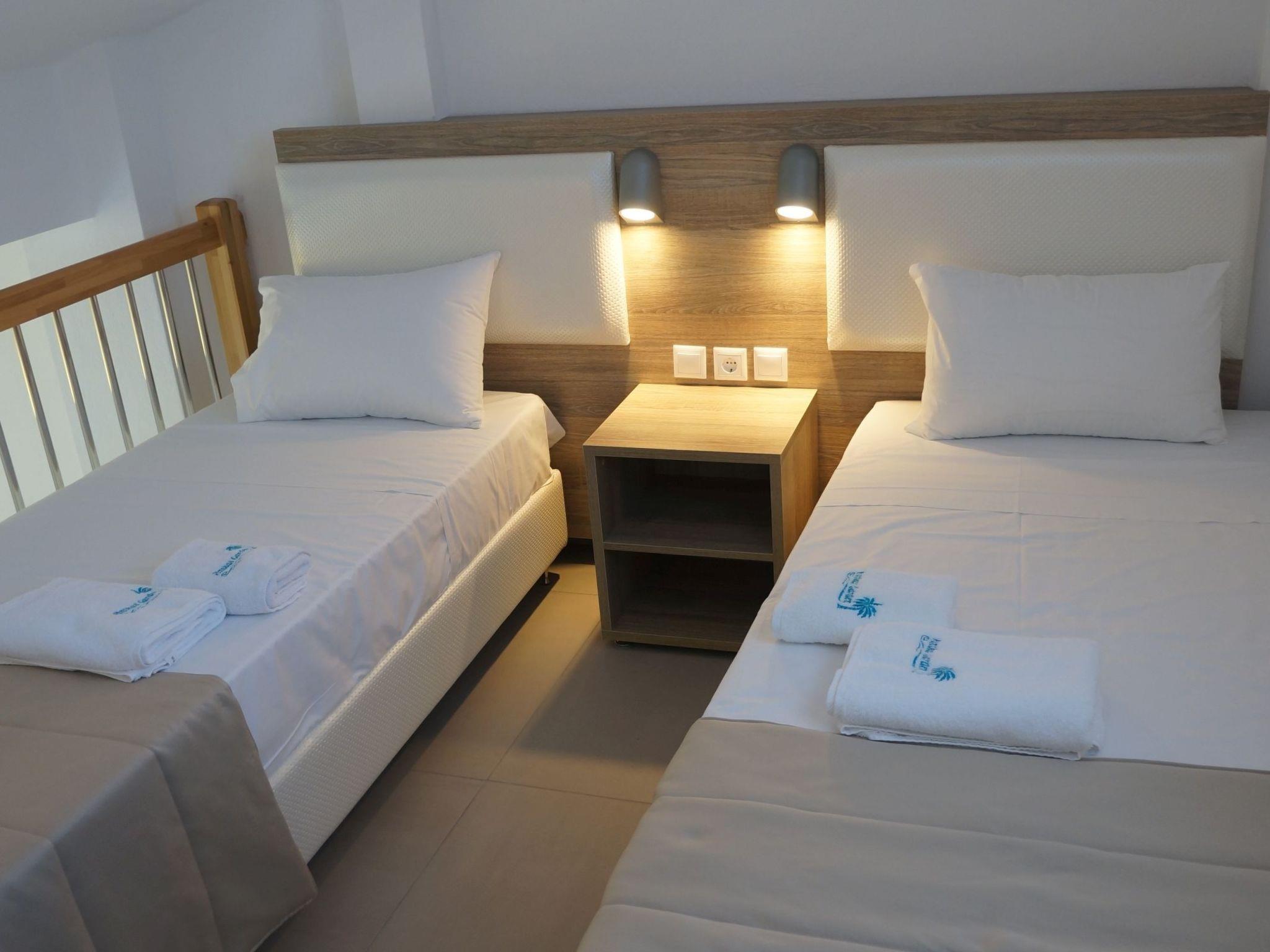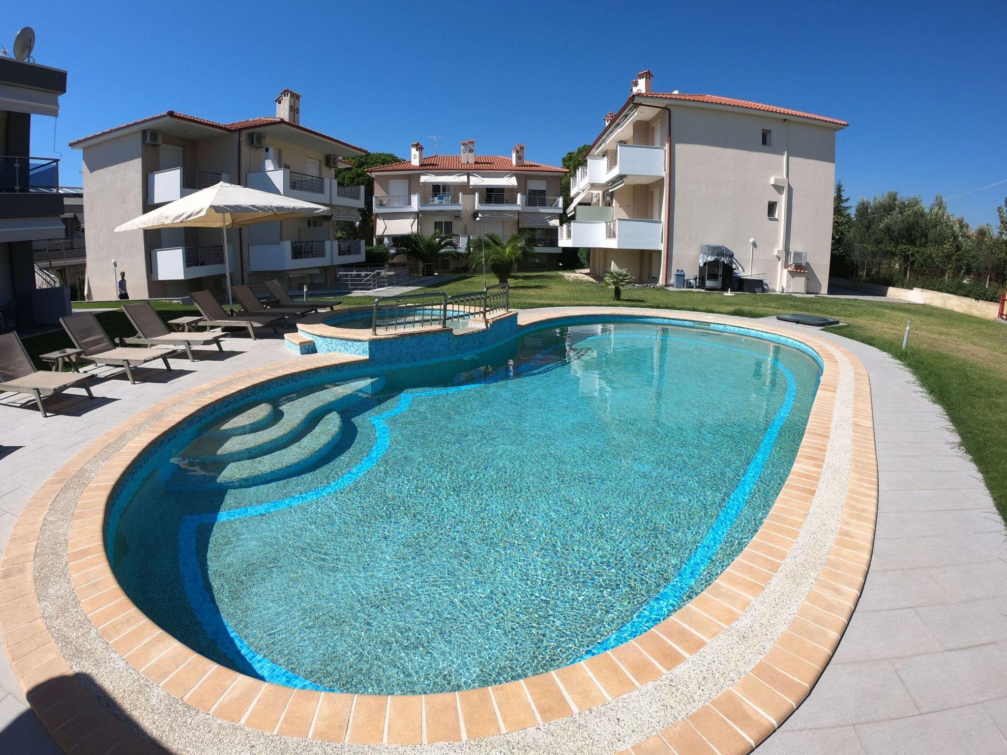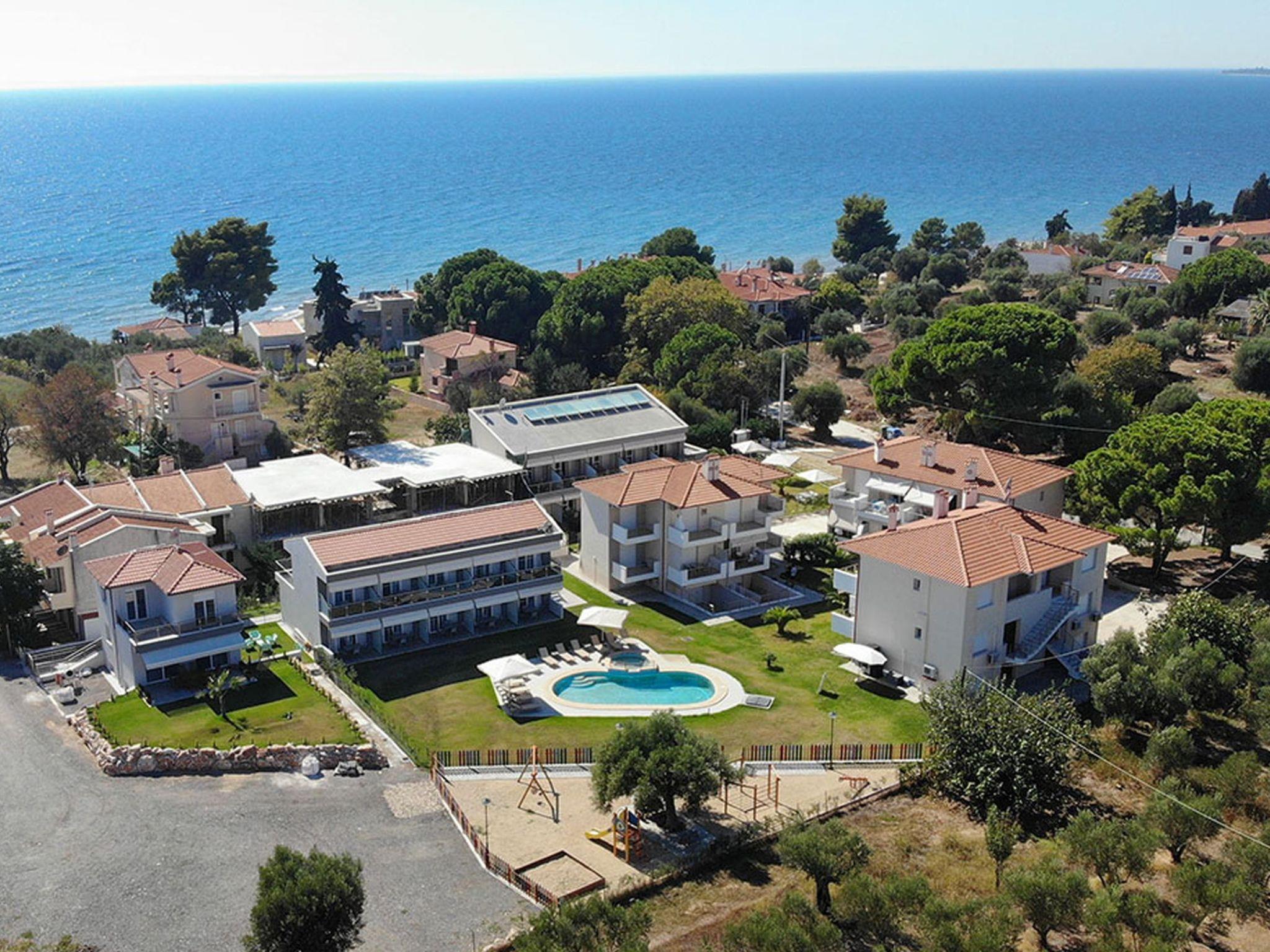 Family flat with shared swimming pool and children's playground In the middle of a green oasis, quietly located in Nikiti Beach, Sithonia, Chalkidiki are the flats with palm garden, swimming pool with baby pool, children's playground and private parking. The beach is 150 metres away. The marina is 600 metres away, as are tavernas, supermarkets, cafes, boutiques and all the entertainment you need. The flats are family-friendly and are located away from the main traffic, yet within easy reach of the main road.