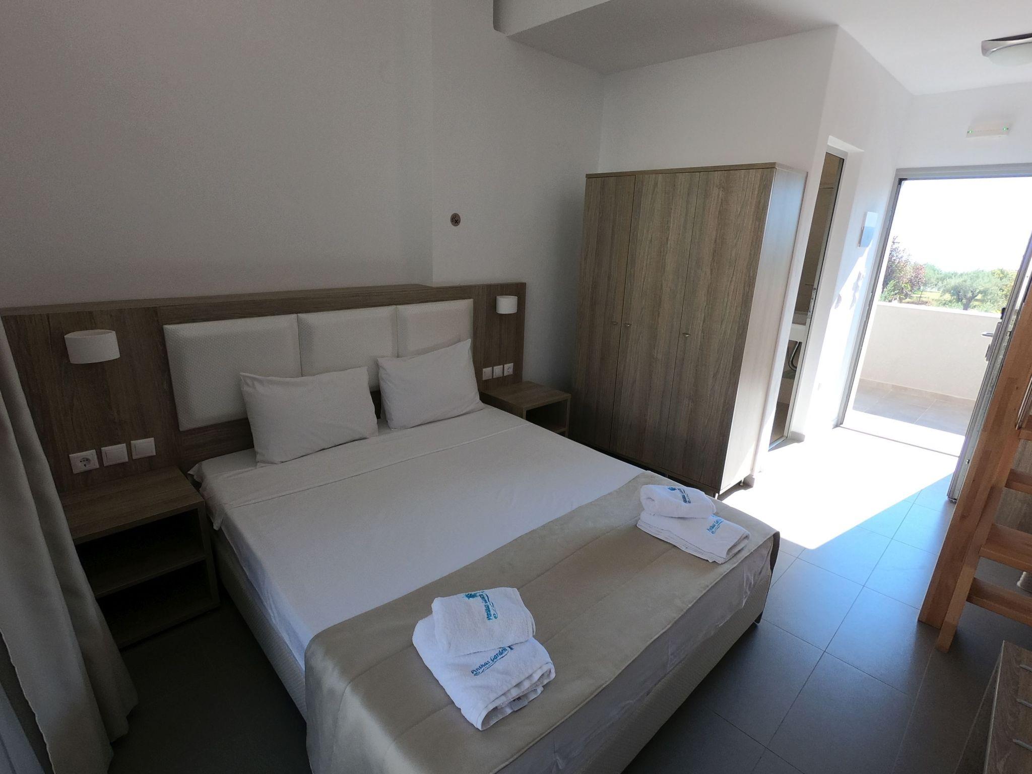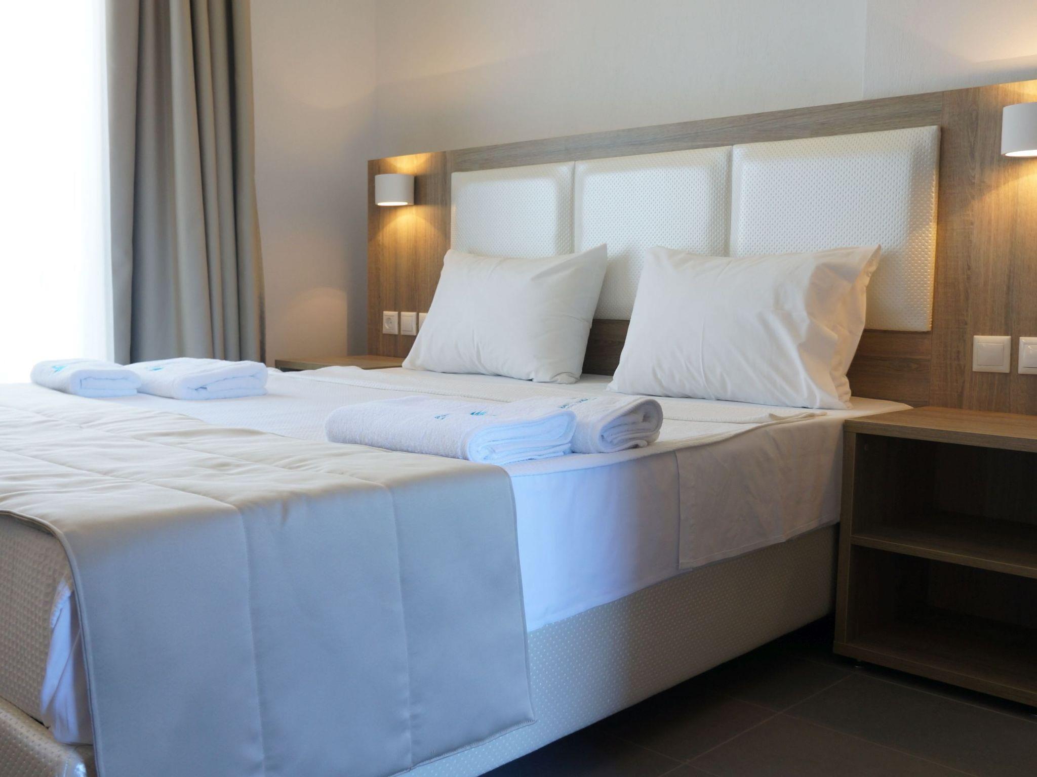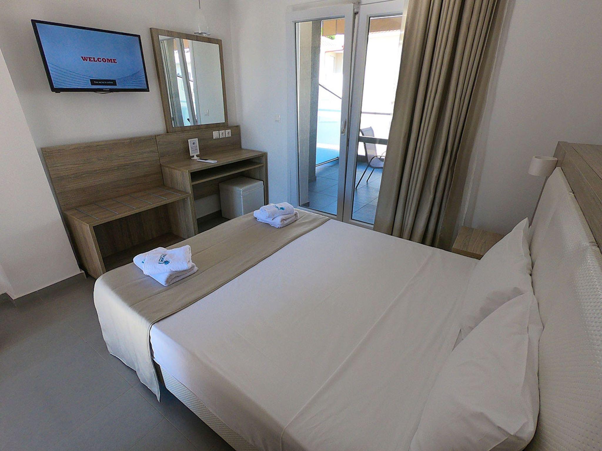 Family flat with shared swimming pool and children's playground In the middle of a green oasis, quietly located in Nikiti Beach, Sithonia, Chalkidiki are the flats with palm garden, swimming pool with baby pool, children's playground and private parking. The beach is 150 metres away. The marina is 600 metres away, as are tavernas, supermarkets, cafes, boutiques and all the entertainment you need. The flats are family-friendly and are located away from the main traffic, yet within easy reach of the main road.