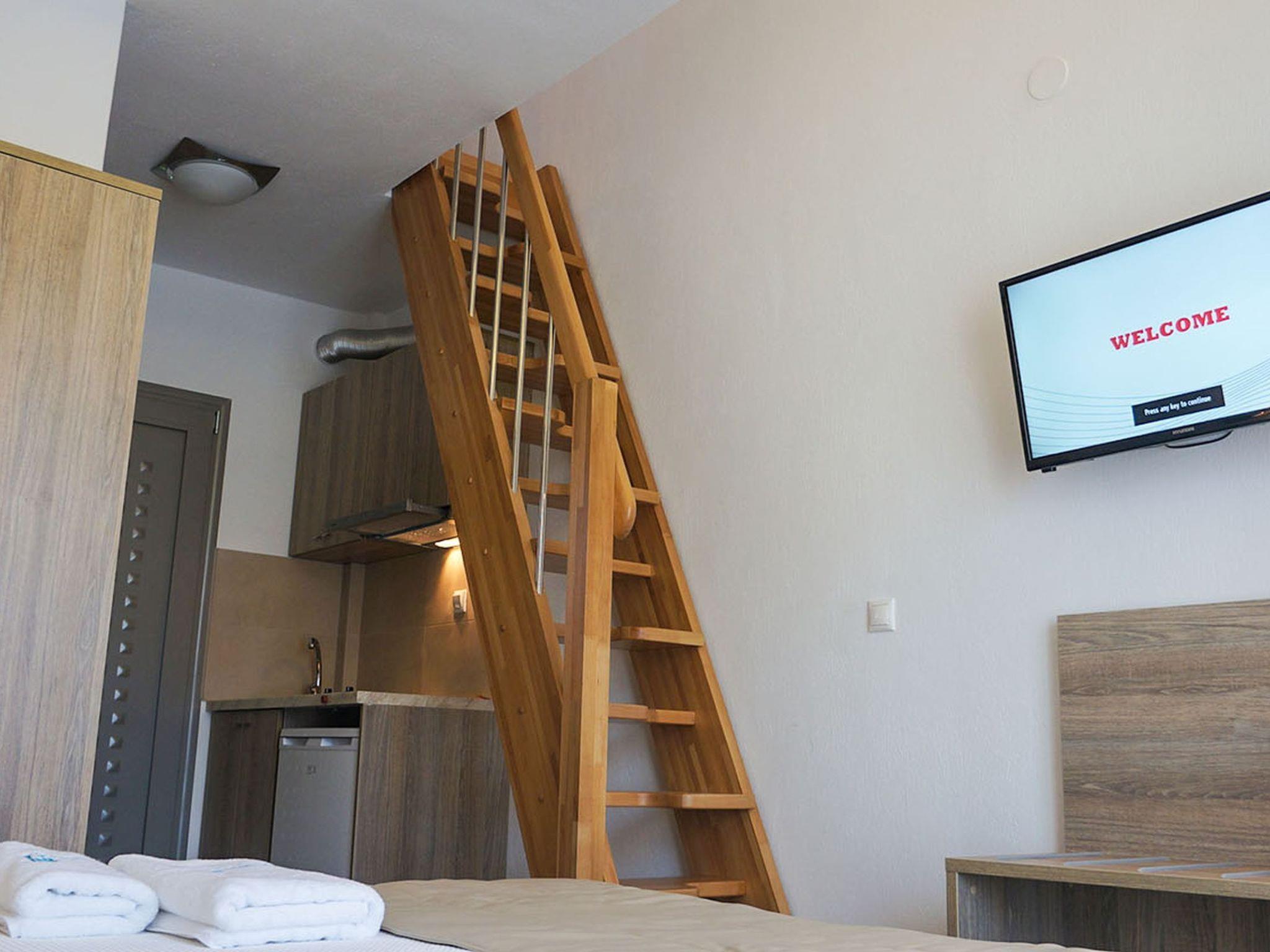 The lofts on the 1st floor consist of a bedroom with double bed and 2 chests of drawers, large balcony with table and 4 chairs and clothes horse, fully equipped kitchenette, wardrobe, desk and satellite TV. The gallery contains 2 single beds with chest of drawers. The bathroom is equipped with toilet, large washbasin, shower cubicle, hairdryer, towel rack and toiletries. All lofts have a low-noise inverter air conditioning system, satellite TV with channels in your language and high-speed WiFi. The entrance doors are fitted with security locks.
