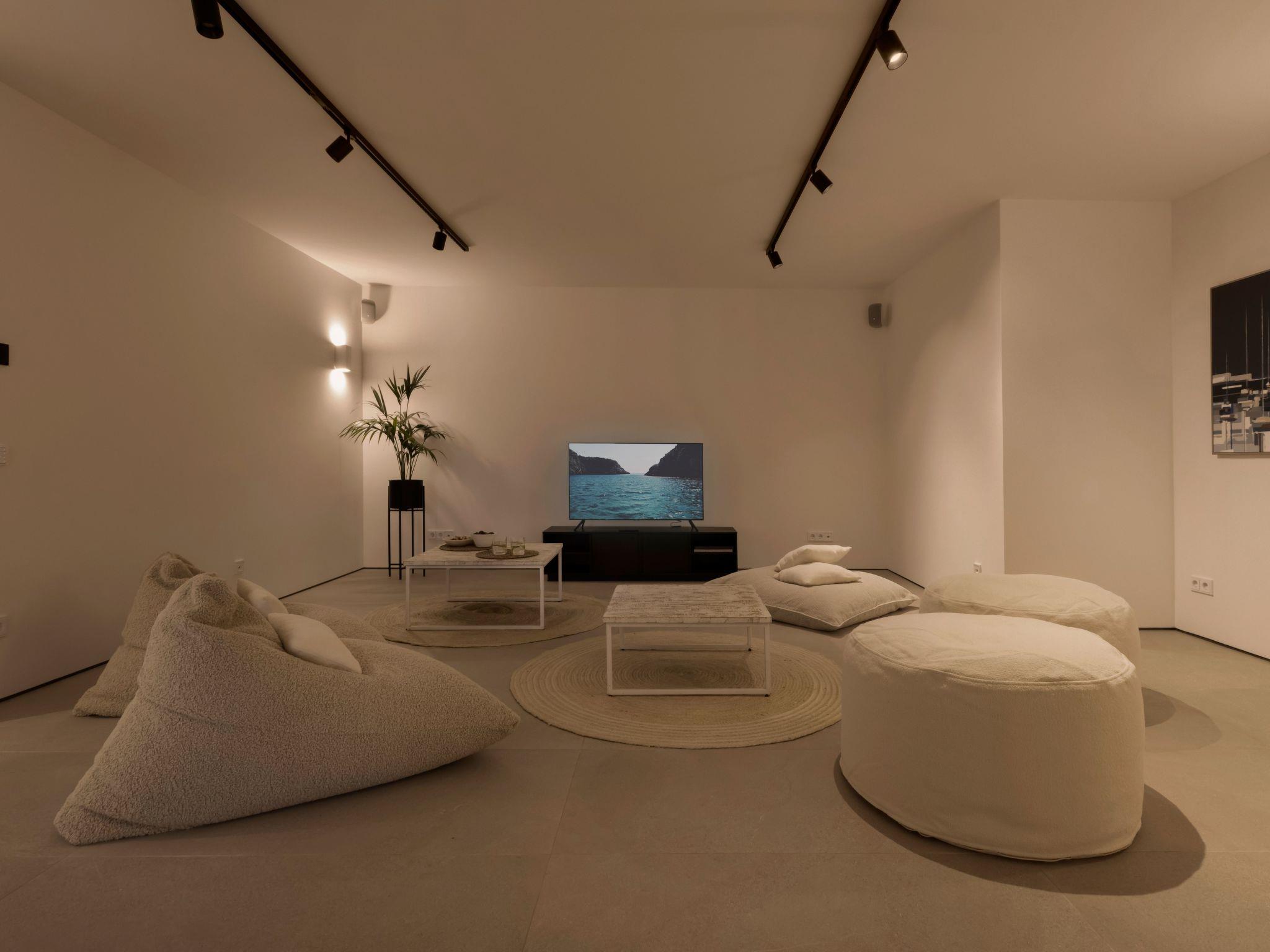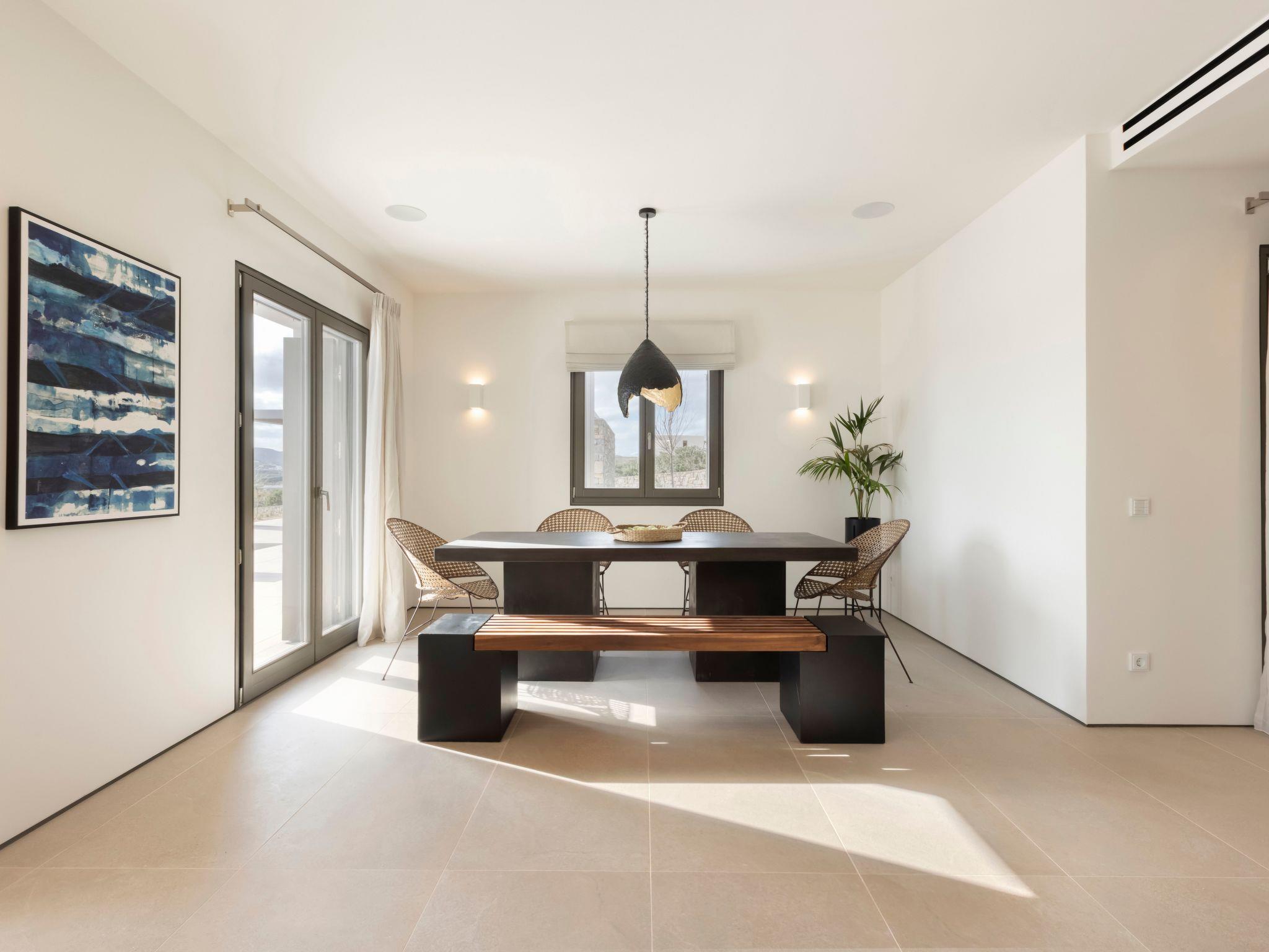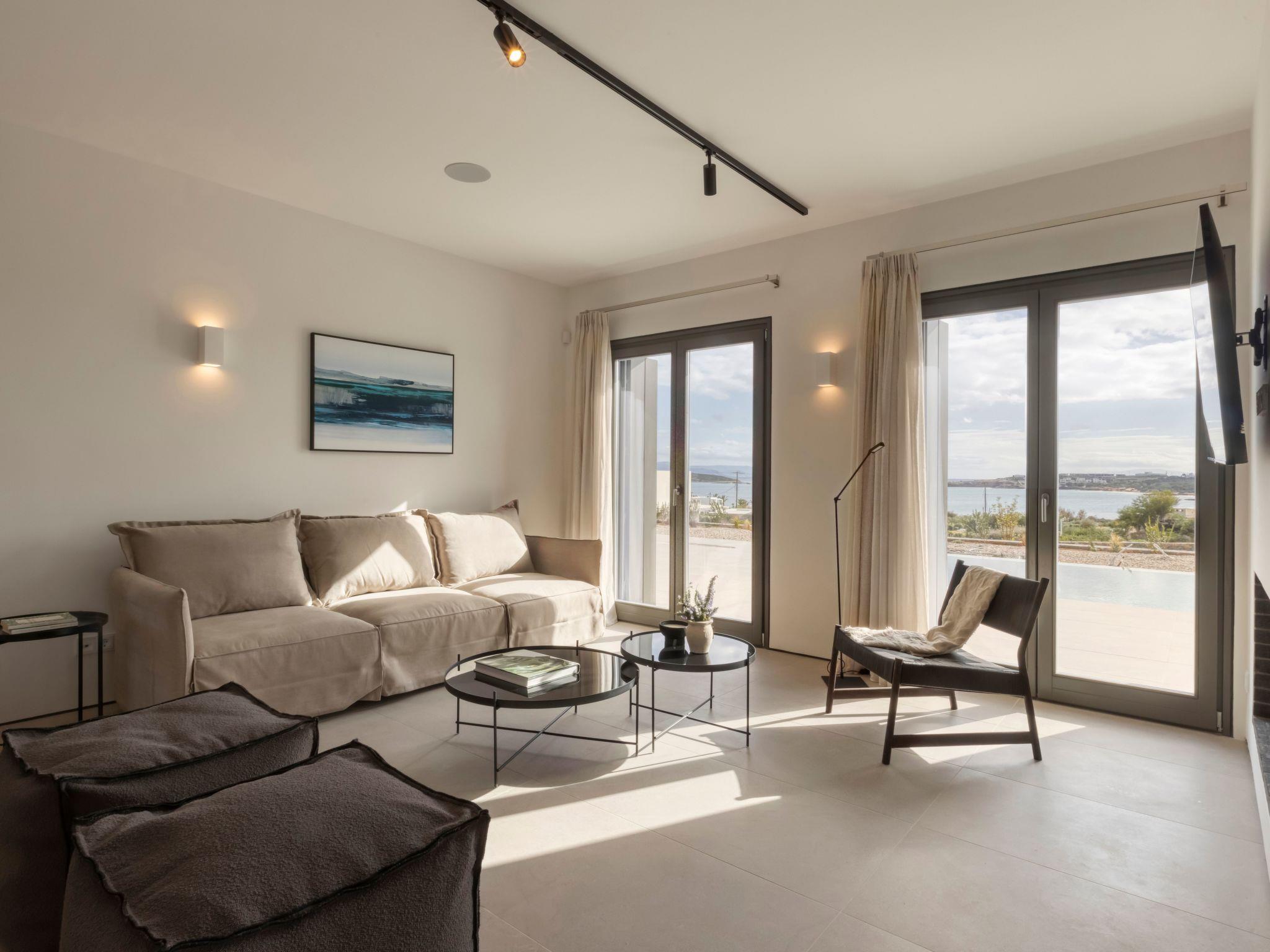 The exterior of the villa is nothing short of spectacular, featuring a private veranda that leads to a breathtaking infinity pool. The pool area invites guests to unwind with its panoramic views and seamless integration with the natural beauty of Paros. The design echoes the essence of island living, with outdoor spaces that celebrate the joy of the open air, making every moment spent outside unforgettable.