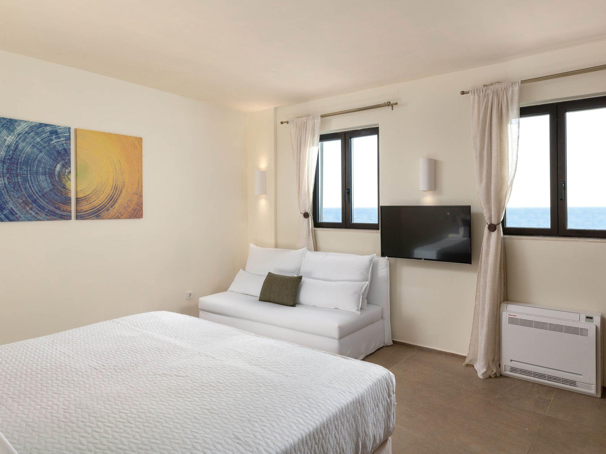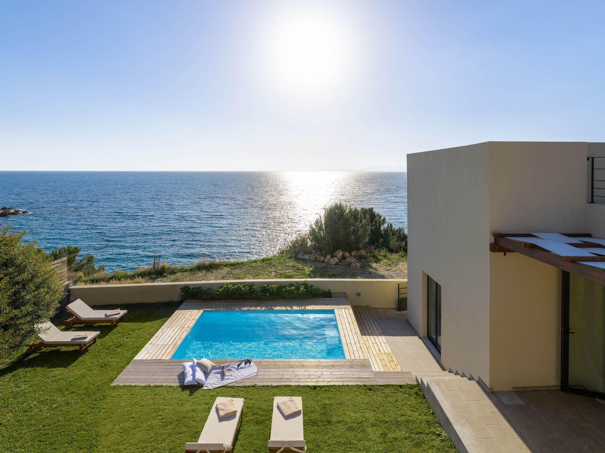 This elegant, tranquil beachfront Villa is set at a hill of Pefki. It offers an exquisite private swimming pool, surrounded by a perfect panoramic view of the island’s emerald waters. There’s an easy access to the sea at a walking distance. Also, the entire coastline at this location is worth visiting. South key Villa conveniently accommodates up to 7 guests. This villa is a perfect getaway offering absolute privacy and a great holiday experience in Rhodes. Set in a beachfront hill with dense pine trees, right off a small seaside village and only a few kilometers from the town of Lindos this villa provides the ideal setting for the most relaxed holidays. The villa has 3 bedrooms, 2 of them with a double bed and one with two single beds, each bedroom has a single sofa bed. The modern high quality furnishing, the minimal decorative approach and the ample living space compose a warm indoor environment that will immediately make you feel welcome and at home. The living room is particularly inviting, with plenty of free space to use as you please. There is a flat screen with satellite channels and free Wi-Fi throughout the property. The kitchen is fully equipped to accommodate your culinary habits, as well as your experiments with local products and recipes. There are 2 bathrooms with shower.
