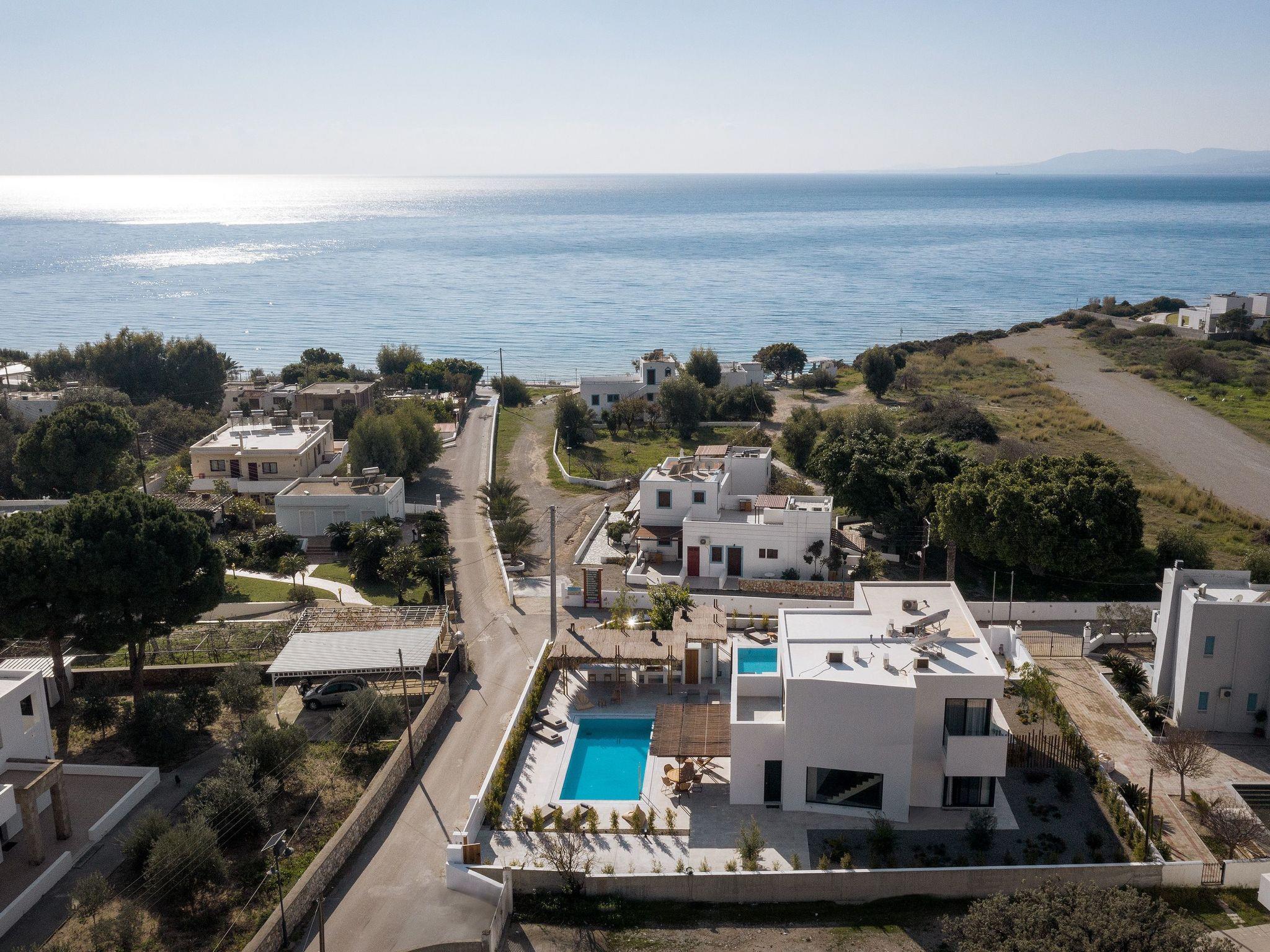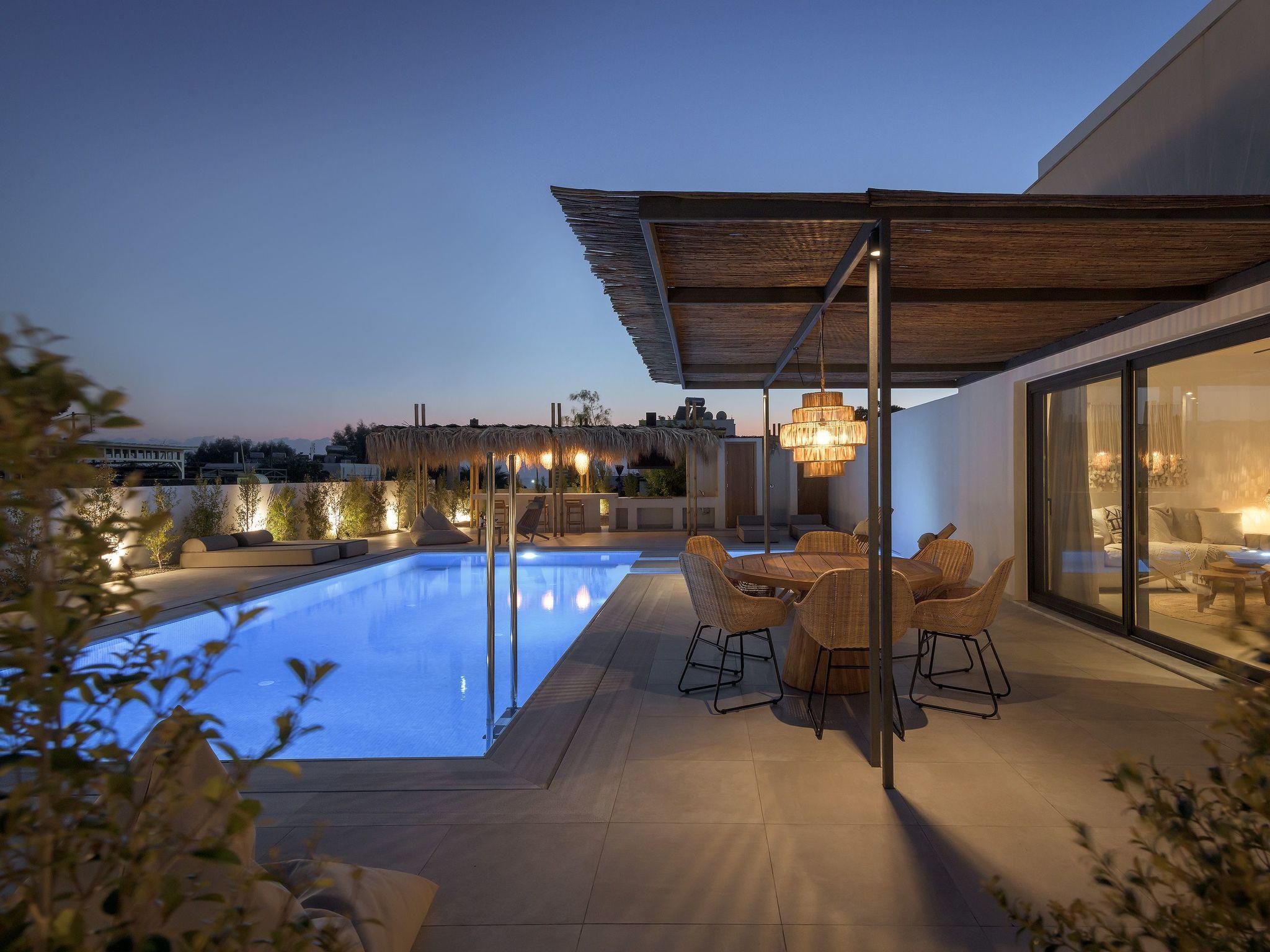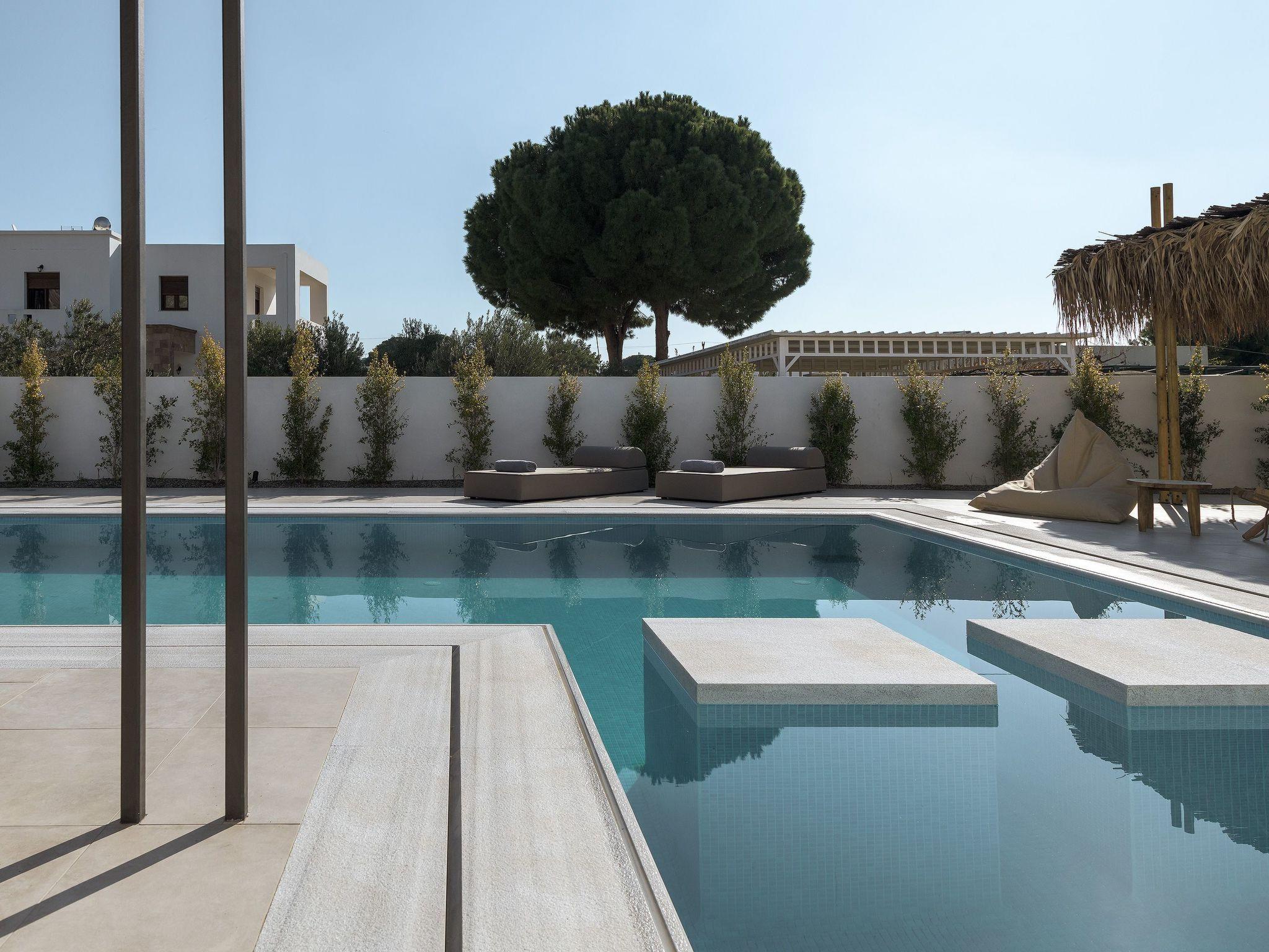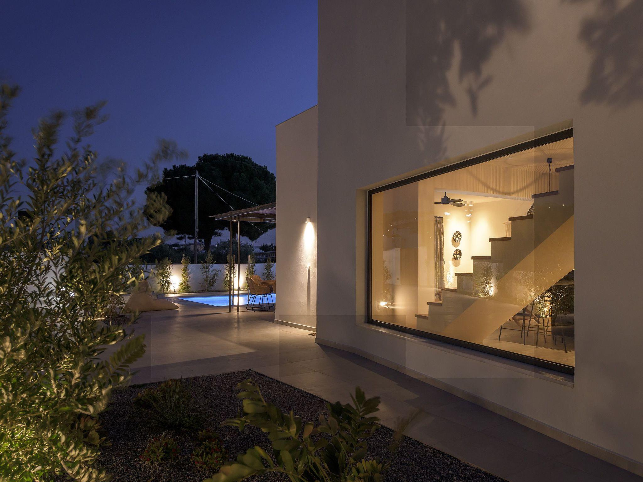 Eva Villa features 3 wonderful bedrooms with ensuite bathrooms and beautiful balconies, some of them offer a sea view. Two of the bedrooms have double beds and the other one has 2 single beds, all of them are fully air-conditioned. The modern living room, along with a siting area, combines luxurious comforts with a clear sense of home. The care that was put to the design of the property was meant to create a welcoming ambience with a warm modern décor. The classy kitchen is fully equipped with every amenity you may need and is complimented by the BBQ facility outside, for you to indulge in culinary. Guests can enjoy free Wi-Fi access throughout the property. Outdoors, you will find the amazing private swimming pool along with its stylish sunbeds. There, you can enjoy the summer sun; without doubt you’ll get the island feeling. The surrounding of the tastefully designed pool is quite pleasant, with a sitting area allowing you to enjoy any meal with your loved ones.
