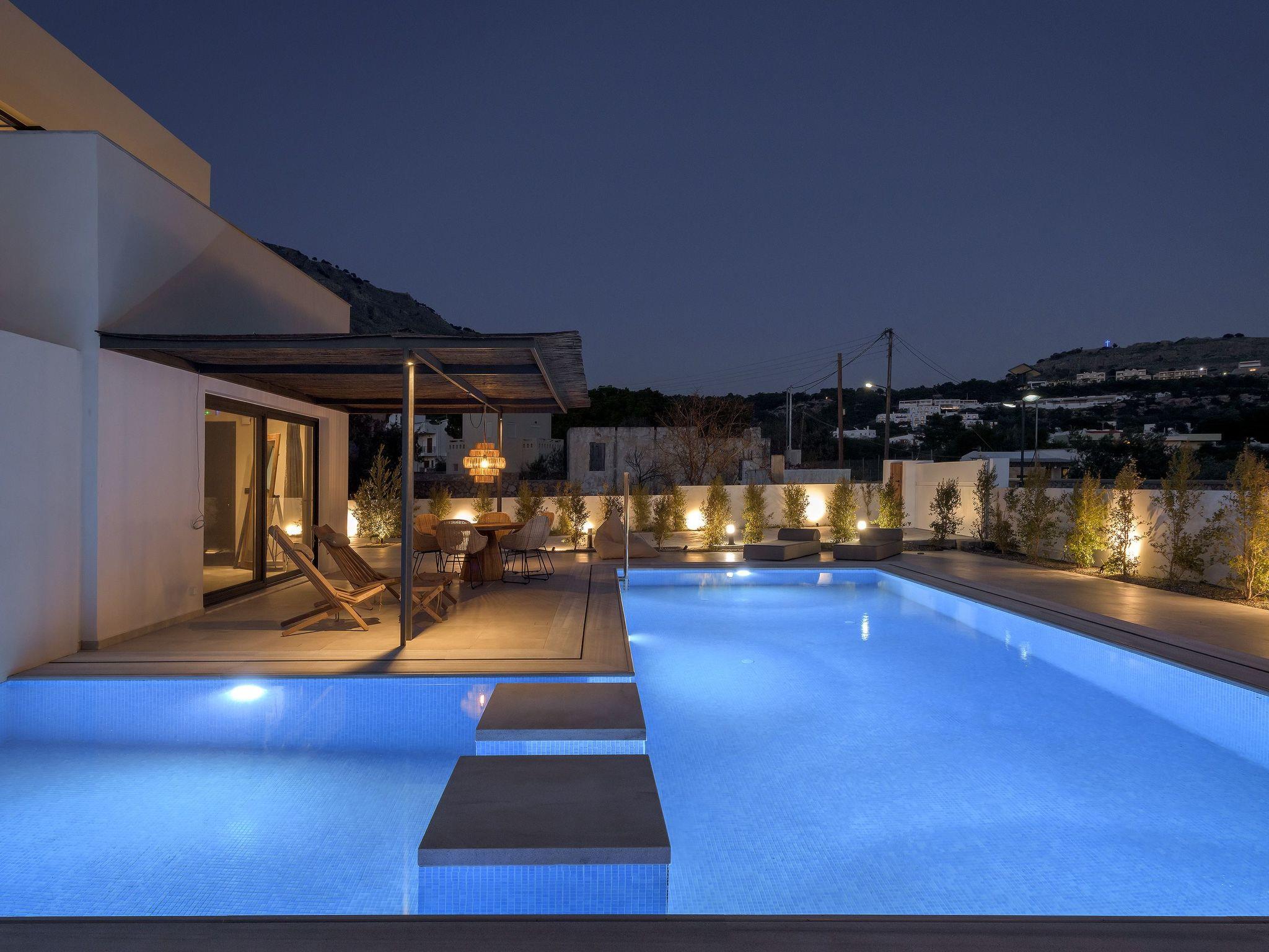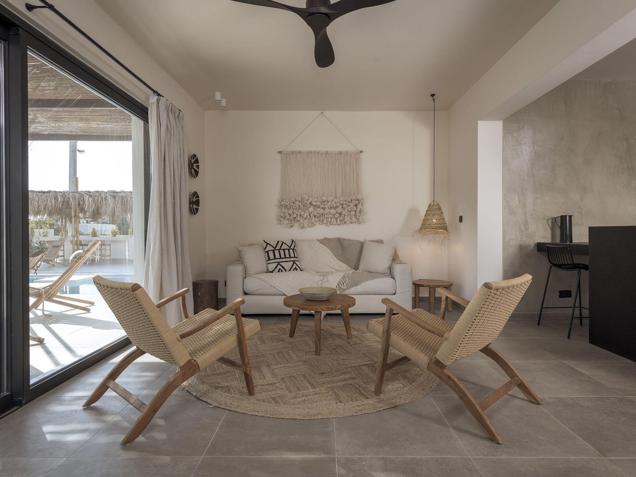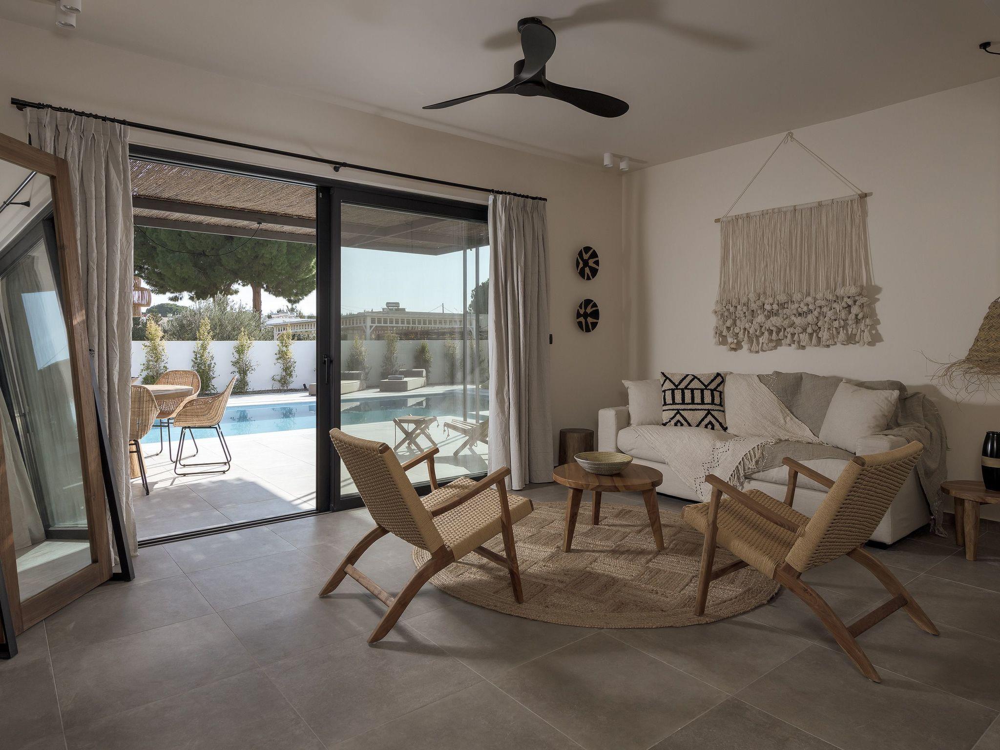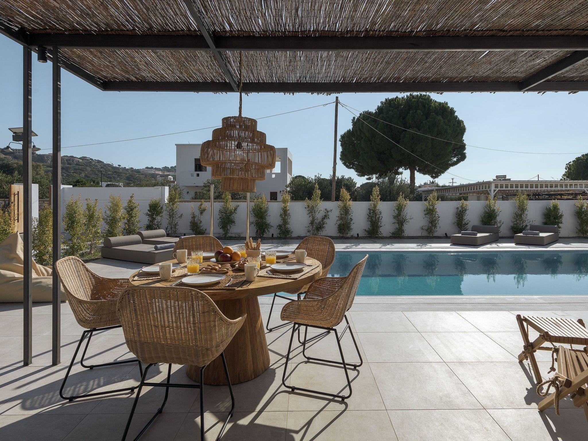 Eva Villa features 3 wonderful bedrooms with ensuite bathrooms and beautiful balconies, some of them offer a sea view. Two of the bedrooms have double beds and the other one has 2 single beds, all of them are fully air-conditioned. The modern living room, along with a siting area, combines luxurious comforts with a clear sense of home. The care that was put to the design of the property was meant to create a welcoming ambience with a warm modern décor. The classy kitchen is fully equipped with every amenity you may need and is complimented by the BBQ facility outside, for you to indulge in culinary. Guests can enjoy free Wi-Fi access throughout the property. Outdoors, you will find the amazing private swimming pool along with its stylish sunbeds. There, you can enjoy the summer sun; without doubt you’ll get the island feeling. The surrounding of the tastefully designed pool is quite pleasant, with a sitting area allowing you to enjoy any meal with your loved ones.