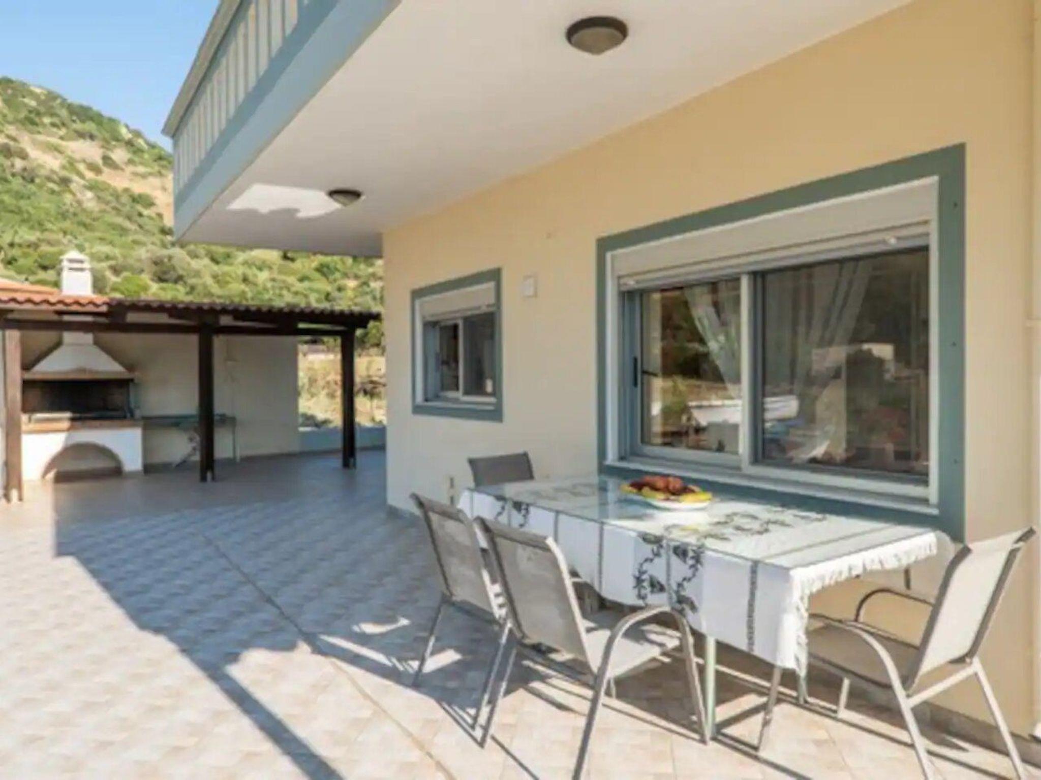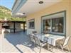 Large terrace with outside table, sunbeds, BBQ, and parking behind the house