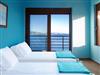 Bathed in Mediterranean sunlight, the interiors showcase tall glass openings, soft earth tones, and natural wood details that create a warm yet modern aesthetic. Every space invites the eye toward the shimmering Ionian horizon, blurring the boundary between indoors and outdoors.